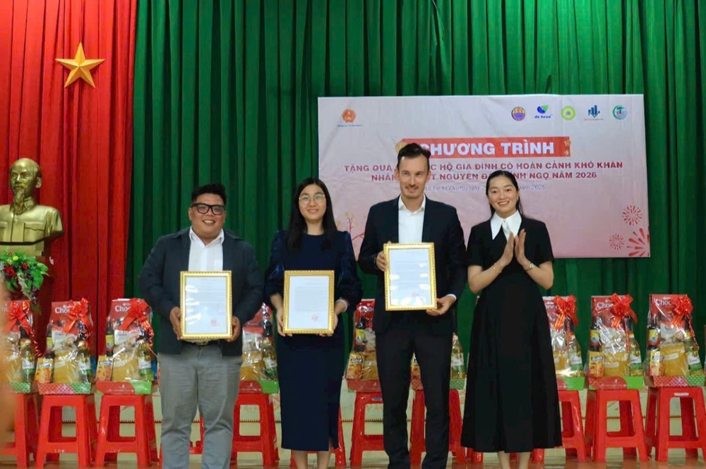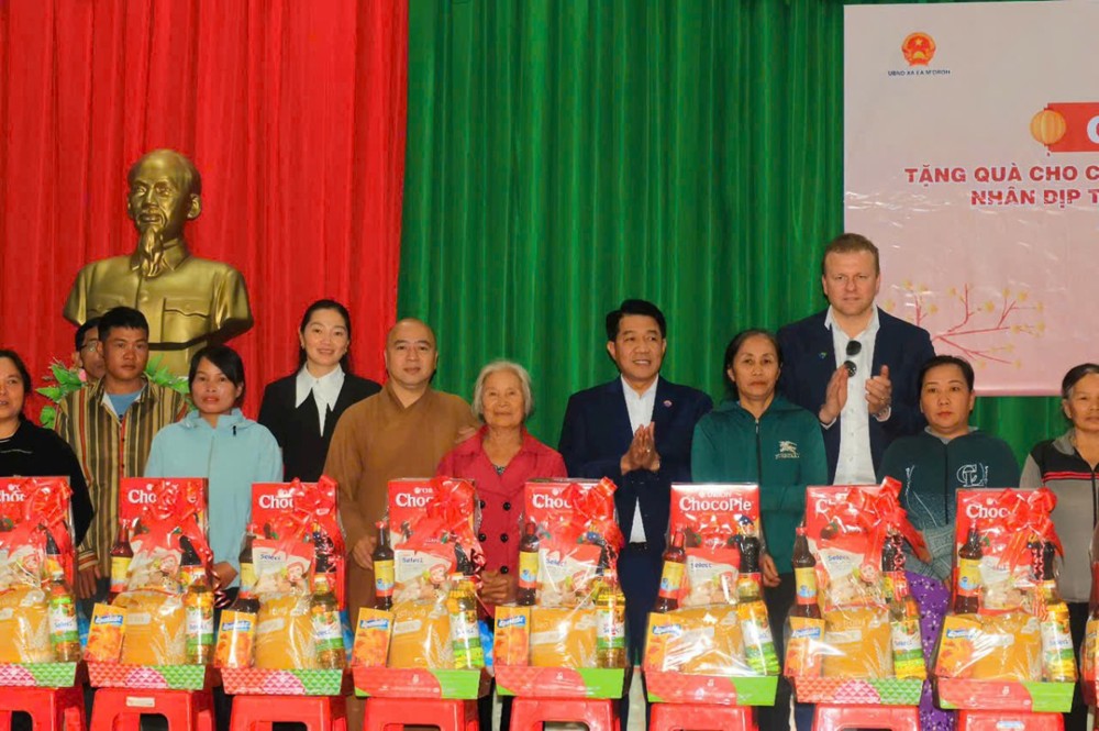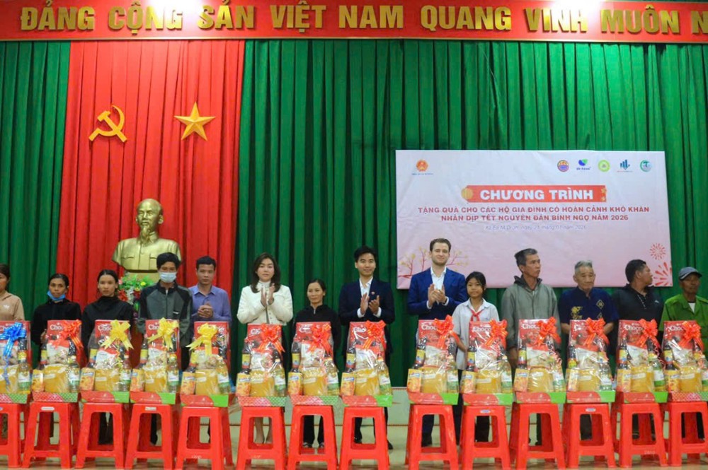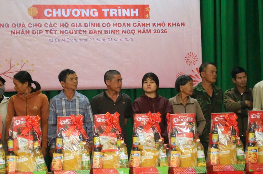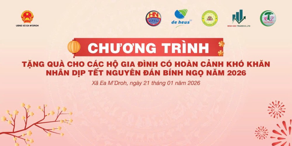 PSO - Chiều ngày 21/01/2026, tại Trụ sở Ban Chỉ huy Quân sự xã Ea M’Droh, UBND xã Ea M’Droh đã phối hợp với Tập đoàn De Heus Việt Nam & Châu Á, Tập đoàn Hùng Nhơn Việt Nam cùng các doanh nghiệp đồng hành trang nghiêm tổ chức chương trình trao tặng quà Tết Bính Ngọ 2026 cho các hộ gia đình có hoàn cảnh khó khăn trên địa bàn xã, góp phần mang mùa Xuân yêu thương đến với bà con nhân dân.