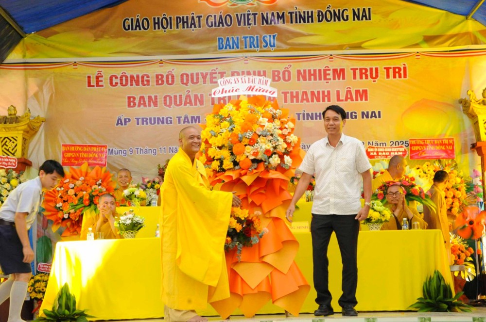Về đại diện lãnh đạo các cấp Chính quyền có Trung tá Vũ Công Dũng – Đội trưởng đội An ninh Tôn giáo, phòng An ninh Nội địa Công an tỉnh Đồng Nai; Đại ủy Phạm Xuân Hoàng – Cán bộ An ninh Tôn giáo, phòng An ninh Nội địa Công an tỉnh Đồng Nai; ông Từ Đức Bình – Thường vụ Đảng ủy, Chủ tịch UBMTTQVN xã Bàu Hàm; ông Đỗ Văn Sáng – Thường vụ Đảng ủy, Phó Chủ tịch UBND xã Bàu Hàm; cùng đại diện các cấp lãnh đạo Chính quyền tỉnh Đồng Nai, Sở Dân tộc và Tôn giáo tỉnh Đồng Nai, phòng PA 02 Công an tỉnh Đồng Nai; đại diện các cấp lãnh đạo xã Bàu Hàm và đông đảo Phật tử tham dự.