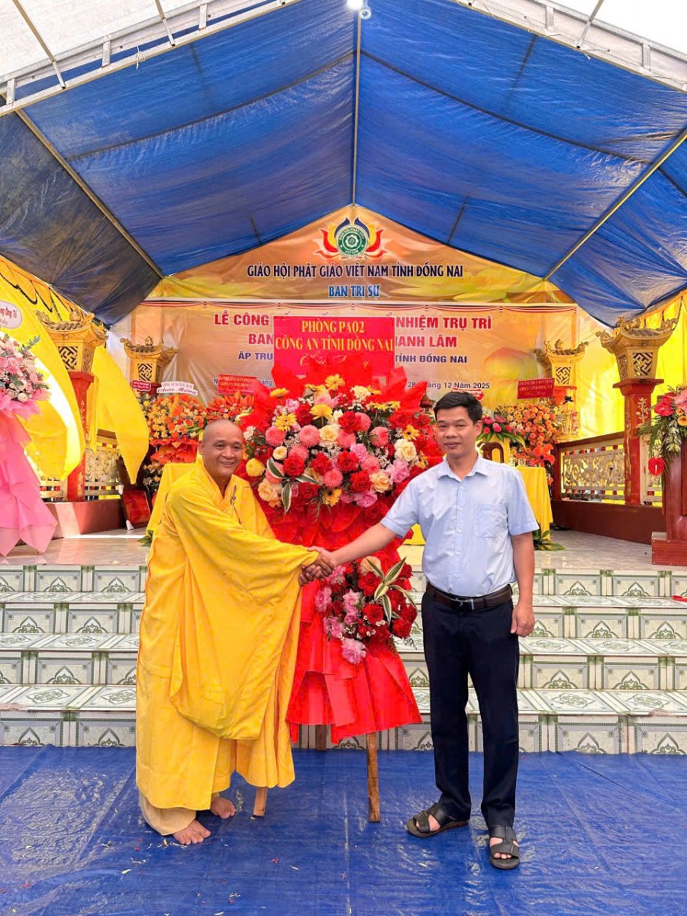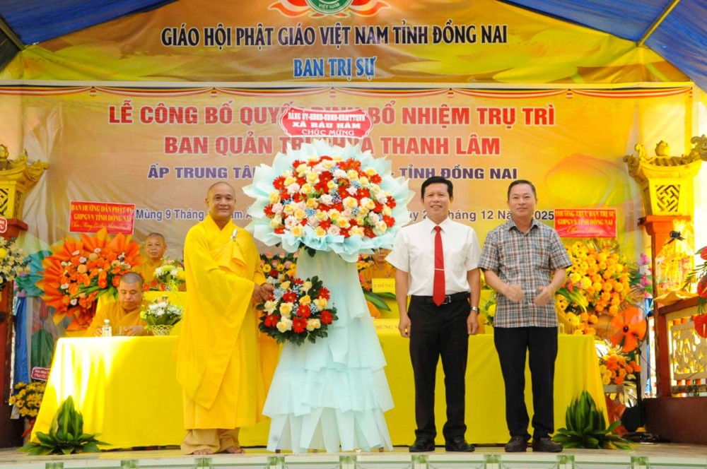 Sau cùng, Đại đức Tân trụ trì đã đón nhận nhiều lẵng hoa chúc mừng của Ban Trị sự Phật giáo tỉnh Đồng Nai, các cấp lãnh đạo Chính quyền sở tại và những lời chúc mừng của chư Tôn đức Trụ trì là bạn đồng học, đồng tu trong tình pháp lữ đồng môn.