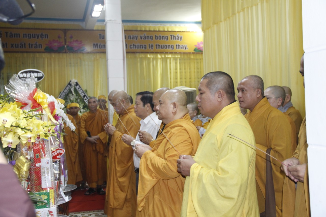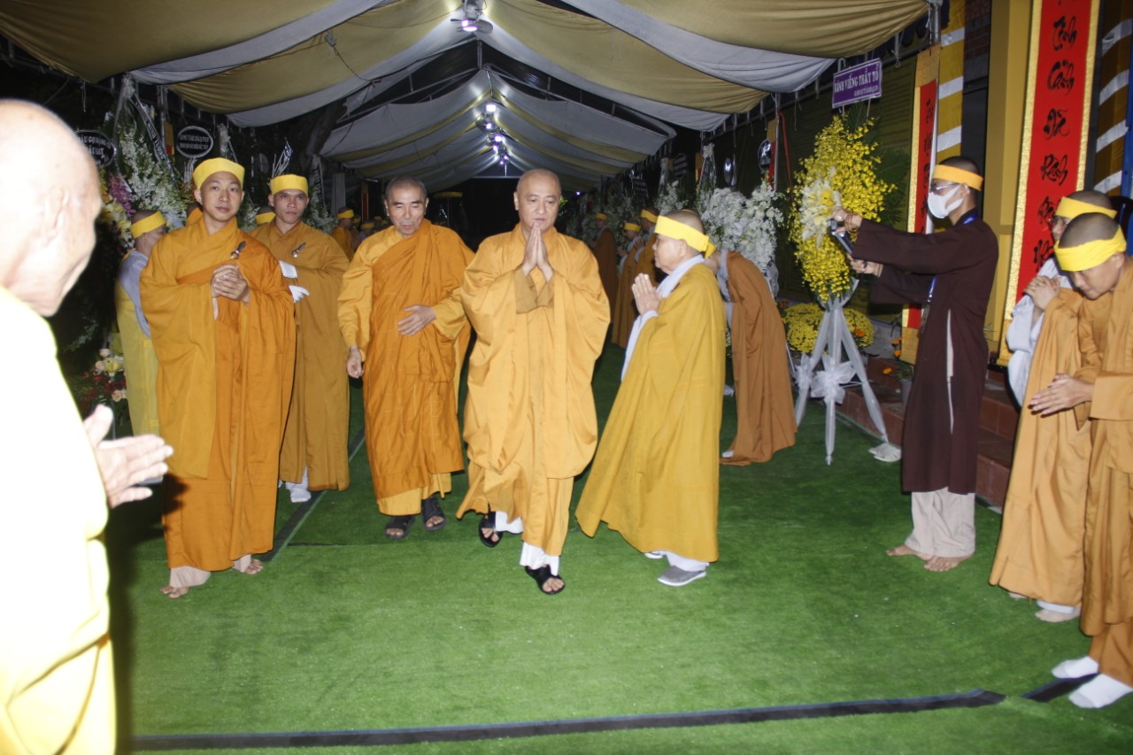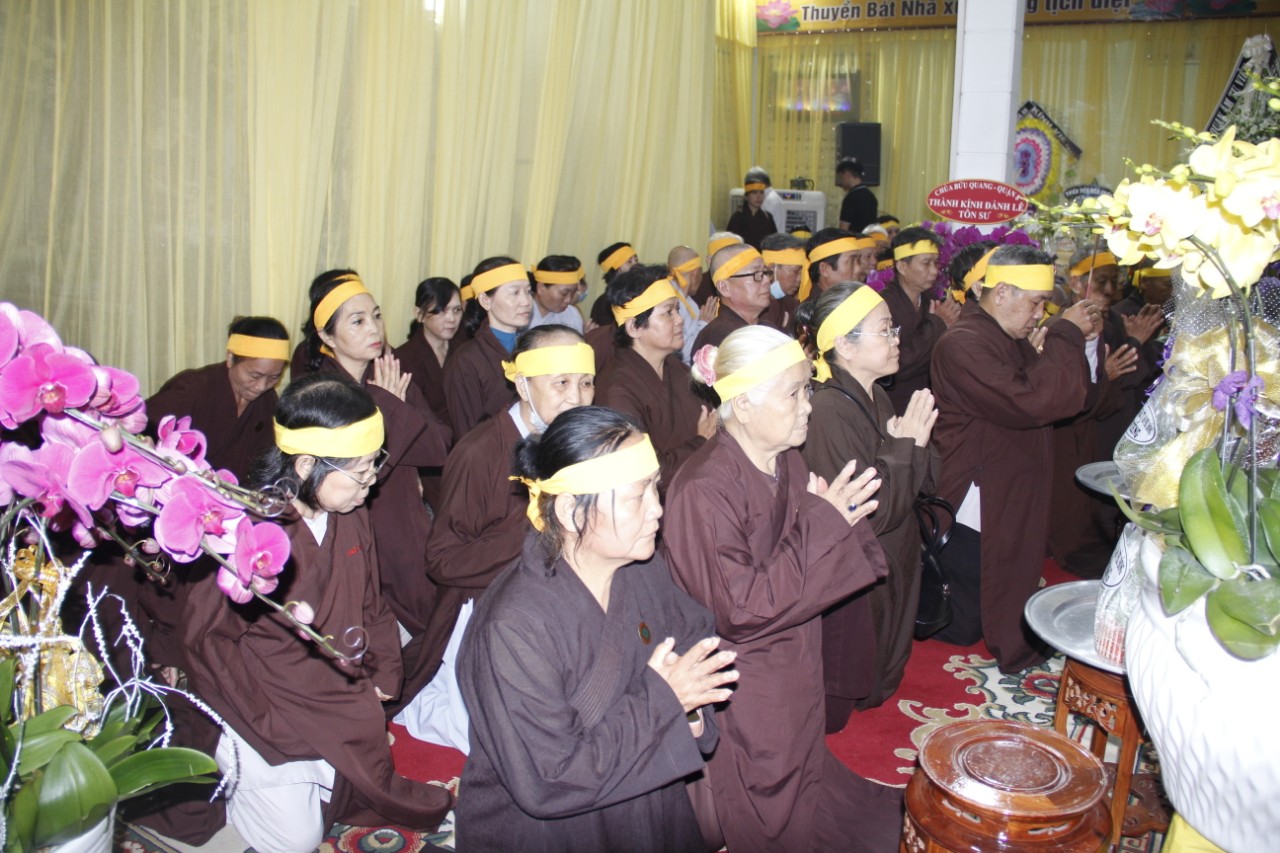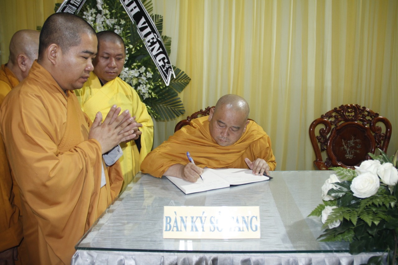 Tháp tùng phái đoàn có: HT.Thích Huệ Trí – Ủy viên (UV) Thường trực Hội đồng Trị sự (HĐTS), Trưởng ban Pháp chế TƯ GHPGVN; HT.Thích Giác Liêm – UV Thường trực HĐTS, Phó Văn phòng 2 TƯGH; TT.Thích Phước Nguyên – Ủy viên Thường trực Hội đồng Trị sự, Phó Chánh Văn phòng 2 TƯGH; cùng chư Tôn đức Thường trực HĐTS, Văn phòng 2 TƯ đồng trở về kính viếng Giác linh cố Ni trưởng và thắp nén tâm hương tưởng niệm. Sau đó, các Phái đoàn hữu nhiễu kim quan và ký sổ tang lưu niệm.
