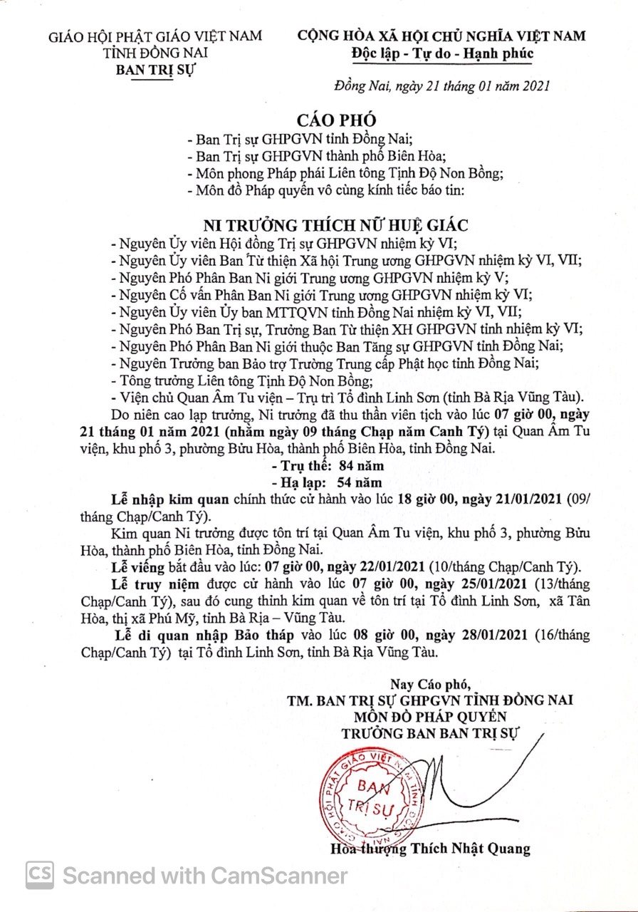 TM. BAN TRỊ SỰ GHPGVN TỈNH ĐỒNG NAI MÔN ĐỒ PHÁP QUYẾN TRƯỞNG BAN BAN TRỊ SỰ Đã ký Hòa thượng Thích Nhật Quang |