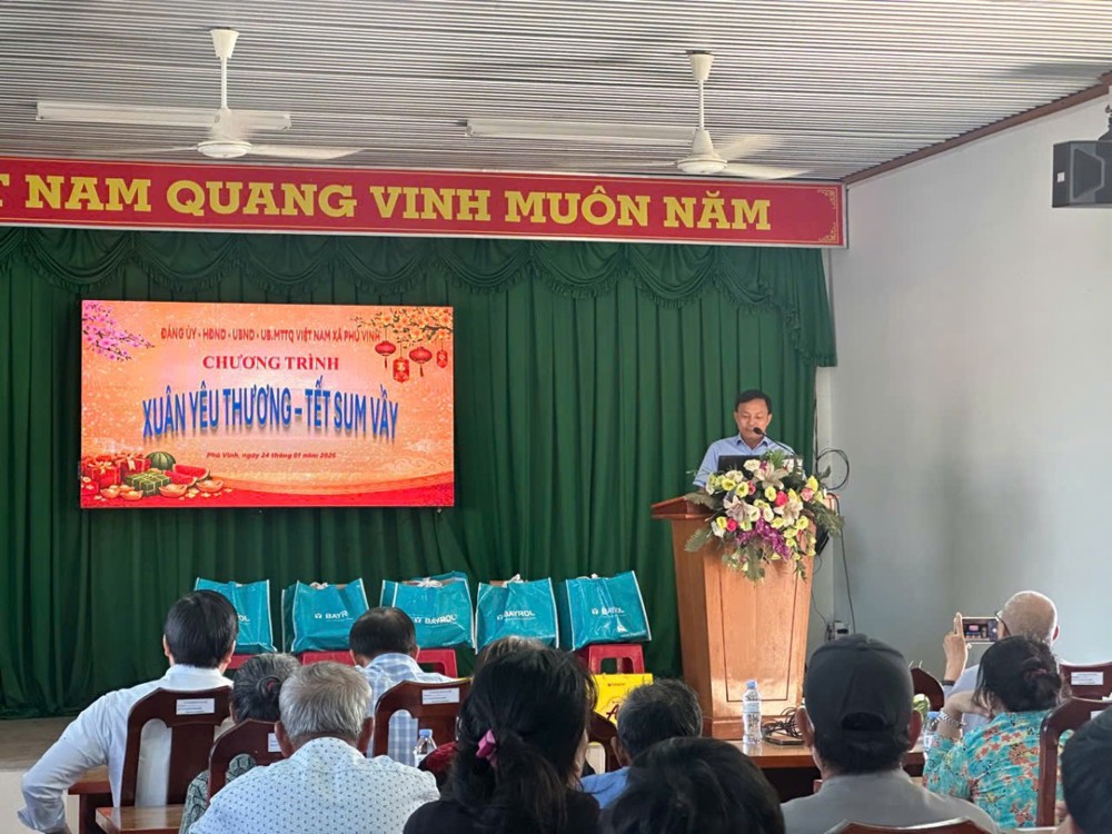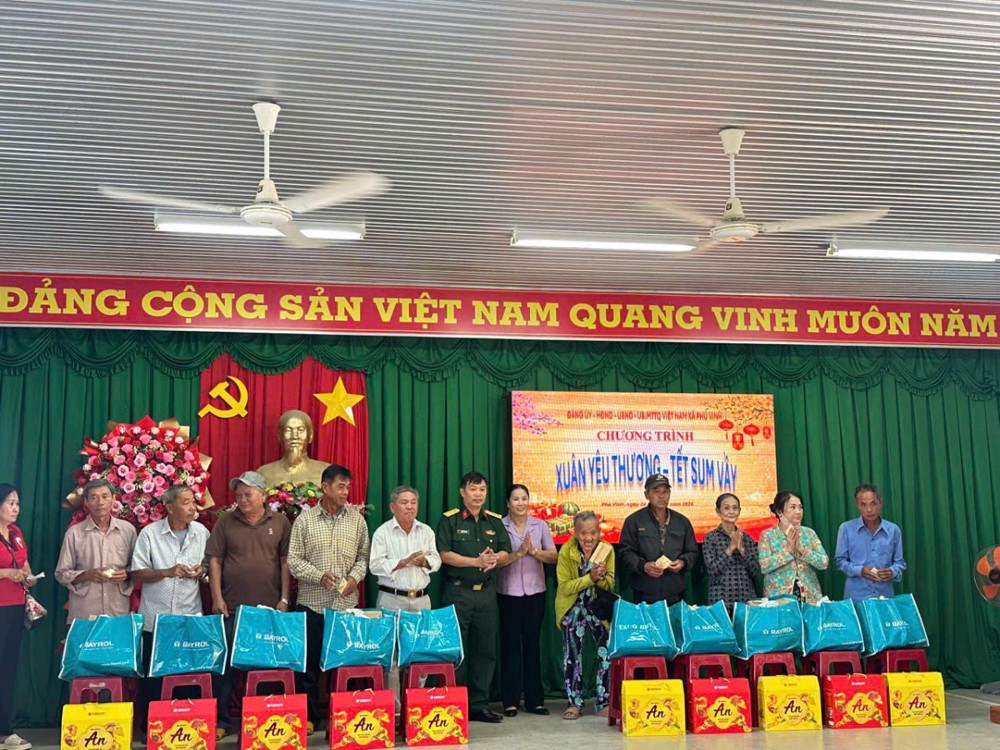 Tham dự buổi trao quà còn có đại diện lãnh đạo Đảng ủy, UBND, Ủy ban MTTQVN và các tổ chức chính trị – xã hội xã Phú Vinh, gồm: ông Nguyễn Tiến Ngọc – Phó Bí thư Thường trực Đảng ủy xã; ông Vũ Mạnh Dương – Ủy viên Thường vụ, Phó Chủ tịch UBND xã; bà Đỗ Thị Vân Thư – Ủy viên Thường vụ, Chủ tịch Ủy ban MTTQVN xã; ông Tẩy Cẩm Sáng – Ủy viên Thường vụ, Chỉ huy trưởng Ban Chỉ huy Quân sự xã; bà Lê Thị Huyền Trang – Đảng ủy viên, Phó Chủ tịch UBND xã; ông Dương Nguyễn Tiến Đạt – Đảng ủy viên, Trưởng Ban Xây dựng Đảng xã, cùng đại diện các ban ngành, đoàn thể địa phương.