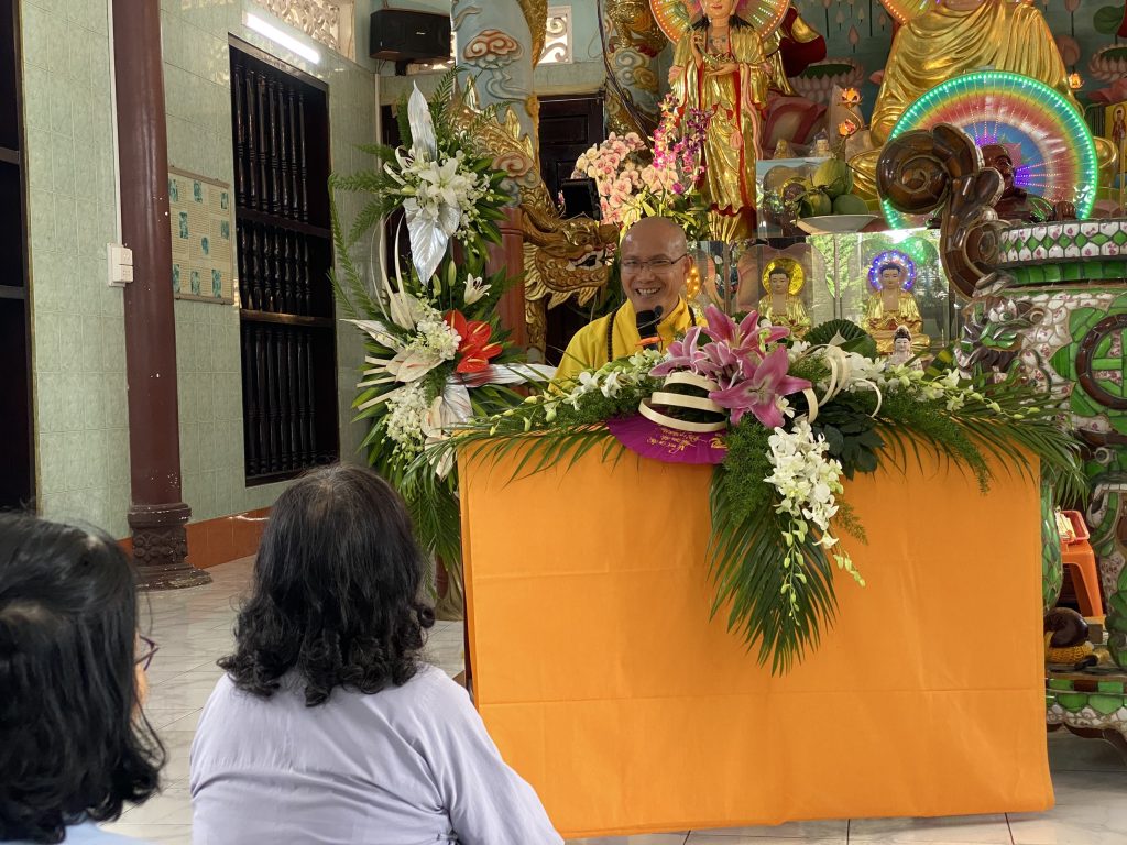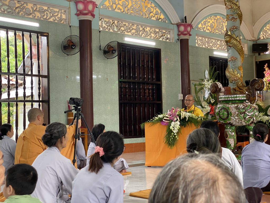 Sau phần nghi thức khai khoá niệm Phật, ĐĐ.Thích Thiện Hưng đã có buổi chia sẻ cho đại chúng chủ đề: “Chết có thật đáng sợ không”? Đại đức đã dẫn dụ những bài kinh trong tạng Nikaya có nội dung xung quanh việc Đức Thế Tôn dạy về quy luật của dòng đời, con người ai cũng theo quy luật của sanh, già, bệnh, chết. Hiện thực đã diễn ra trước mắt khi chứng kiến cảnh tang thương của đồng bào miền Trung bị ảnh hưởng bão lụt triền miên trong thời gian qua và dịch bệnh Covid hoành hành nhân loại là những minh chứng sống để hành giả nhận rõ sự việc. Đại đức đã nêu rõ tiến trình sinh diệt của đời người thông qua kinh tạng và cách giúp hành giả chuẩn bị cho mình hành trang khi ra đi, vì ai trong chúng ta cũng không tránh khỏi quy luật ấy.