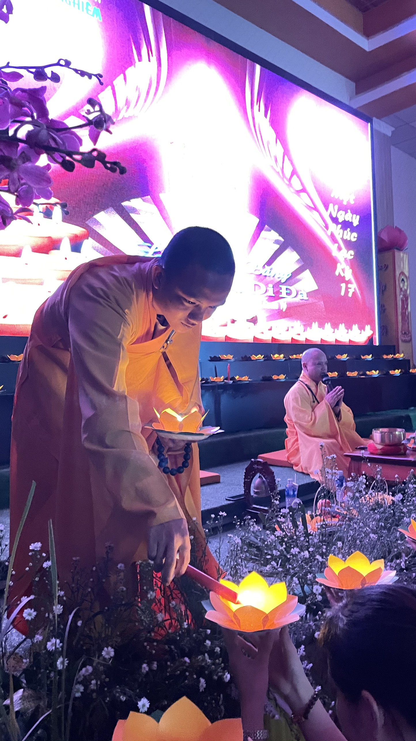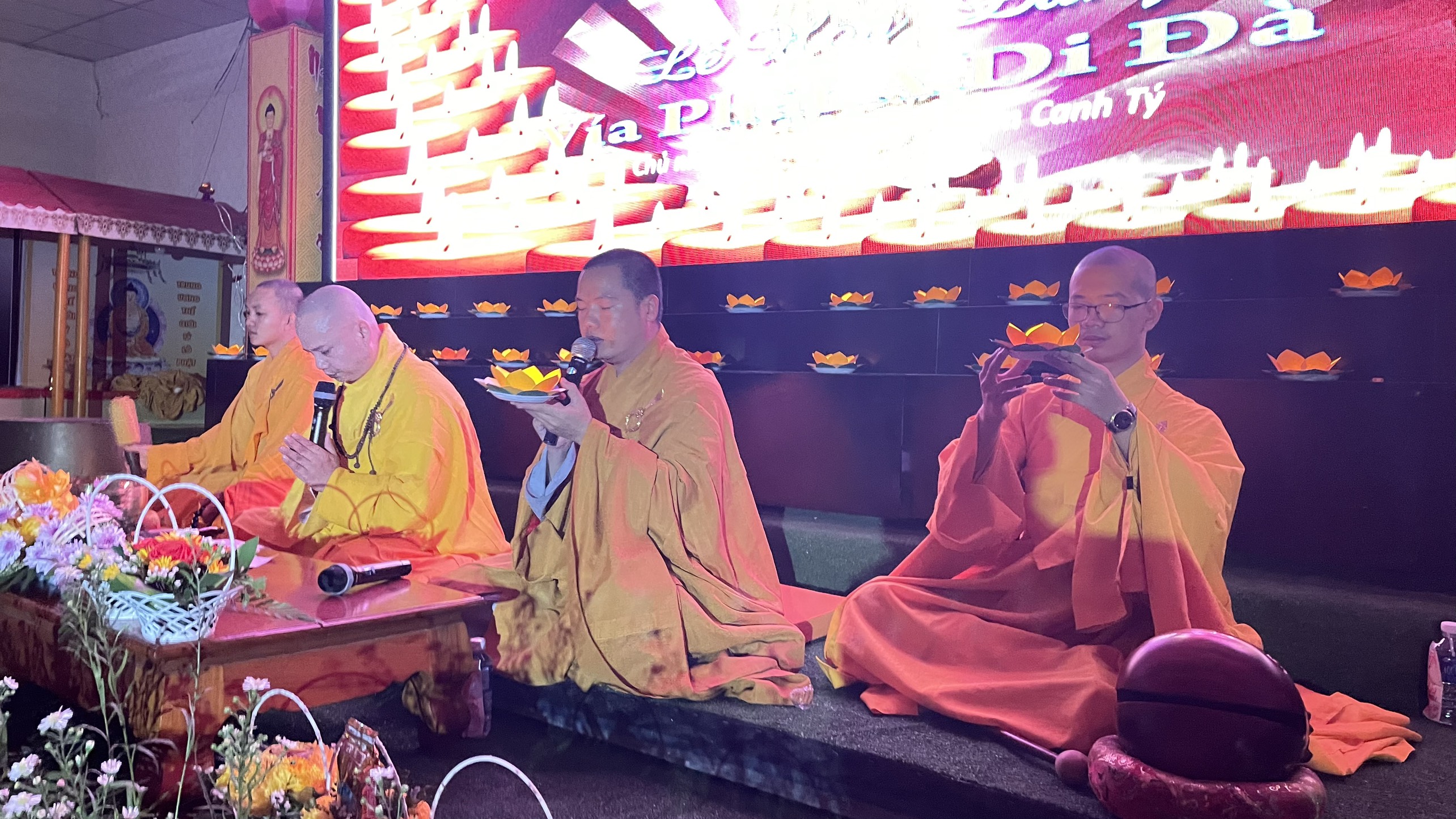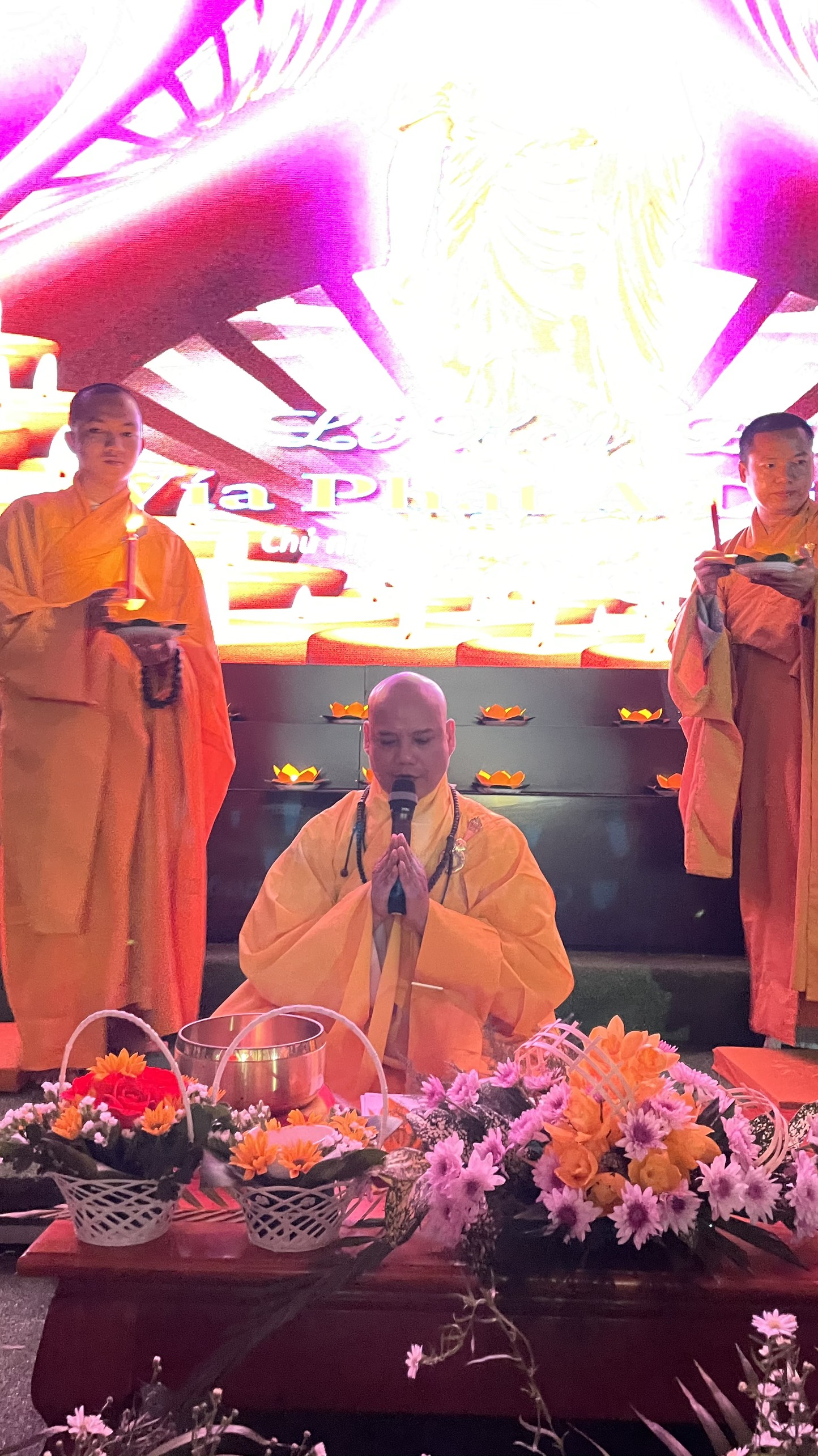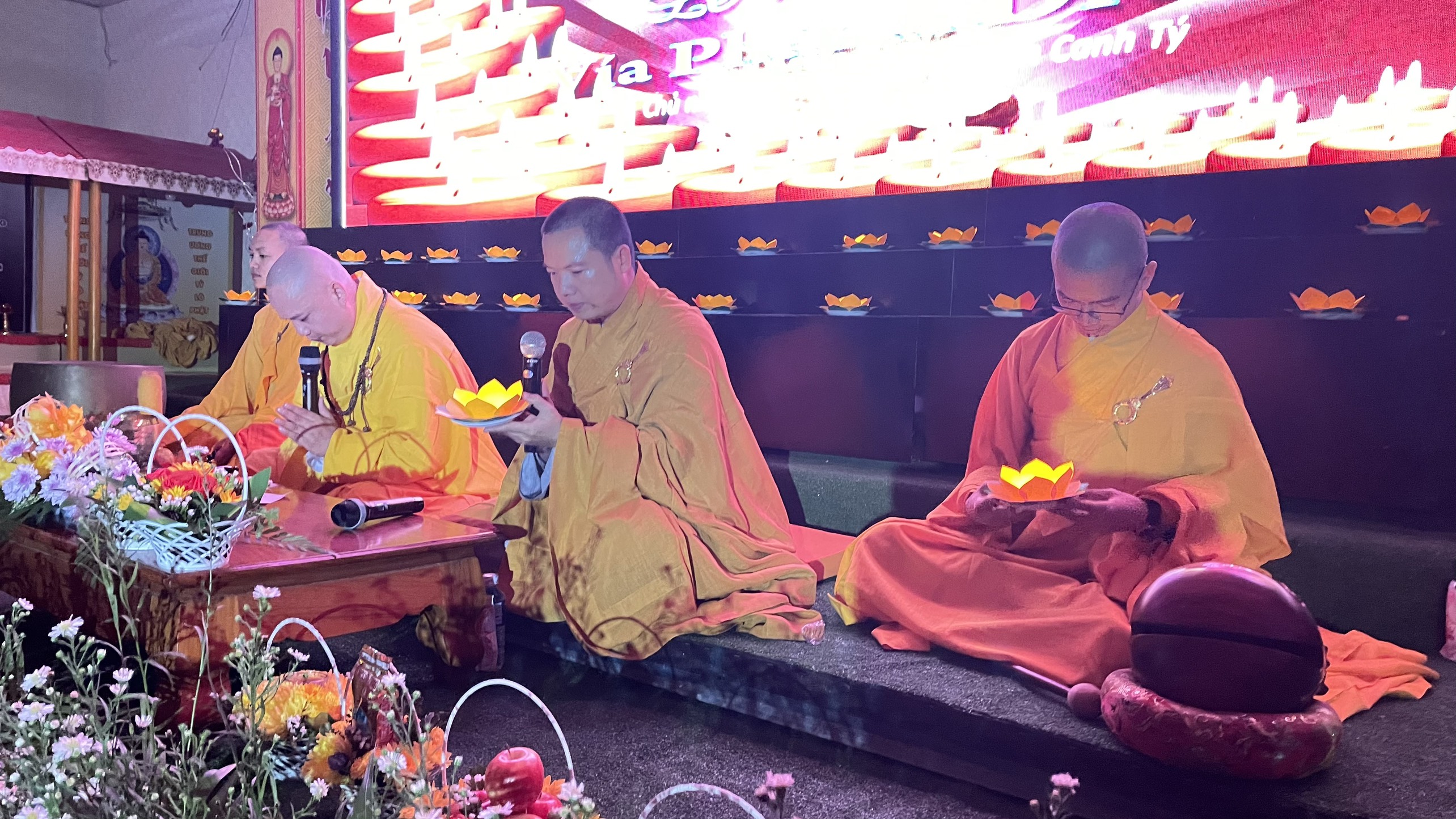 TT.Thích Trí Định tuyên đọc và đảnh lễ bốn mươi tám lời Phát nguyện của đức Phật A Di Đà. Tất cả Phật tử tay nâng ngọn hoa đăng đồng trang nghiêm gửi lời nguyện cầu đến gia đình, người thân và toàn thể nhân sanh được sống an lành. Trong không khí ấm áp, chư Tôn đức tiến hành nghi thức truyền đăng, ánh sáng được tiếp nối từ ngọn đèn tuệ giác của đức Từ phụ, được chư Tôn đức gìn giữ và trao truyền qua các thế hệ. Những ngọn nến lung linh huyền diệu lan tỏa khắp không gian, sáng soi khắp pháp giới dâng lên đức Phật, nhắn gửi nơi đây một thông điệp tuệ giác, soi sáng tâm thức con người hãy lìa biển mê về đến bến giác.