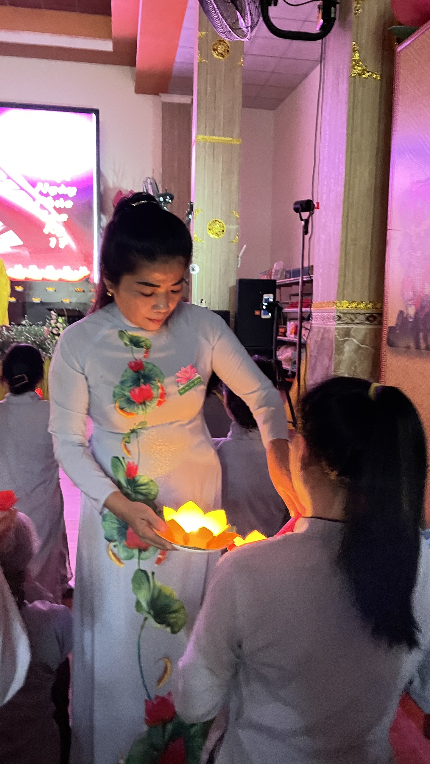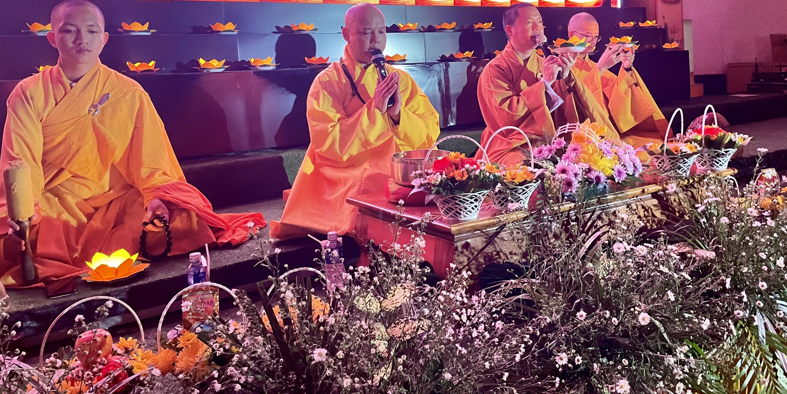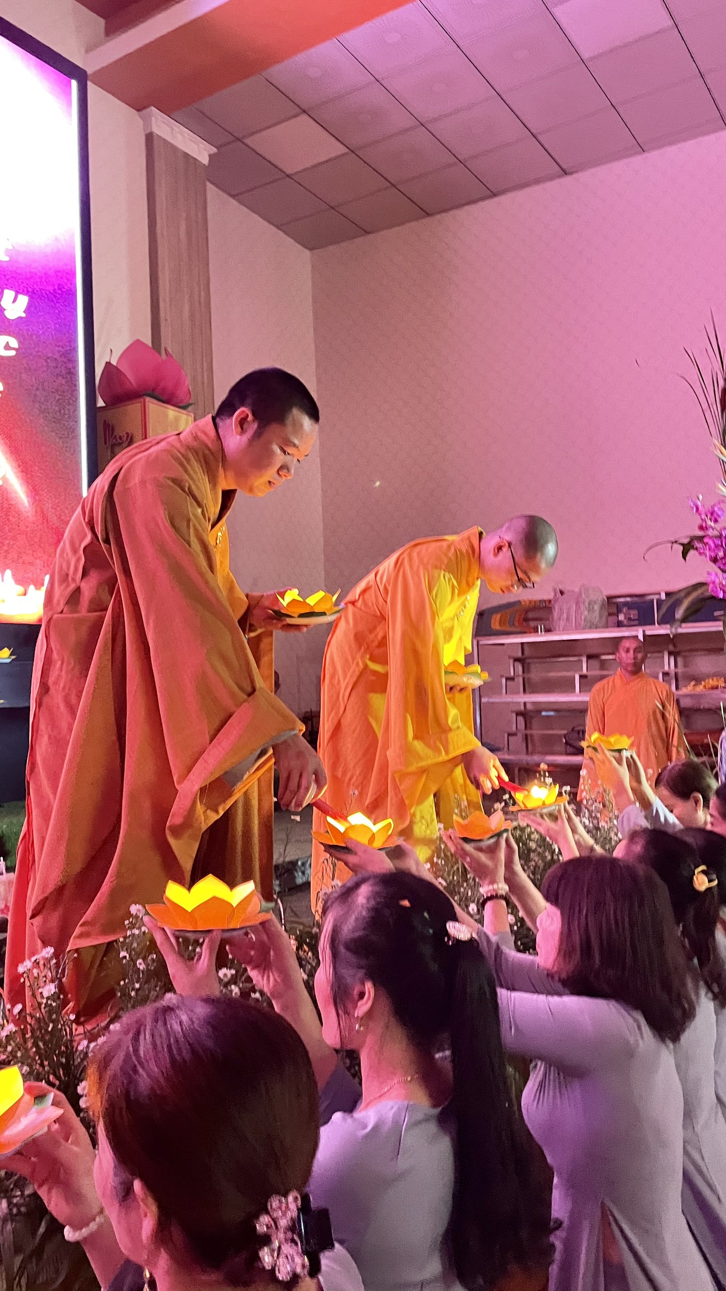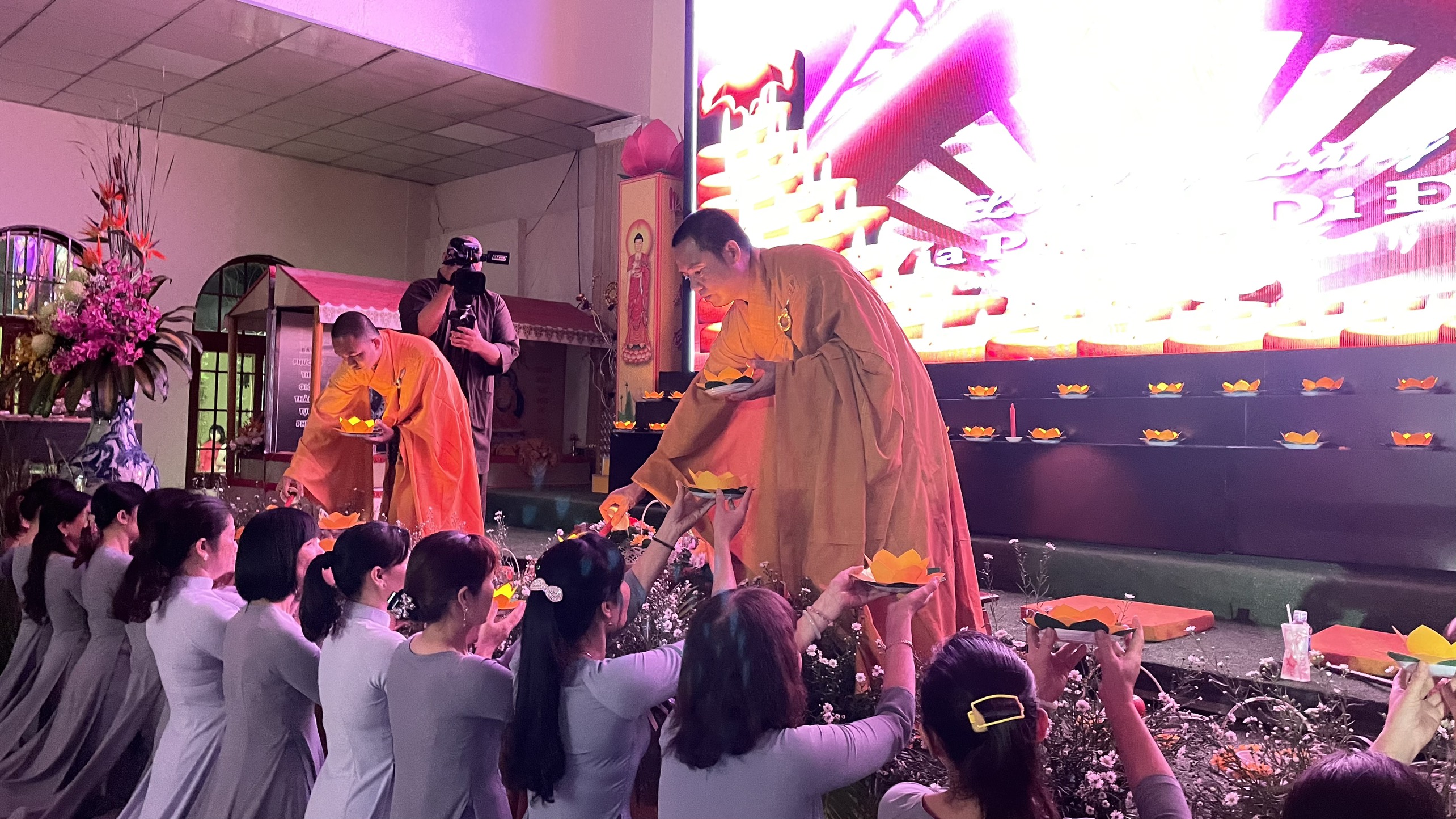 TT.Thích Trí Định tuyên đọc và đảnh lễ bốn mươi tám lời Phát nguyện của đức Phật A Di Đà. Tất cả Phật tử tay nâng ngọn hoa đăng đồng trang nghiêm gửi lời nguyện cầu đến gia đình, người thân và toàn thể nhân sanh được sống an lành. Trong không khí ấm áp, chư Tôn đức tiến hành nghi thức truyền đăng, ánh sáng được tiếp nối từ ngọn đèn tuệ giác của đức Từ phụ, được chư Tôn đức gìn giữ và trao truyền qua các thế hệ. Những ngọn nến lung linh huyền diệu lan tỏa khắp không gian, sáng soi khắp pháp giới dâng lên đức Phật, nhắn gửi nơi đây một thông điệp tuệ giác, soi sáng tâm thức con người hãy lìa biển mê về đến bến giác.