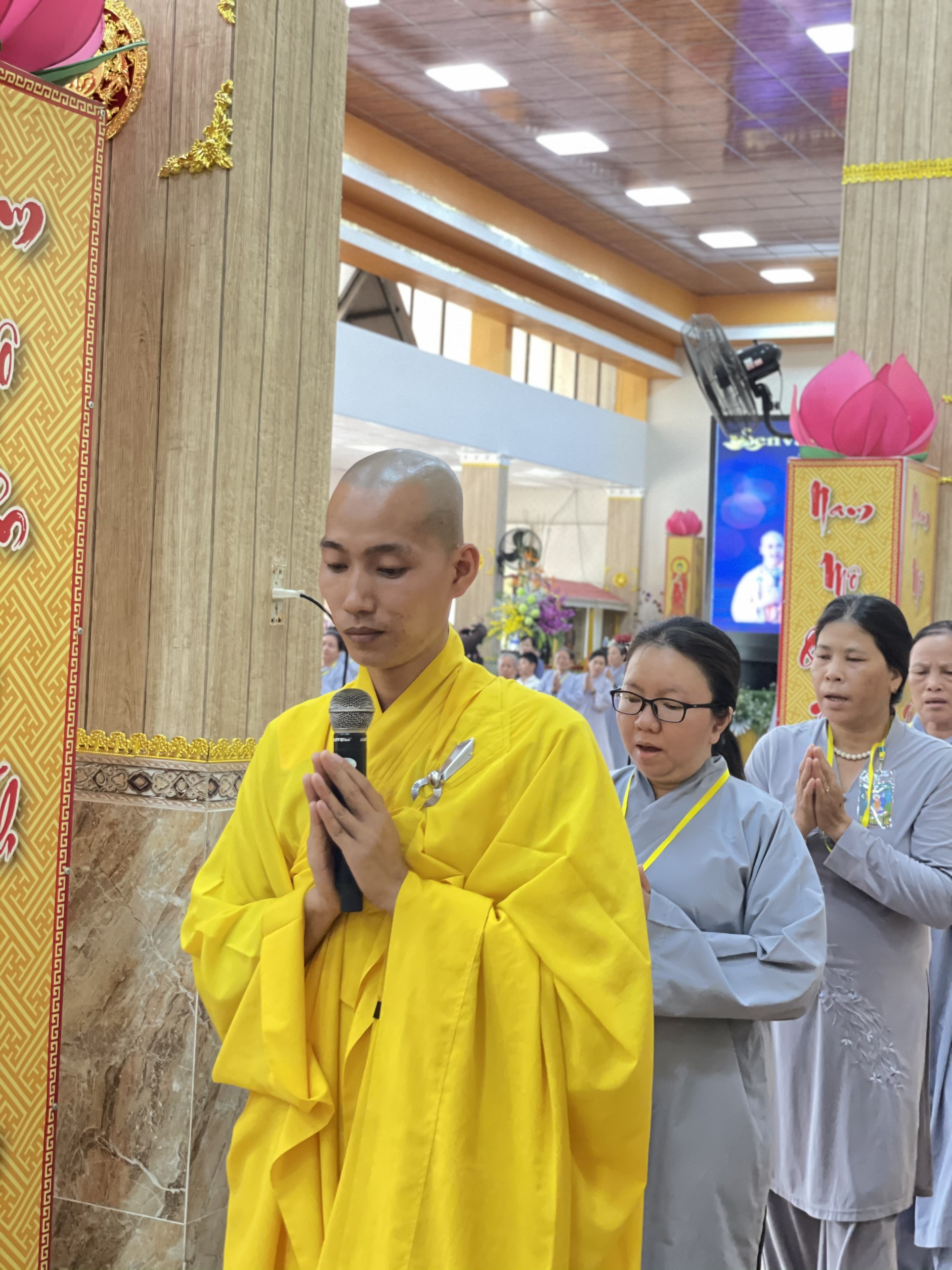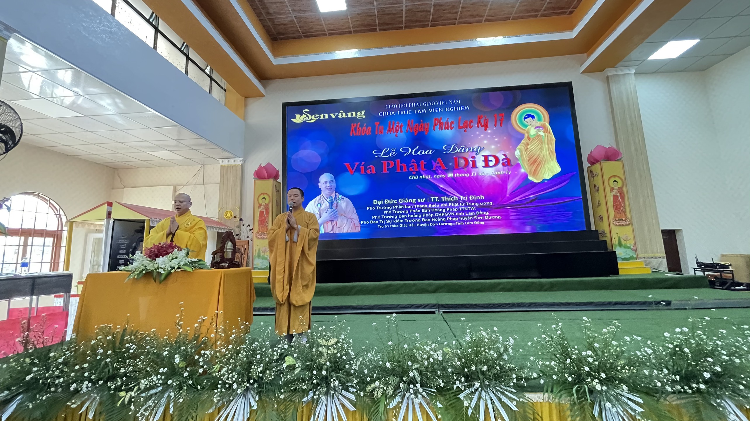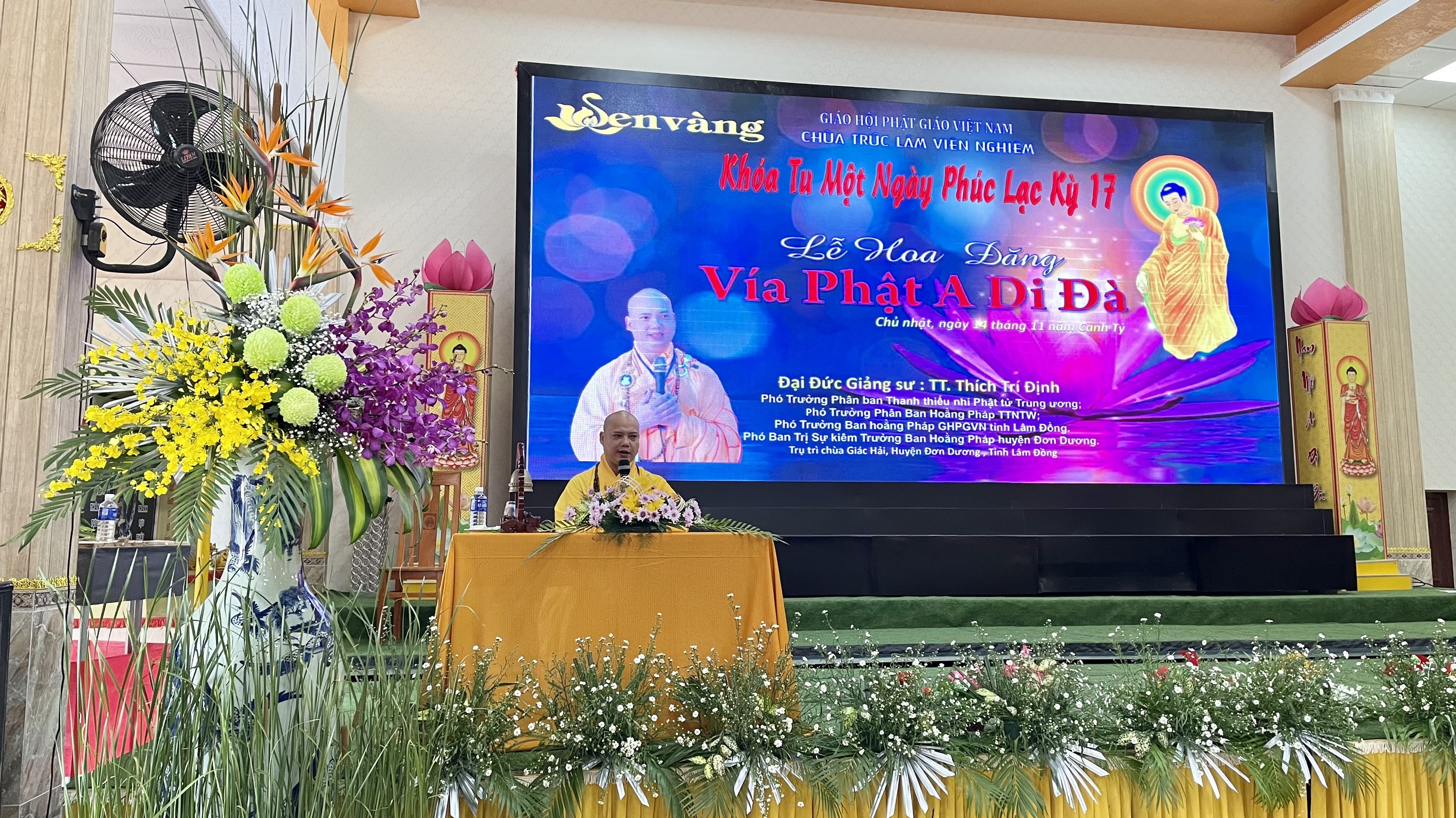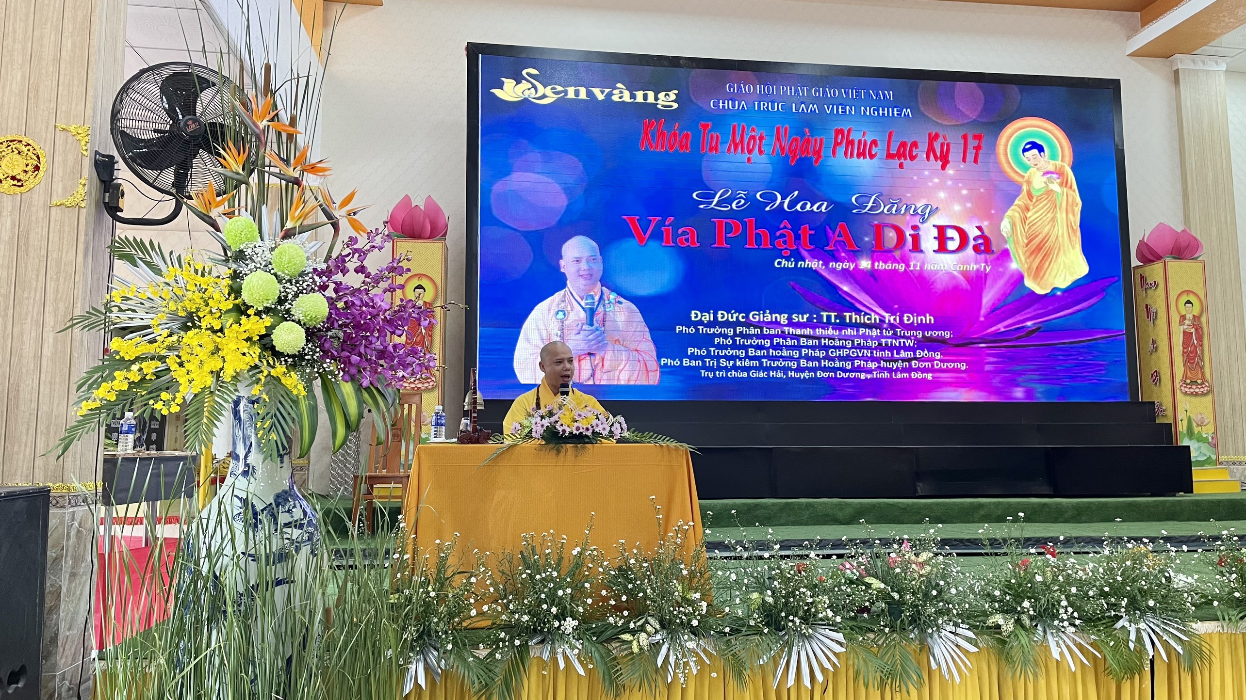 Buổi chiều cùng ngày, đạo tràng trang nghiêm cung đón bước chân an lạc của Thượng tọa Giảng sư Thích Trí Định - Phó trưởng Phân ban Thanh Thiếu nhi Phật tử TƯ, Phó trưởng Phân ban Hoằng pháp TTN TƯ GHPGVN, Phó trưởng Ban Hoằng pháp GHPGVN tỉnh Lâm Đồng, Phó BTS kiêm Trưởng ban Hoằng pháp huyện Đơn Dương, Trụ trì chùa Giác Hải (huyện Đơn Dương, tỉnh Lâm Đồng), quang lâm thuyết giảng với chủ đề “Phương pháp hành trì niệm Phật”.