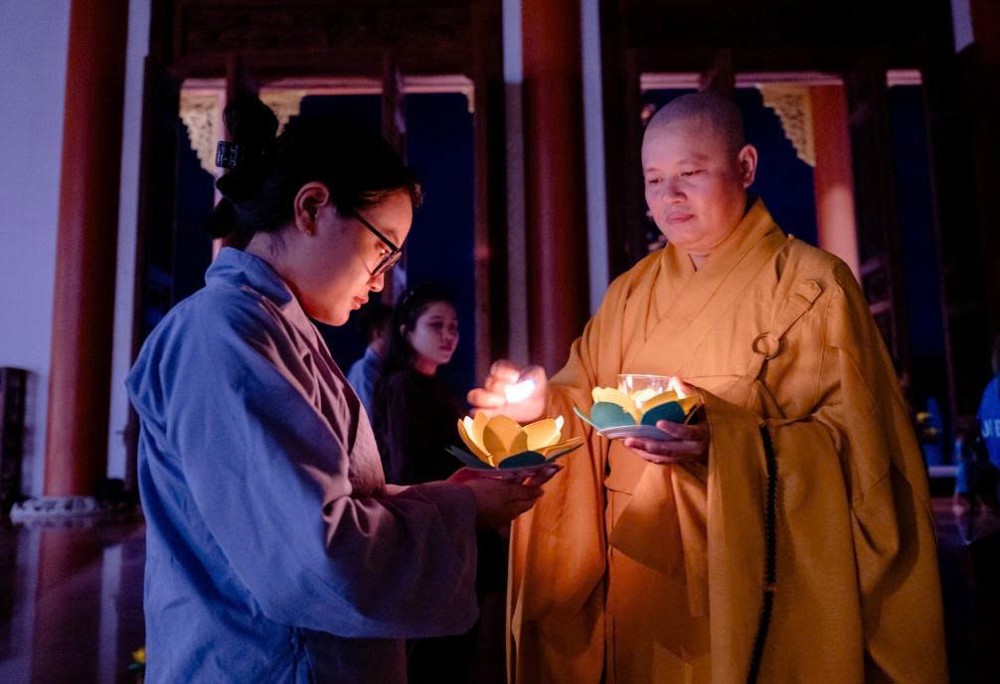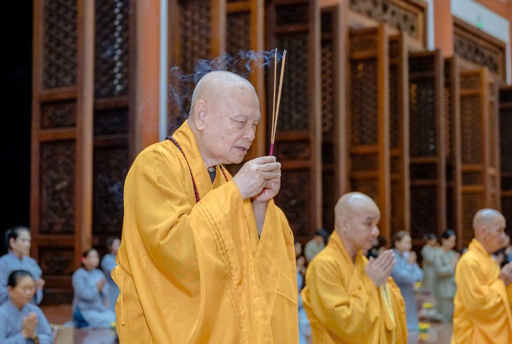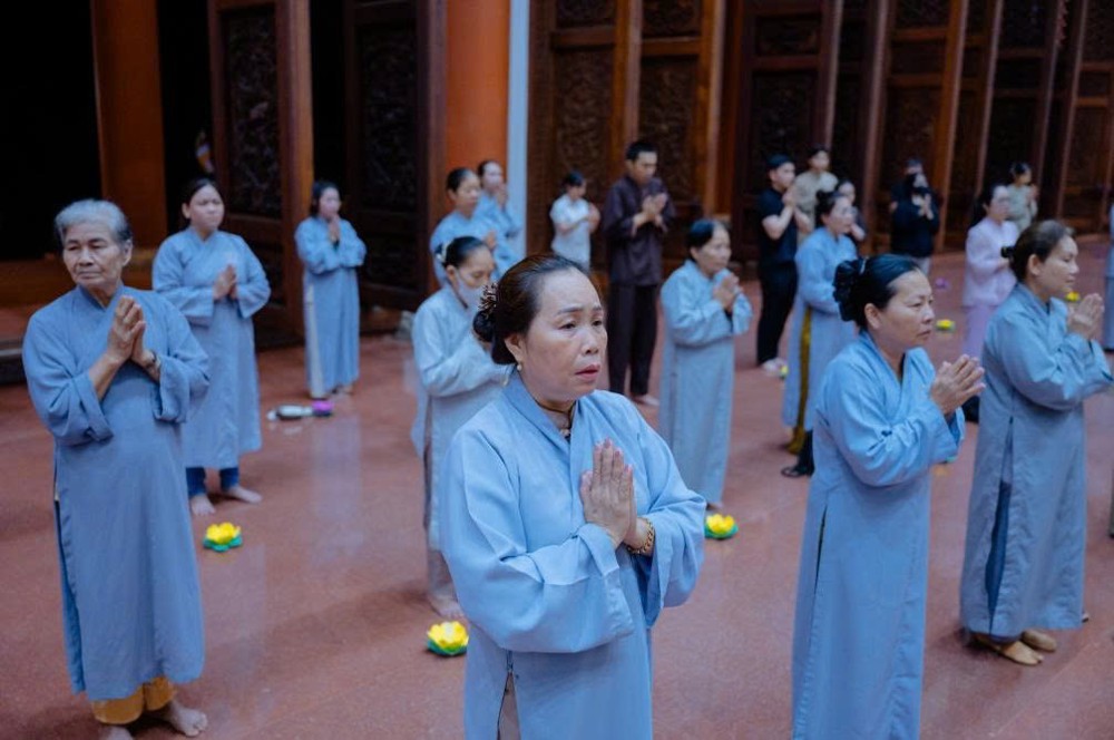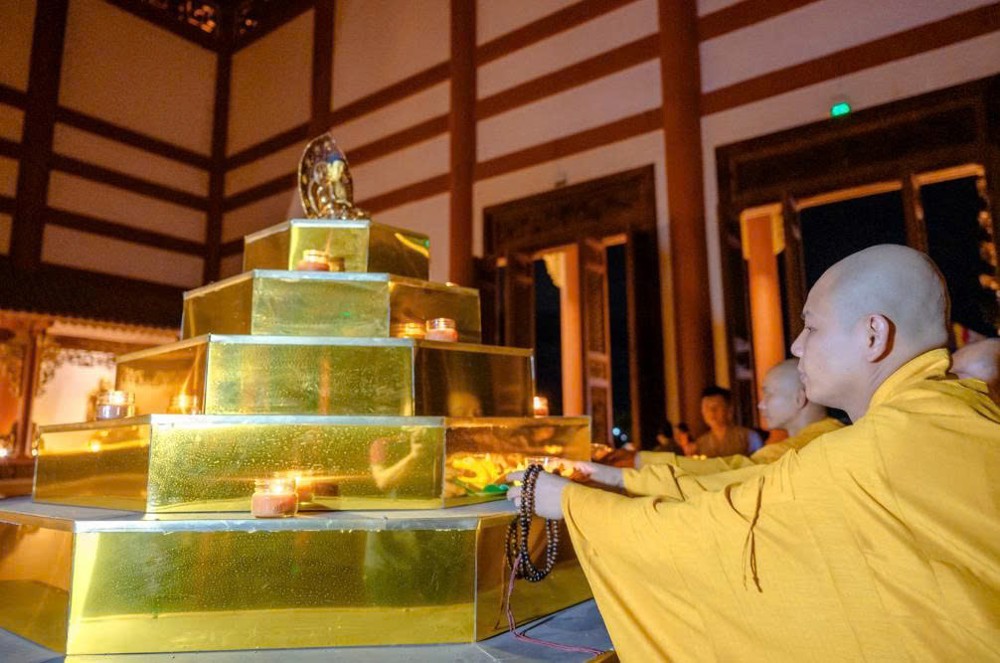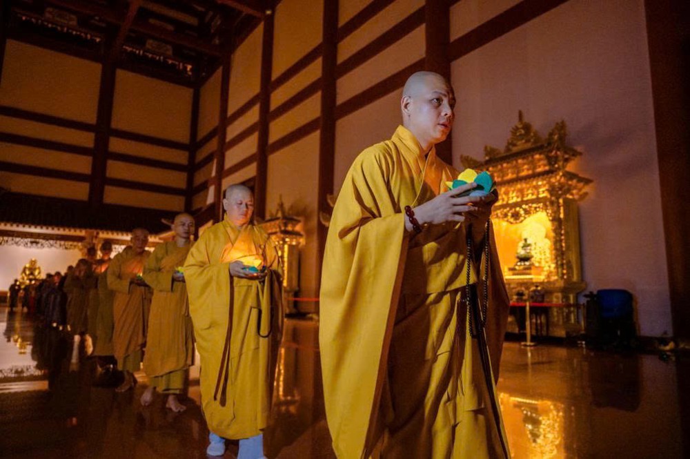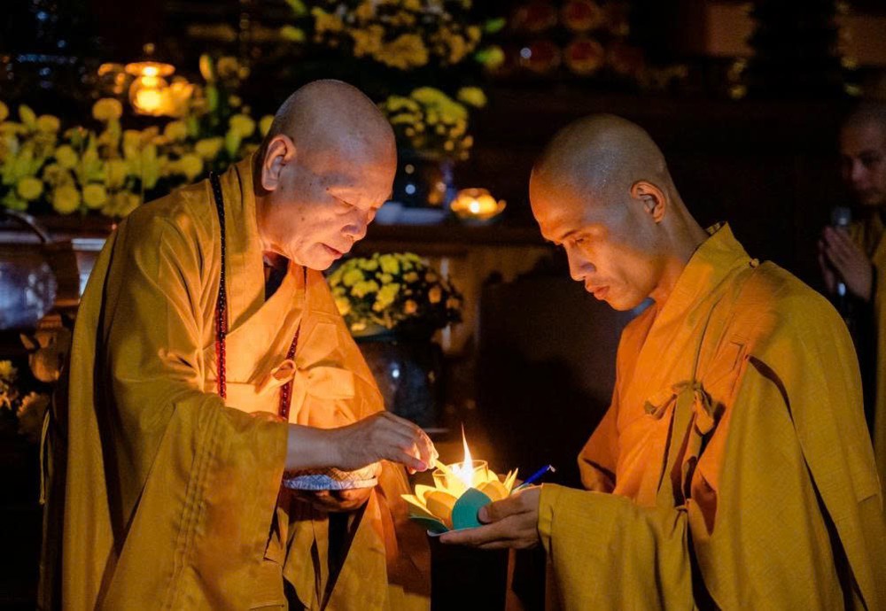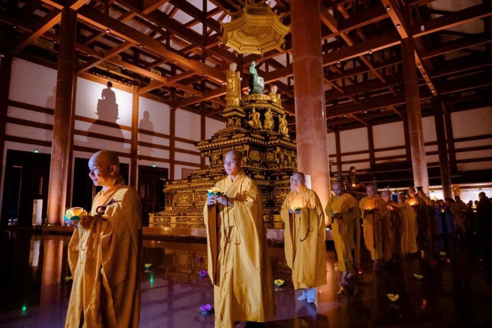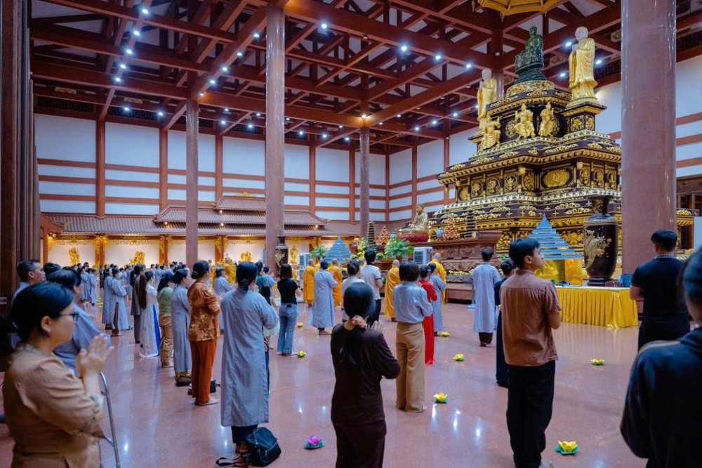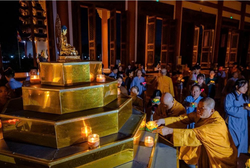 Tiếp đó, đại chúng thực hiện thiền hành quanh Chánh điện và thực hiện nghi thức dâng đăng cầu nguyện quốc thái dân an, nhân dân khắp nơi đều được bình an, mưa thuận gió hòa. Nghi lễ cũng thành kính hồi hướng năng lượng bình an đến đồng bào các vùng đang chịu ảnh hưởng của thiên tai, bão lũ, mong mọi khó khăn sớm được chuyển hóa, đời sống sớm ổn định trở lại.