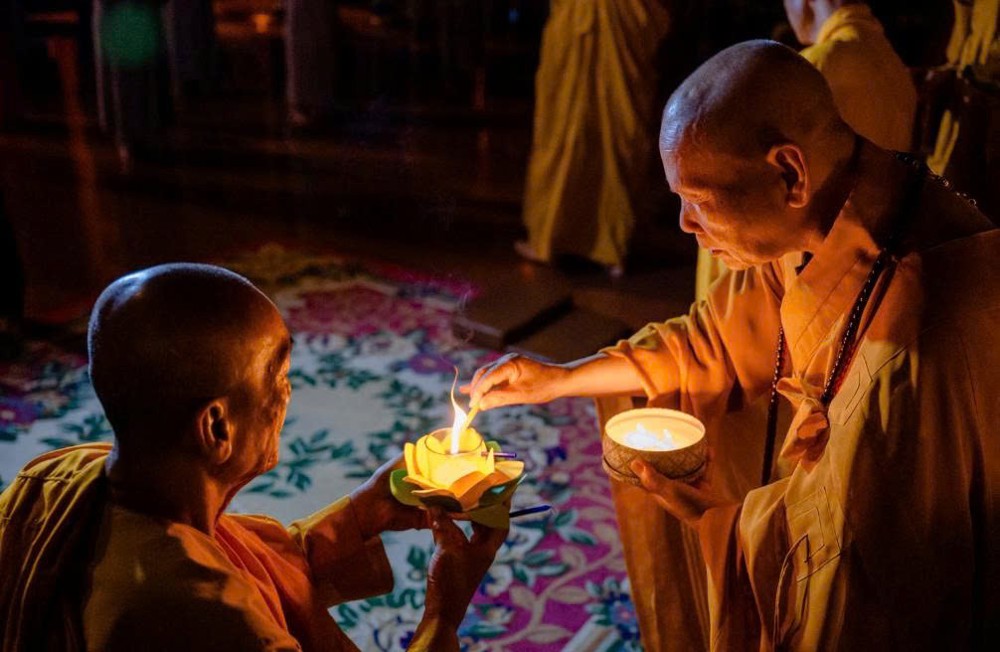 Trong nghi thức thỉnh đăng, Trưởng lão Hòa thượng Viện chủ chùa Quốc Ân Khải Tường trang nghiêm thỉnh đăng từ bàn Phật, truyền đến chư Tăng, rồi lan tỏa đến toàn thể hội chúng tham dự.