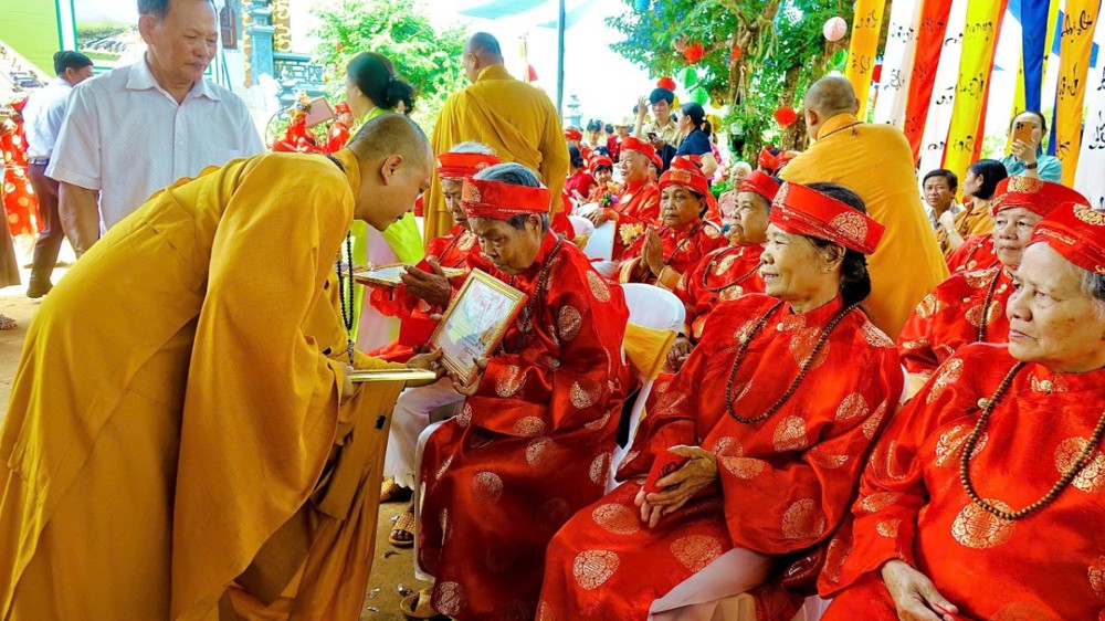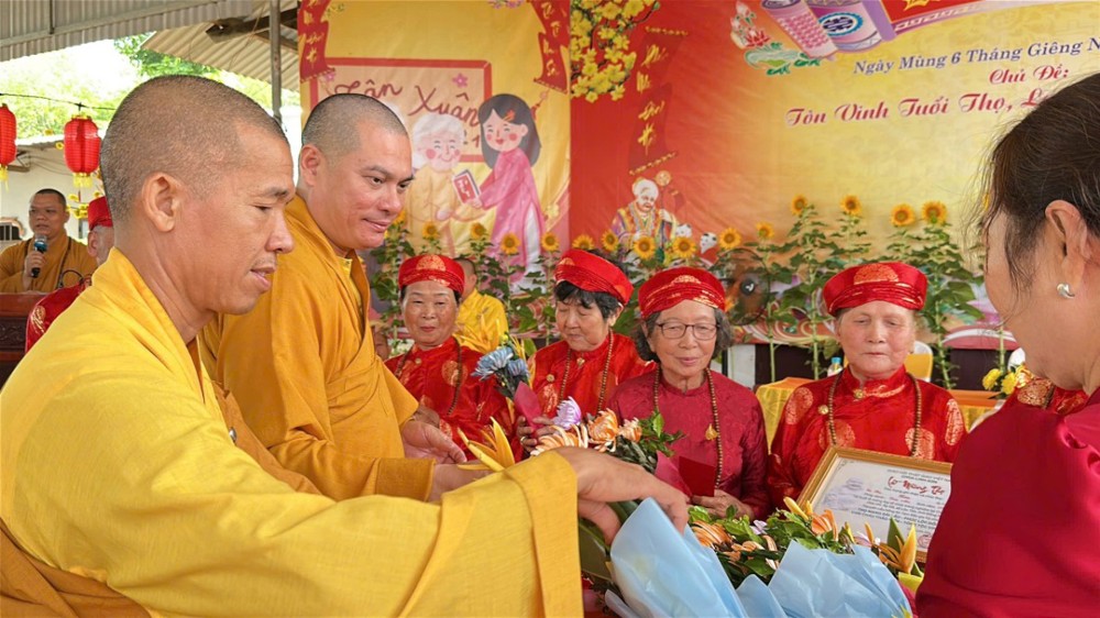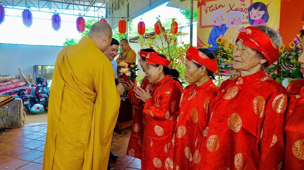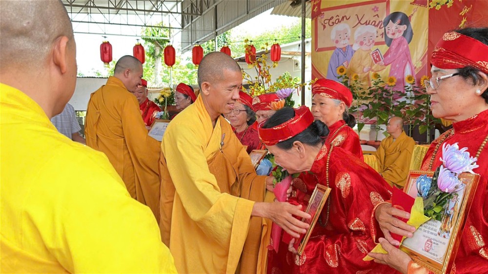 Tại buổi lễ, Ban Tổ chức đã trao gần 100 phần quà gồm hoa tươi, bằng chúc thọ, thư pháp, chuỗi tràng và bao lì xì đầu năm. Mỗi phần quà tuy giản dị nhưng chan chứa nghĩa tình của Đại đức Thích Nguyên Tín cùng quý nhà hảo tâm, thể hiện lòng tri ân sâu sắc đối với các bậc cao niên – những “cây cao bóng cả” đã dành trọn cuộc đời vun đắp gia đình, đóng góp cho xã hội và xây dựng quê hương.