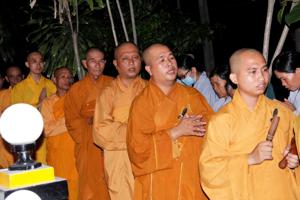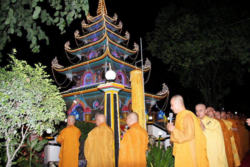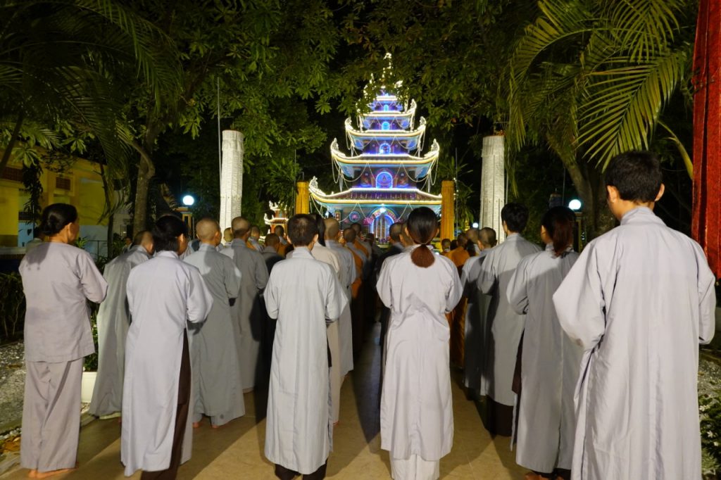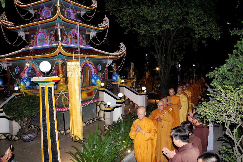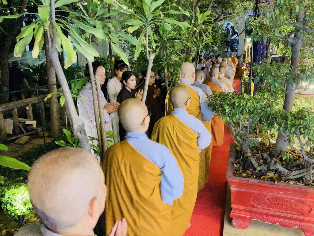 Buổi tối, vào lúc 22 giờ 45’, diễn ra lễ kinh hành nhiễu tháp, tất cả đại chúng chư Tăng Ni và Phật tử trên 500 vị, vân tập trước bảo tháp bảy tầng, nơi an trí nhục thân của Hòa thượng Tôn sư để chuẩn bị cho lễ nhiễu tháp. Việc đi kinh hành niệm Phật, nhiễu tháp cũng đã trở thành truyền thống trong lễ húy kỵ, văn hóa đi nhiễu này bày tỏ lòng tôn kính đối với các bậc tôn túc, có từ thời Đức Phật, các vị đệ tử thể hiện sự cung kính Đức Phật bằng cách đi nhiễu quanh Phật ba vòng, theo chiều kim đồng hồ, sau đó quỳ xuống lễ Phật. Do đó, nghi thức nhiễu tháp Hòa thượng càng được nâng cao ý nghĩa tôn kính bậc ân sư.