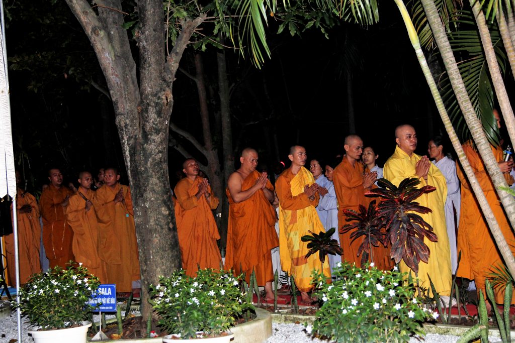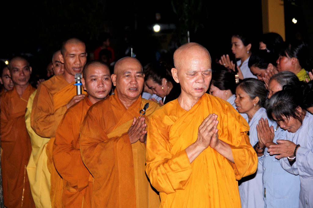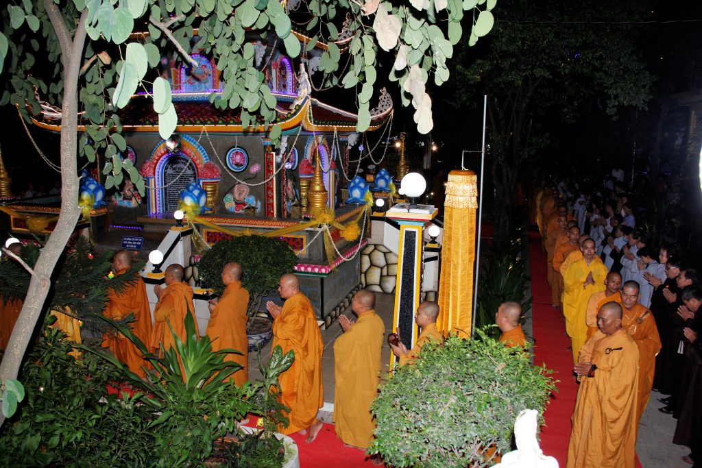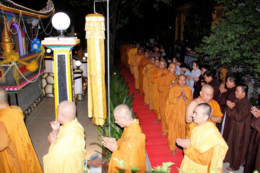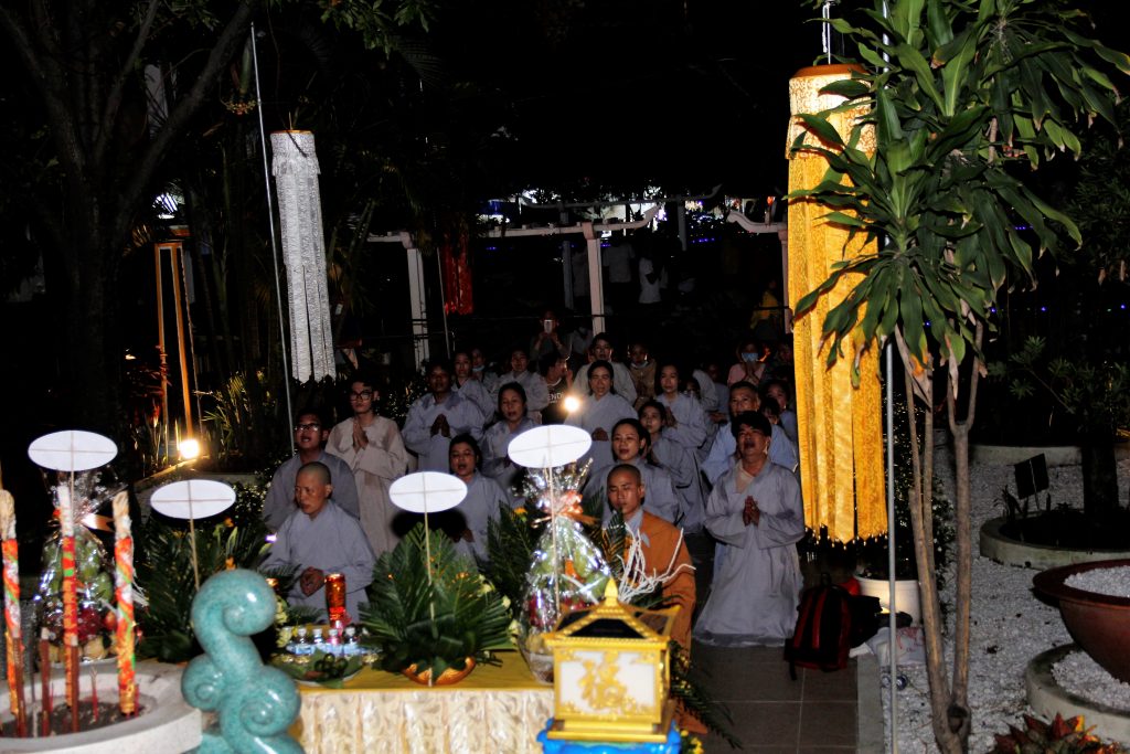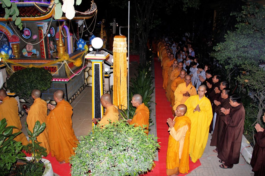 Buổi tối, vào lúc 22 giờ 45’, diễn ra lễ kinh hành nhiễu tháp, tất cả đại chúng chư Tăng Ni và Phật tử trên 500 vị, vân tập trước bảo tháp bảy tầng, nơi an trí nhục thân của Hòa thượng Tôn sư để chuẩn bị cho lễ nhiễu tháp. Việc đi kinh hành niệm Phật, nhiễu tháp cũng đã trở thành truyền thống trong lễ húy kỵ, văn hóa đi nhiễu này bày tỏ lòng tôn kính đối với các bậc tôn túc, có từ thời Đức Phật, các vị đệ tử thể hiện sự cung kính Đức Phật bằng cách đi nhiễu quanh Phật ba vòng, theo chiều kim đồng hồ, sau đó quỳ xuống lễ Phật. Do đó, nghi thức nhiễu tháp Hòa thượng càng được nâng cao ý nghĩa tôn kính bậc ân sư.