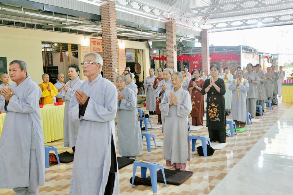 Sau thời pháp thoại là khóa lễ tụng kinh cầu an được cử hành trang nghiêm, với sự tham gia của chư Tăng Ni và đông đảo Phật tử, đồng thanh trì tụng, nguyện cầu quốc thái dân an, thế giới hòa bình, chúng sinh an lạc.