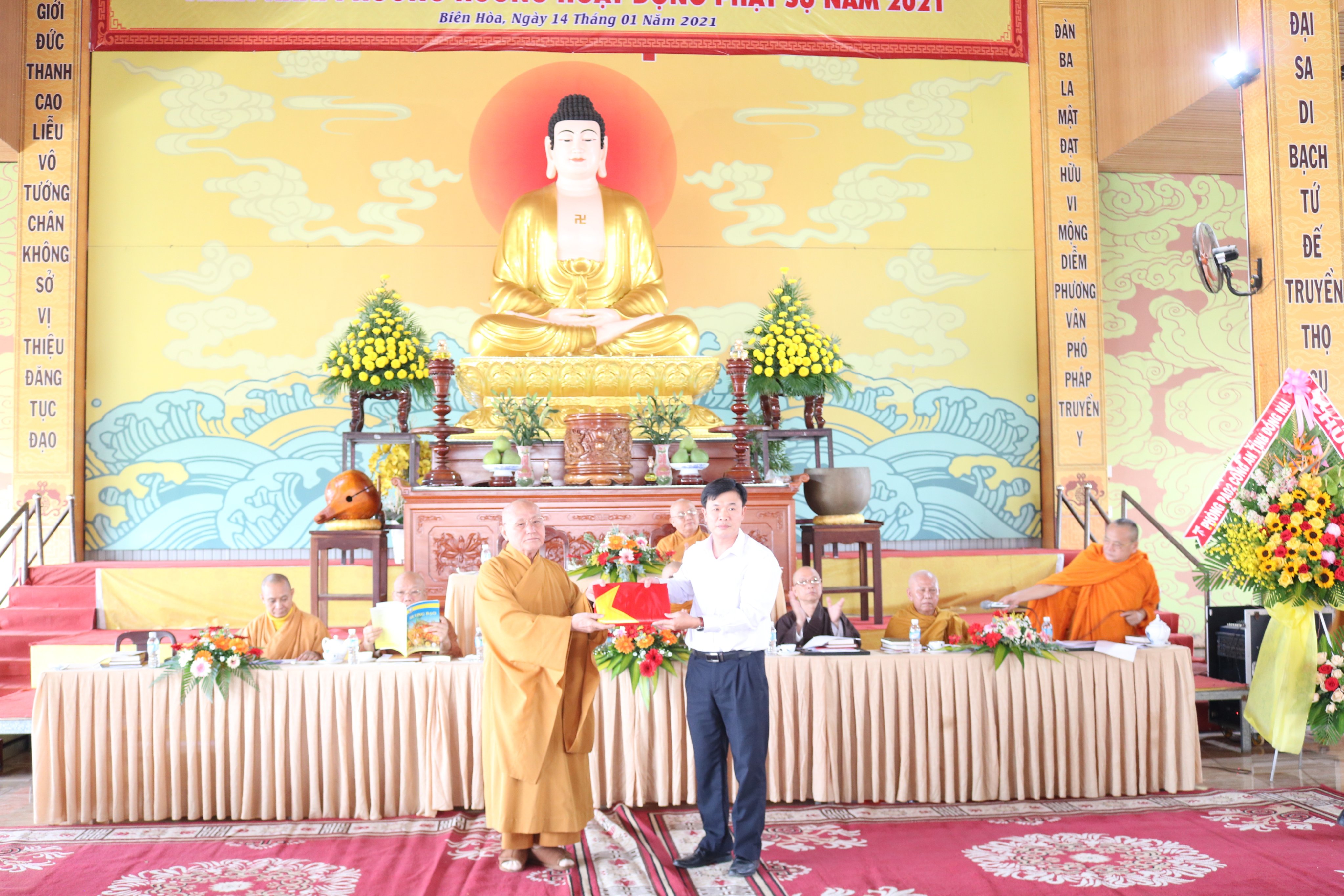 Mở đầu chương trình Hội nghị, BTS GHPGVN tỉnh Đồng Nai hoan hỷ được tiếp nhận lá cờ Tổ quốc và lá cờ Phật giáo từ Ban Tôn giáo Chính Phủ do Ban Tôn giáo tỉnh Đồng Nai đại diện trao tặng. Sau đó Hội nghị tổ chức buổi chào Quốc kỳ và Đạo kỳ trang nghiêm trước trụ sở Văn phòng BTS GHPGVN tỉnh Đồng Nai.