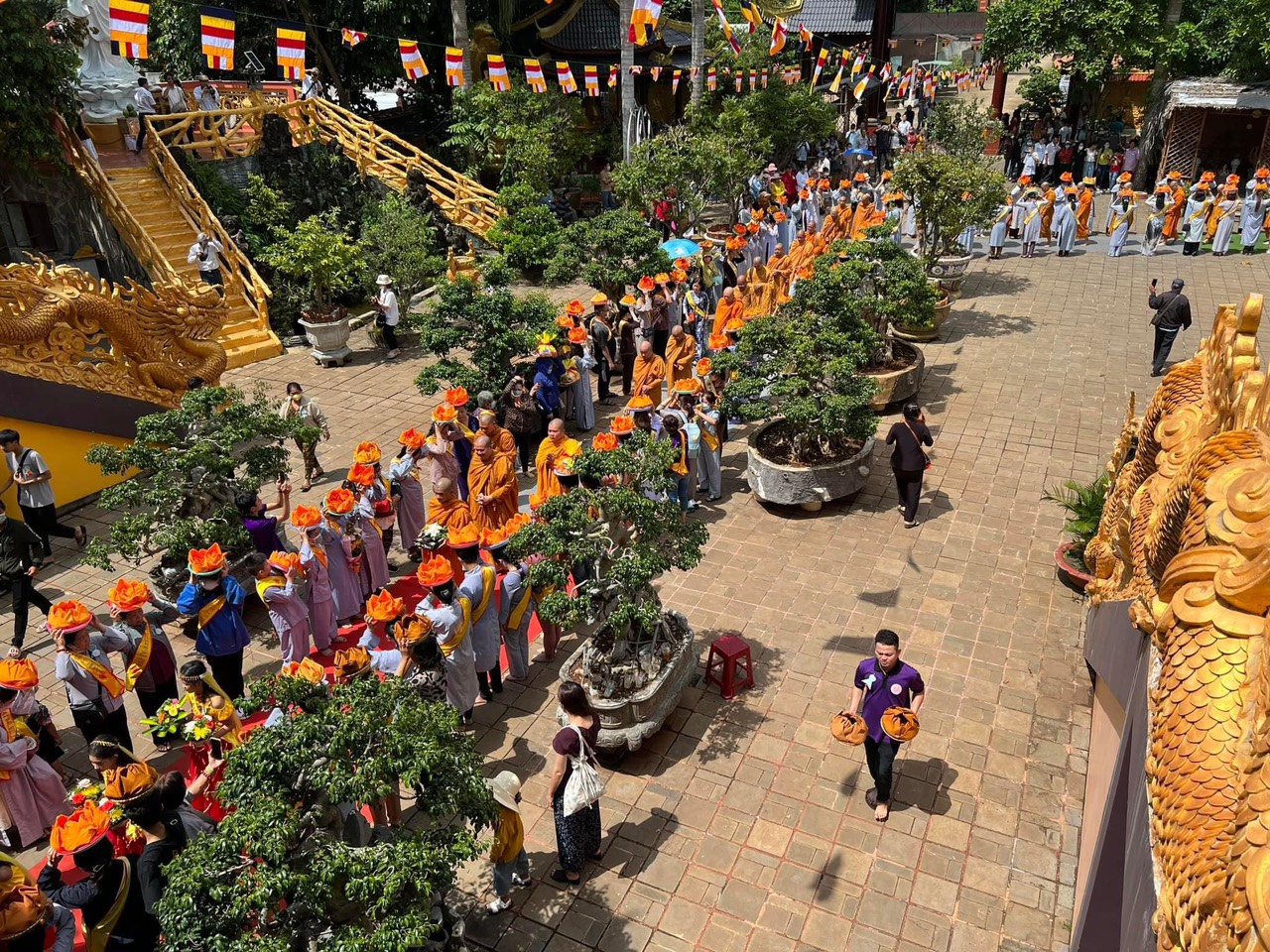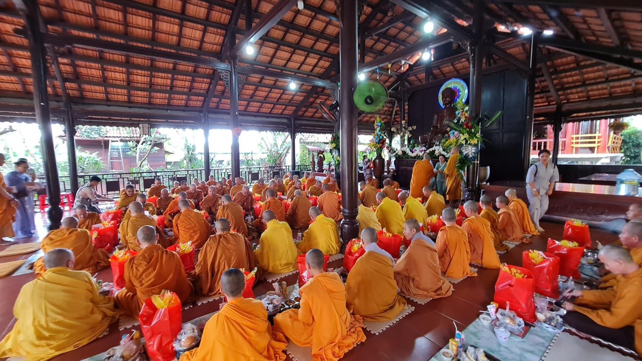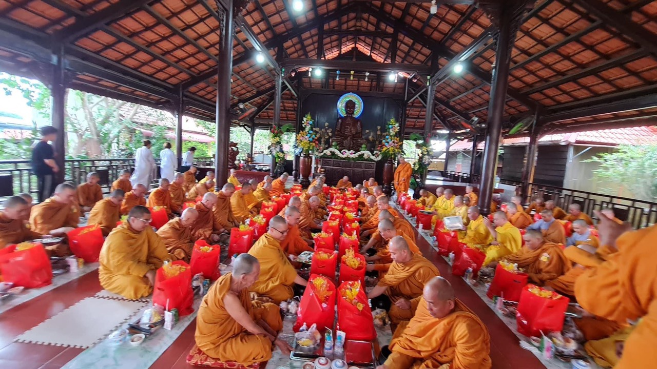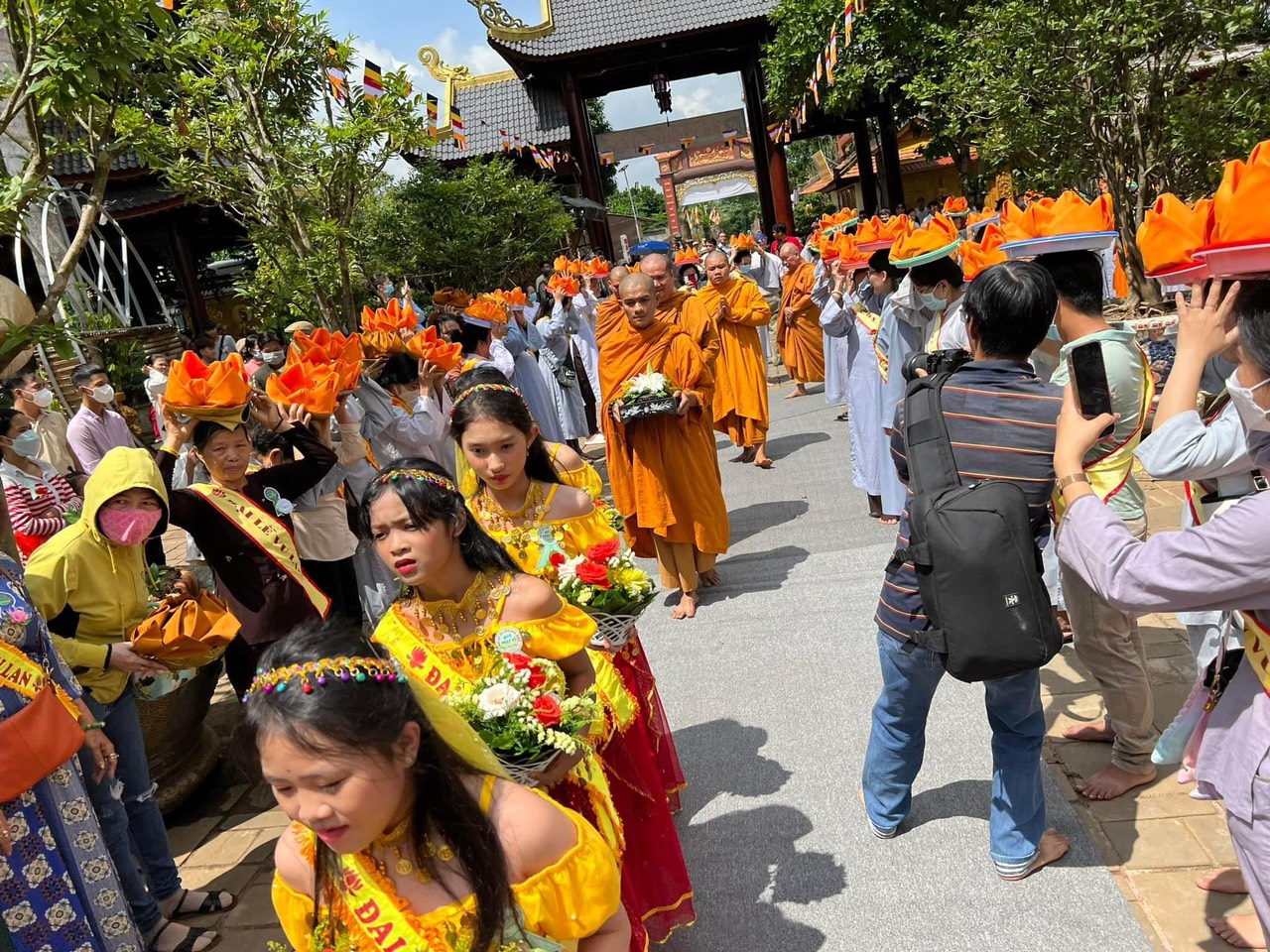 Sau buổi lễ dâng y ca-sa, nam nữ Phật tử Tx.Ngọc Đăng cùng Phật tử xa gần thành kính dâng lễ bông hồng cài áo, cúng dường trai tăng lên chư Tôn đức Tăng Ni.