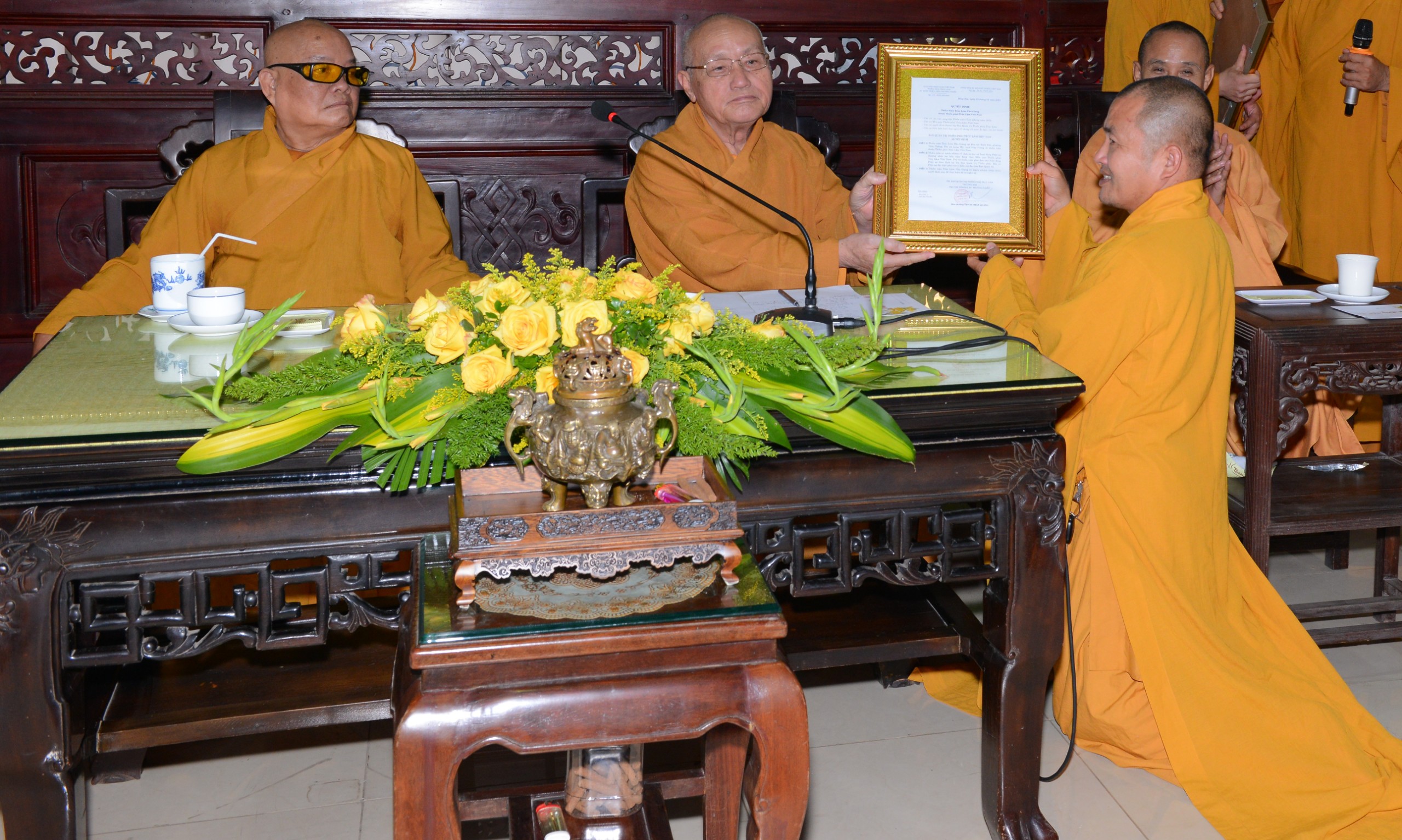 Hòa thượng Trưởng ban Quản trị Thiền phái cung kính dâng lời tác bạch trước Hòa thượng ân sưTrong không khí thiêng liêng và ấm áp đạo tình, chư Tôn đức đại diện các Thiền viện trên khắp mọi miền đất nước đã dâng lời tác bạch, cúng dường và bày tỏ tấm lòng hiếu kính của mình đến với Hoà thượng Ân sư khả kính và báo cáo sơ bộ về tình hình tu tập của Thiền môn.