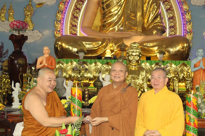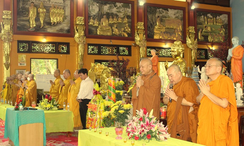 Quang lâm chứng minh: TT. Thích Huệ Khai - Phó ban Trị sự GHPGVN tỉnh Đồng Nai cùng chư Tôn đức phái đoàn Ban thường trực BTS tỉnh; ông Nguyễn Đình Kiên - Quyền trưởng ban tôn giáo tỉnh.