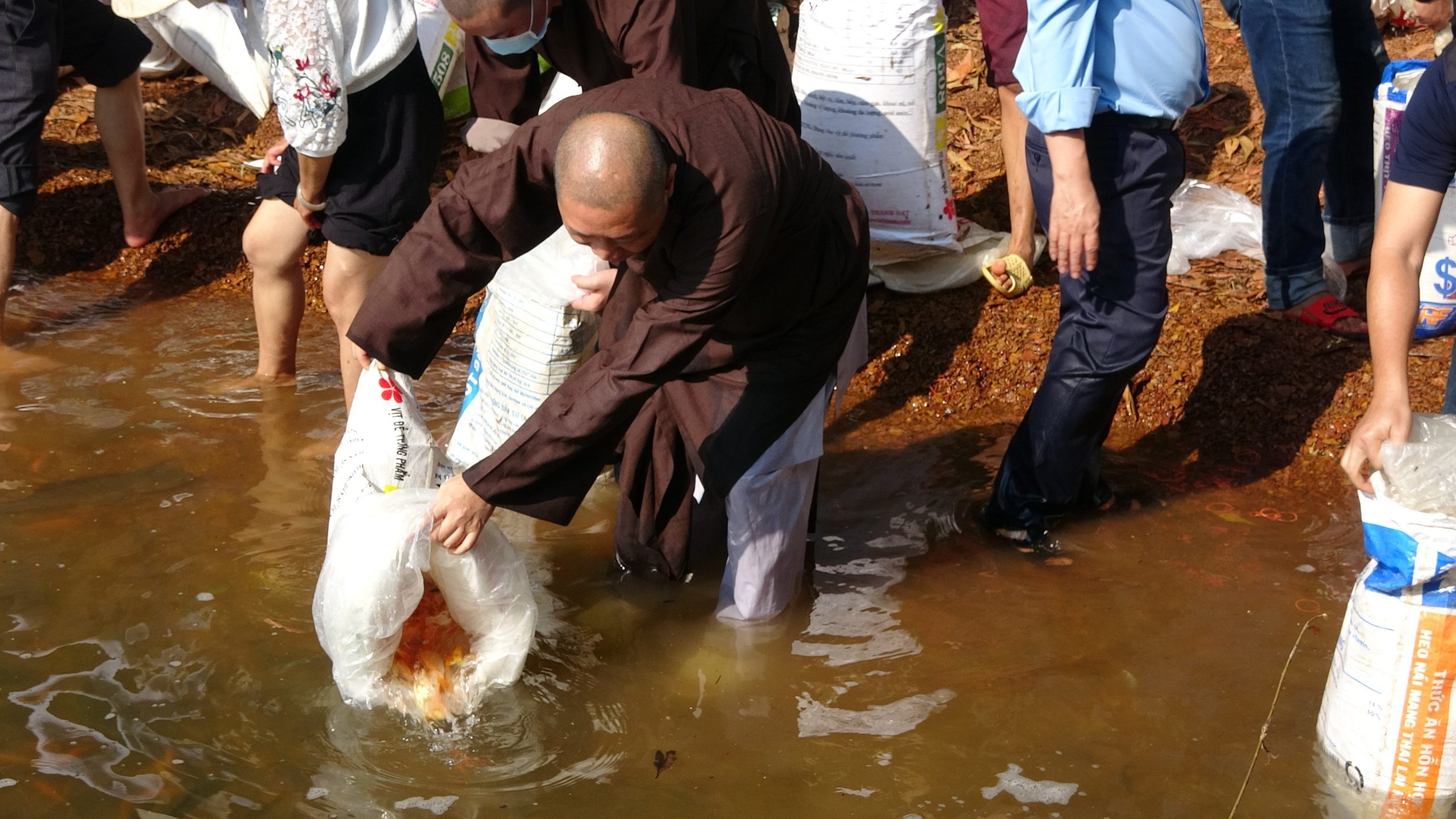 Sau khoảng 25 phút di chuyển bằng tàu, đoàn đã đến nơi thả cá là khu vực đảo hai đính (đảo con Rùa) thuộc ấp 2, xã Mã Đà, huyện Vĩnh Cửu. Tại đây, có ông Vũ Đình Trung - Phó Chủ tịch UBMTTQVN tỉnh Đồng Nai và các đại biểu đã thả hơn 500 ngàn con cá giống các loại khoảng 3,8 Tấn gồm chép, trôi, rô phi xuống lòng hồ Trị An. Tổng kinh phí thả cá lần này là 200 triệu đồng do Viện Chuyên Tu ở huyện Long Thành vận động Phật tử Thiện Nhân tài trợ. Trung bình mỗi năm, Viện Chuyên Tu thả 20 tấn cá giống xuống hồ Trị An, đây là hoạt động định kỳ mỗi năm 3 lần của Viện Chuyên Tu kể từ năm 2016 đến nay.
