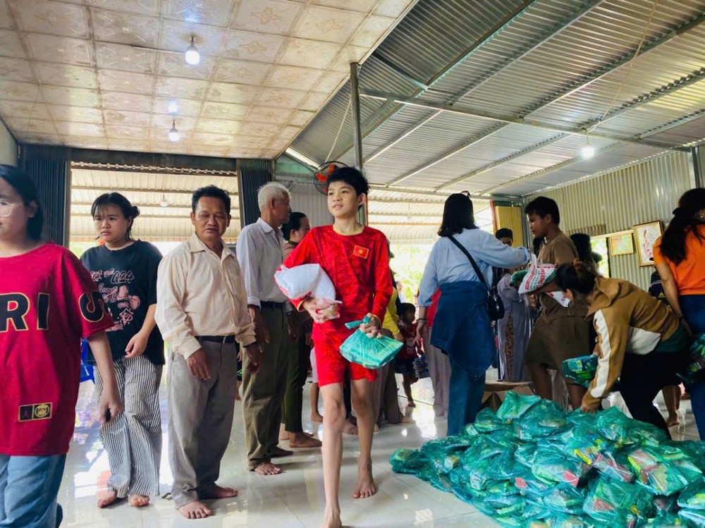 Mỗi phần quà gồm những nhu yếu phẩm thiết yếu như: gạo, mì gói, đường, hạt nêm, áo thun... cùng một phong bì tịnh tài nhỏ. Tuy giá trị vật chất không lớn, nhưng đó là tấm lòng từ bi và tình người, được gửi gắm trong tinh thần “Lá lành đùm lá rách” – một nghĩa cử ấm áp giữa mùa trăng tròn đoàn viên.