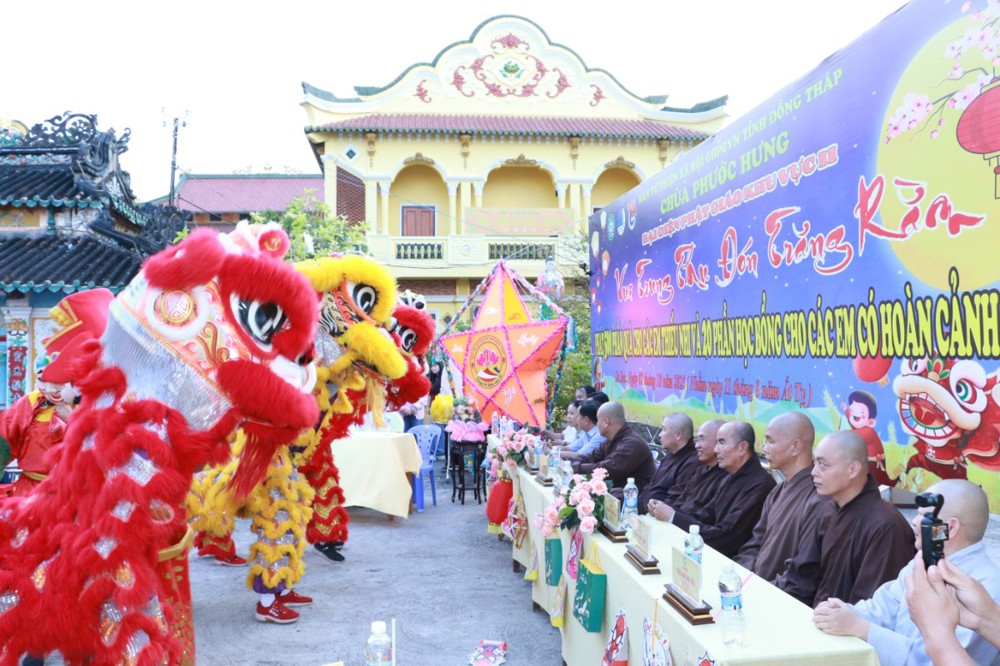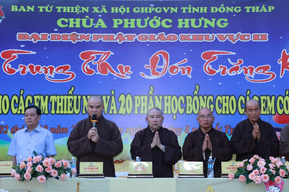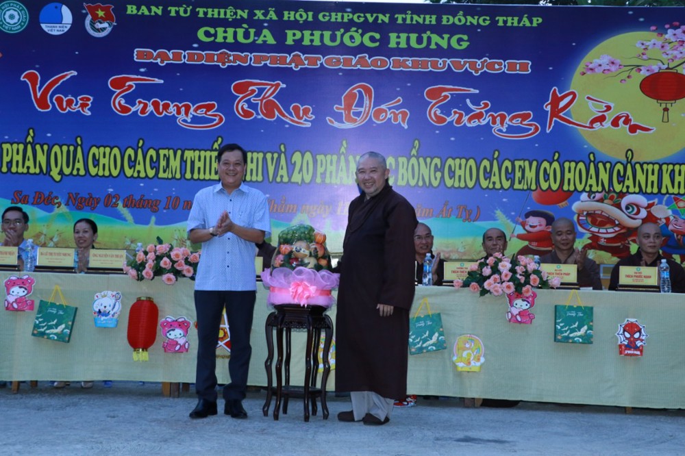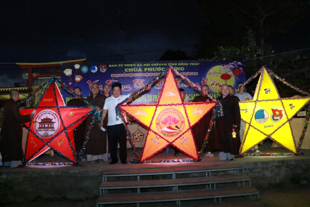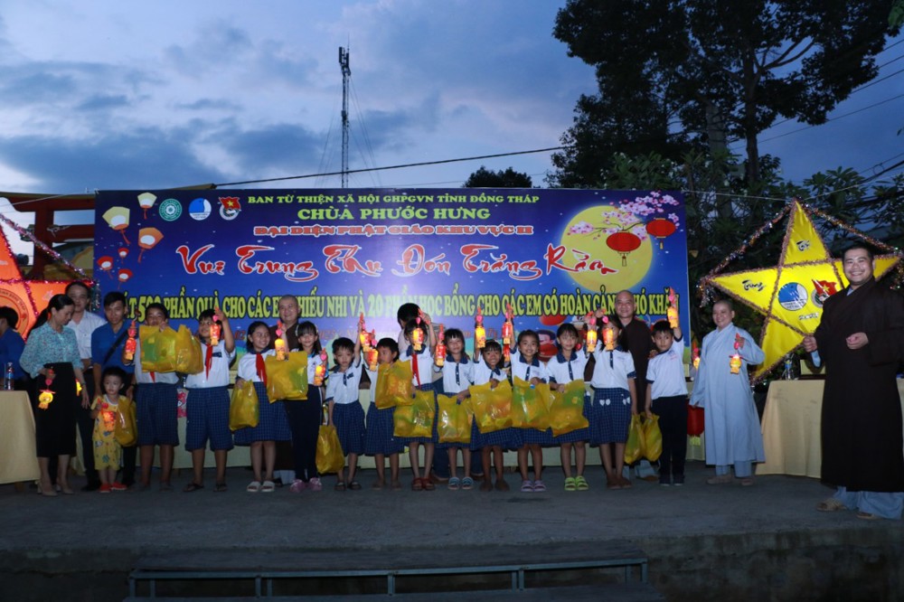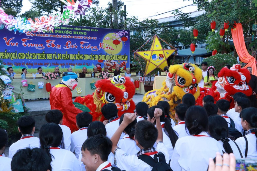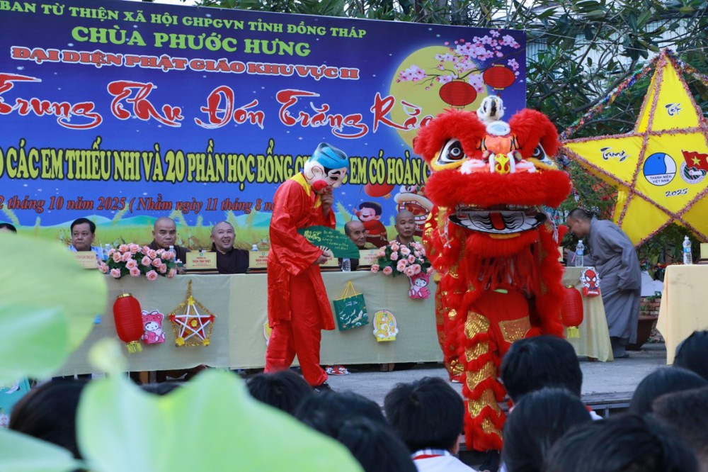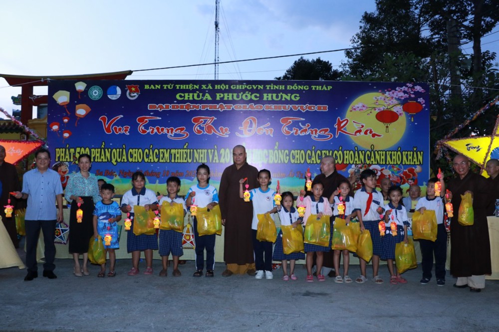 Trên tinh thần Đạo pháp luôn đồng hành cùng Chính Quyền các cấp, quan tâm chăm lo đến đời sống, niềm vui và nụ cười tuổi thơ các em thiếu nhi, các em là mầm non tương lai của Đất nước. Với ý nghĩa đó, Ban từ thiện xã hội GHPGVN tỉnh Đồng Tháp cùng Ban đại diện Phật giáo khu vực II đã long trọng “Đêm Hội Trăng Rằm” tặng quà Trung Thu cho các em thiếu nhi nhân dịp Tết Trung 2025 tại Chùa Phước Hưng – Phường Sa Đéc. Phát 500 phần quà Trung Thu cho các em Thiếu Nhi nhân dịp Tết Trung 2025. Mỗi phần quà gồm có lồng đèn, bánh trung thu, kẹo, snack, tập…, bên cạnh đó Chư tôn đức khu vực II còn trao tặng 20 phần học bổng (1.000.000đ/1 phần) cho các em thiếu nhi có hoàn cảnh gia đình khó khăn.