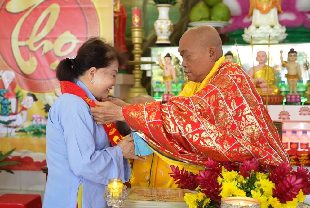 Tiếp đó, Ban Tổ chức đã trang nghiêm cử hành Lễ chúc thọ dành cho các Phật tử cao niên trong đạo tràng. Sau nghi thức thắp đèn Bổn Mạng chúc phúc mừng thọ, Hòa thượng Viện chủ, Đại đức Trụ trì cùng chư Tôn đức đã lần lượt trao pháp y chúc thọ và giấy chứng nhận đến từng vị cao niên.