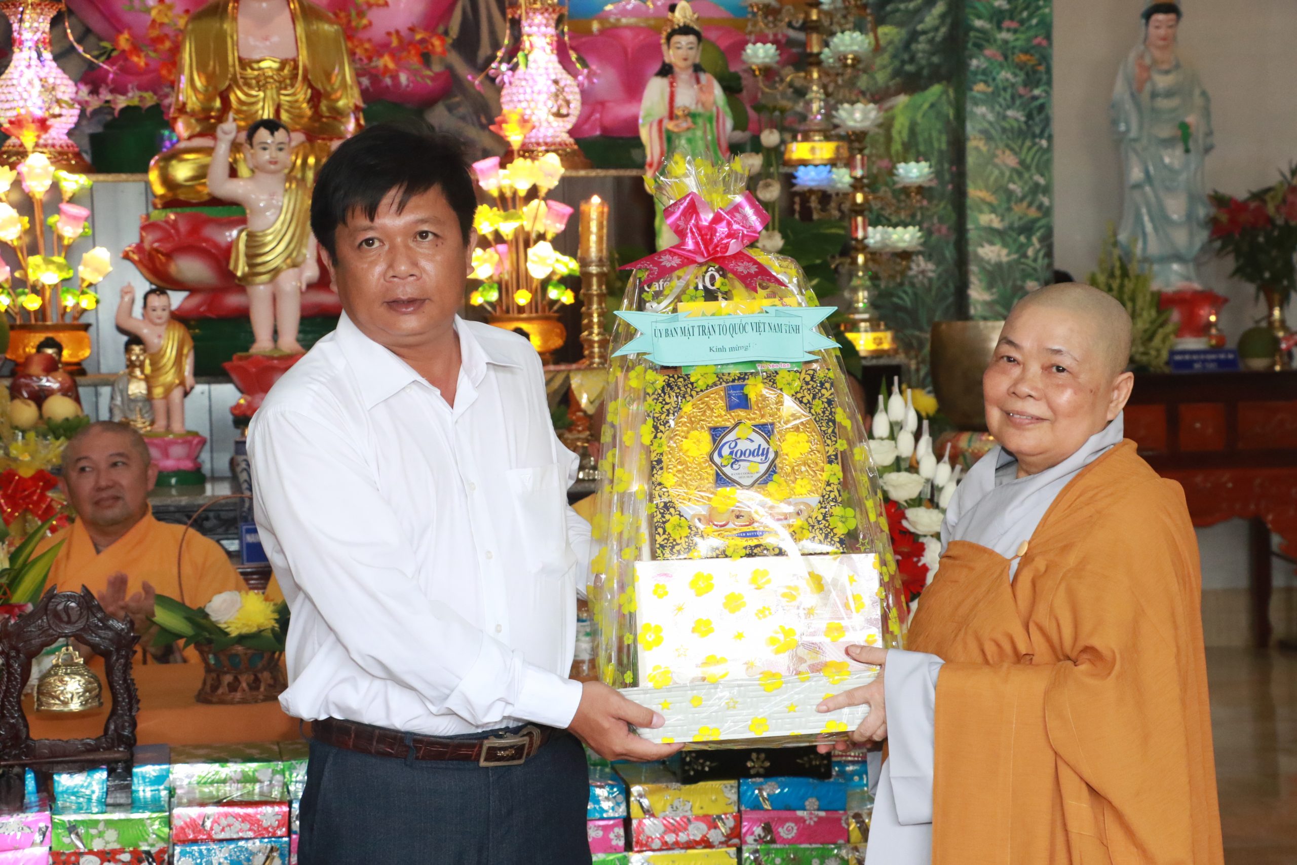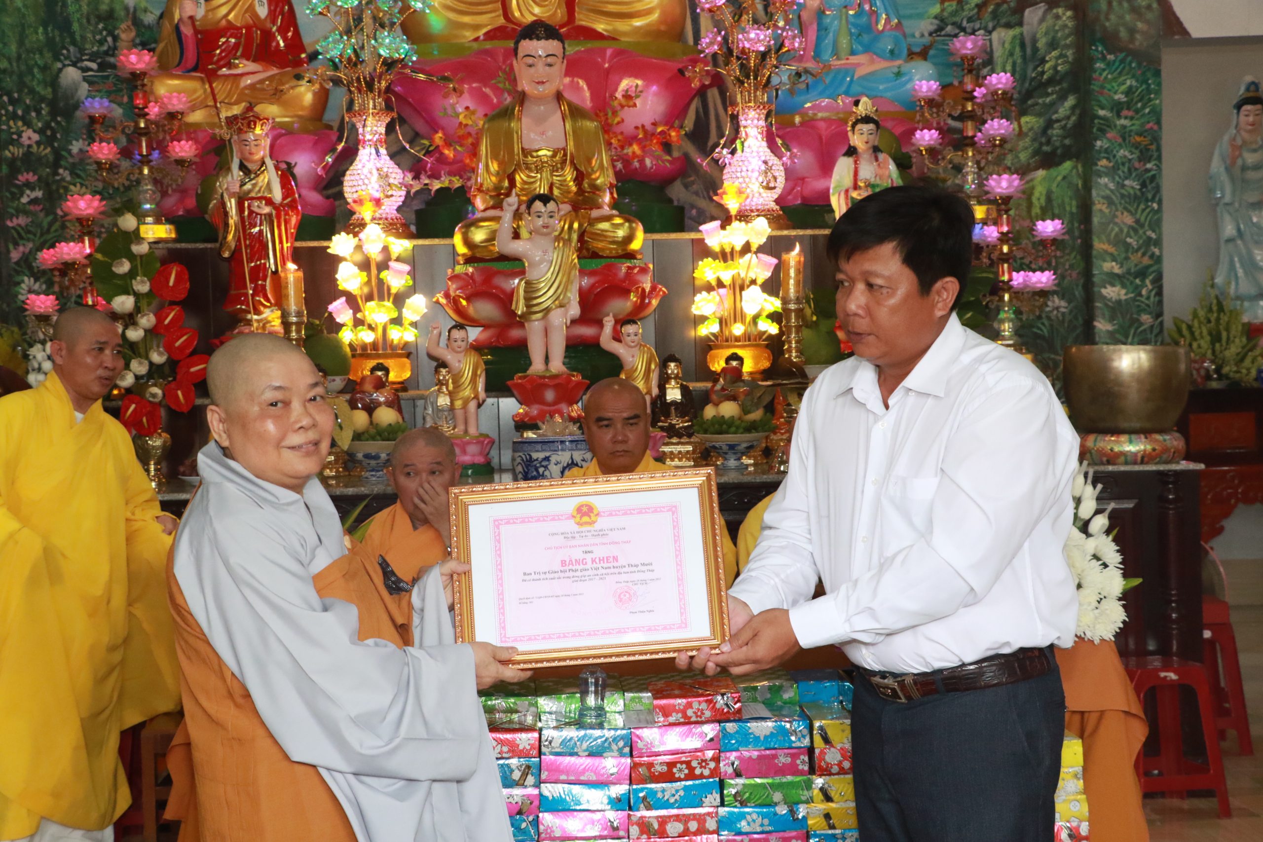 Ông Võ Ngọc Thành - Phó Chủ tịch UBMTTQVN tỉnh trao tặng giấy khen đến Ni sư Thích nữ Như Châu
