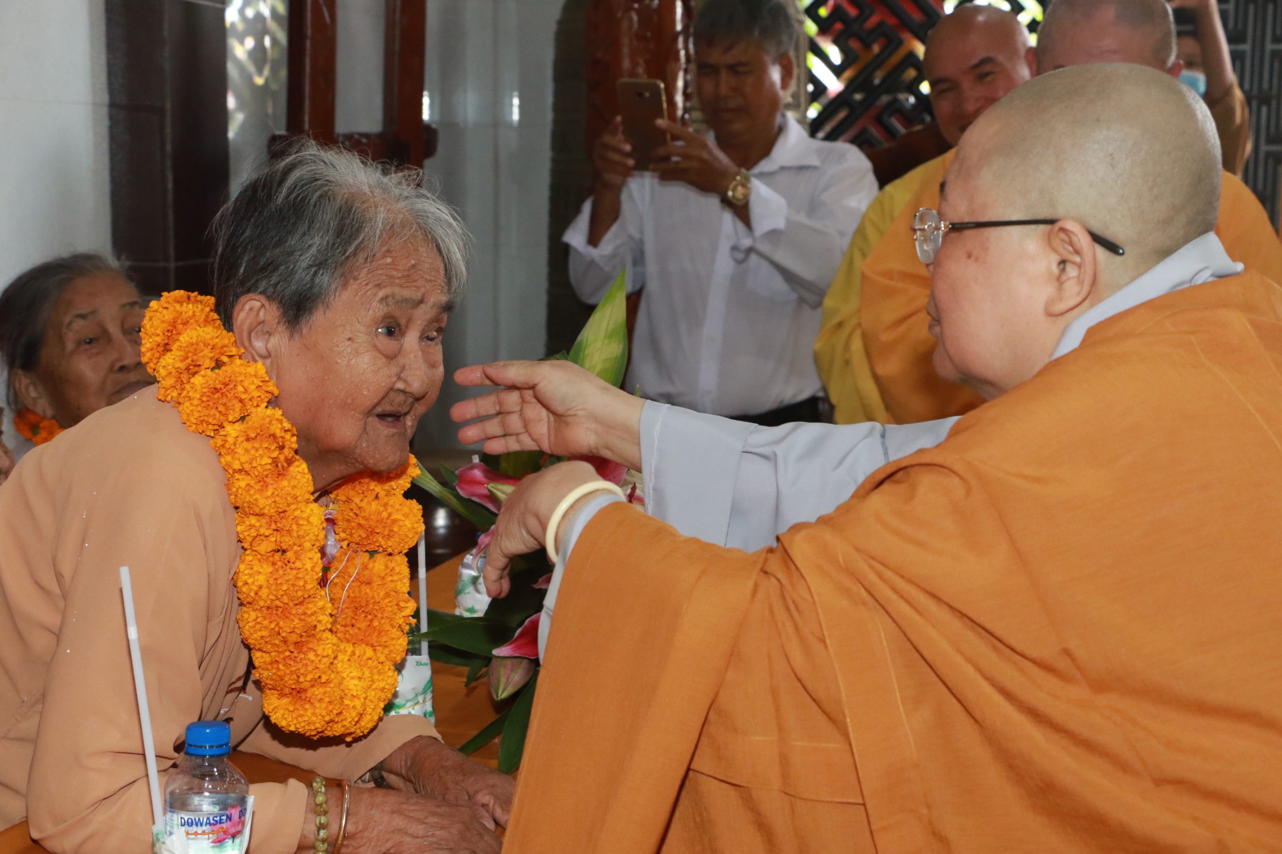 Chư Tôn đức chứng minh gửi tặng những tràng hoa, những chiếc bánh kem chúc thọ đến các cụ