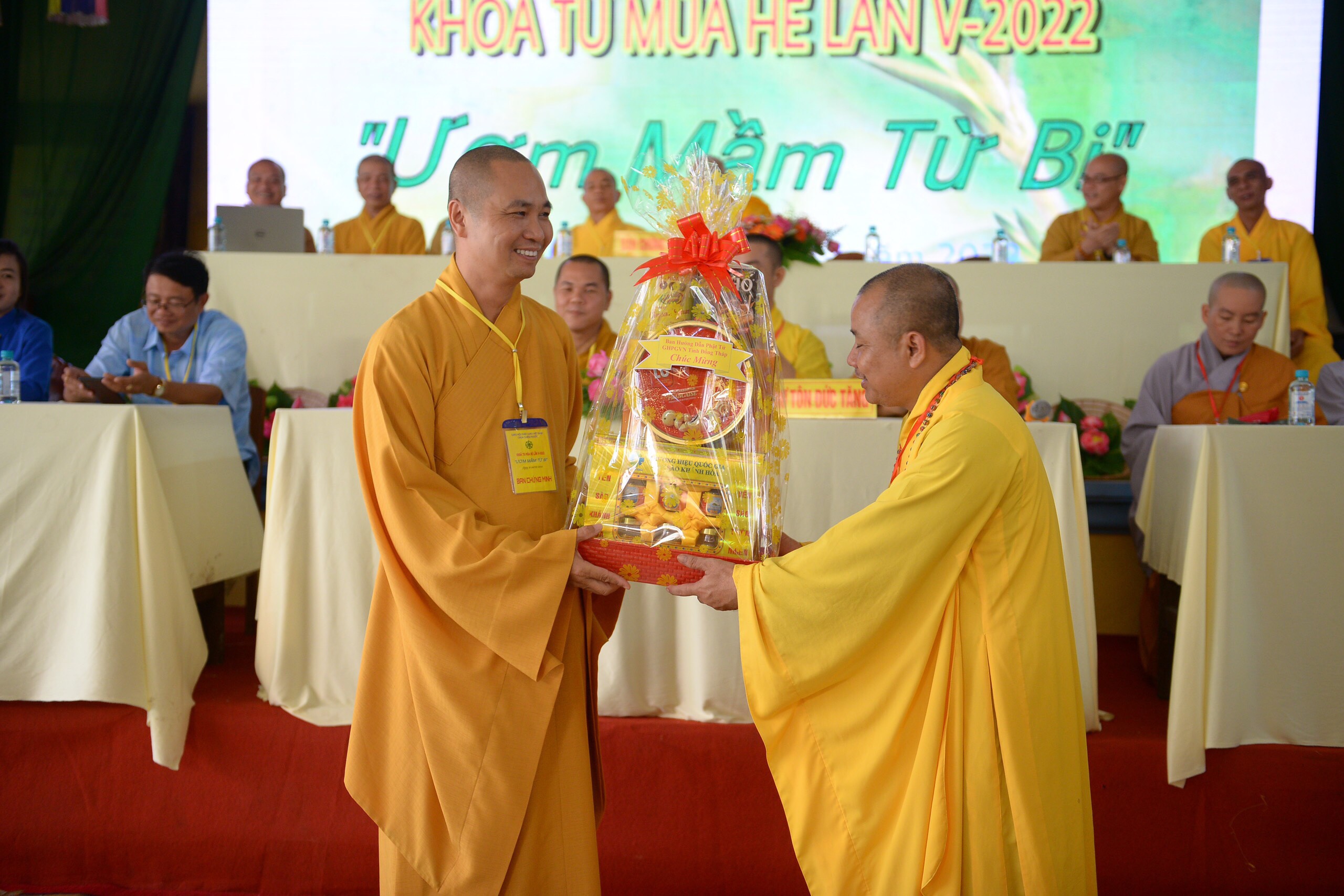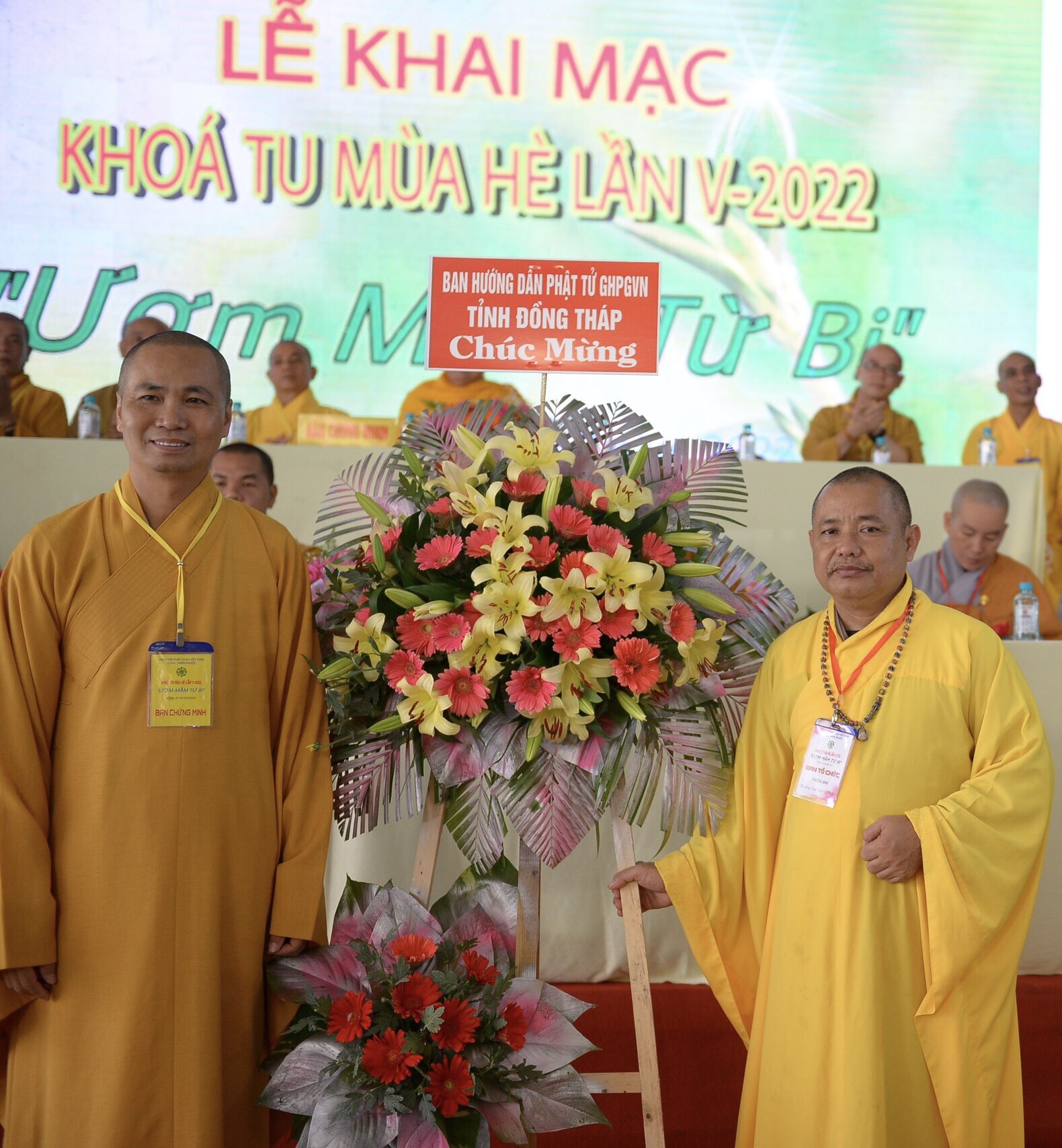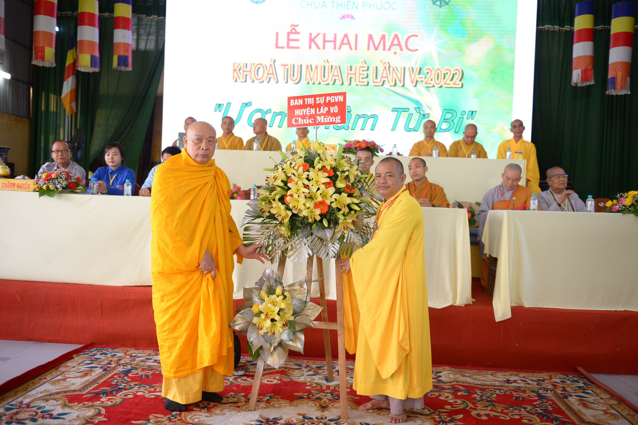 TT. Thích Huệ Thủ, Uỷ viên Thường trực BTS GHPGVN tỉnh, Trưởng ban Trị sự GHPGVN huyện Lấp Vò tặng hoa và phát biểu chúc mừng đến chùa Thiên PhướcSư cô Thích nữ Liên Hiền, Phó ban Tổ chức báo cáo và chương trình khoá tu mùa hè chủ đề “Ươm mầm Từ Bi” được sinh hoạt 04 ngày từ 21 đến 24/7/2022. Đại đức Thích An Nhứt, điều phối khoá tu thông qua nội quy khoá tu mùa hè năm 2022.