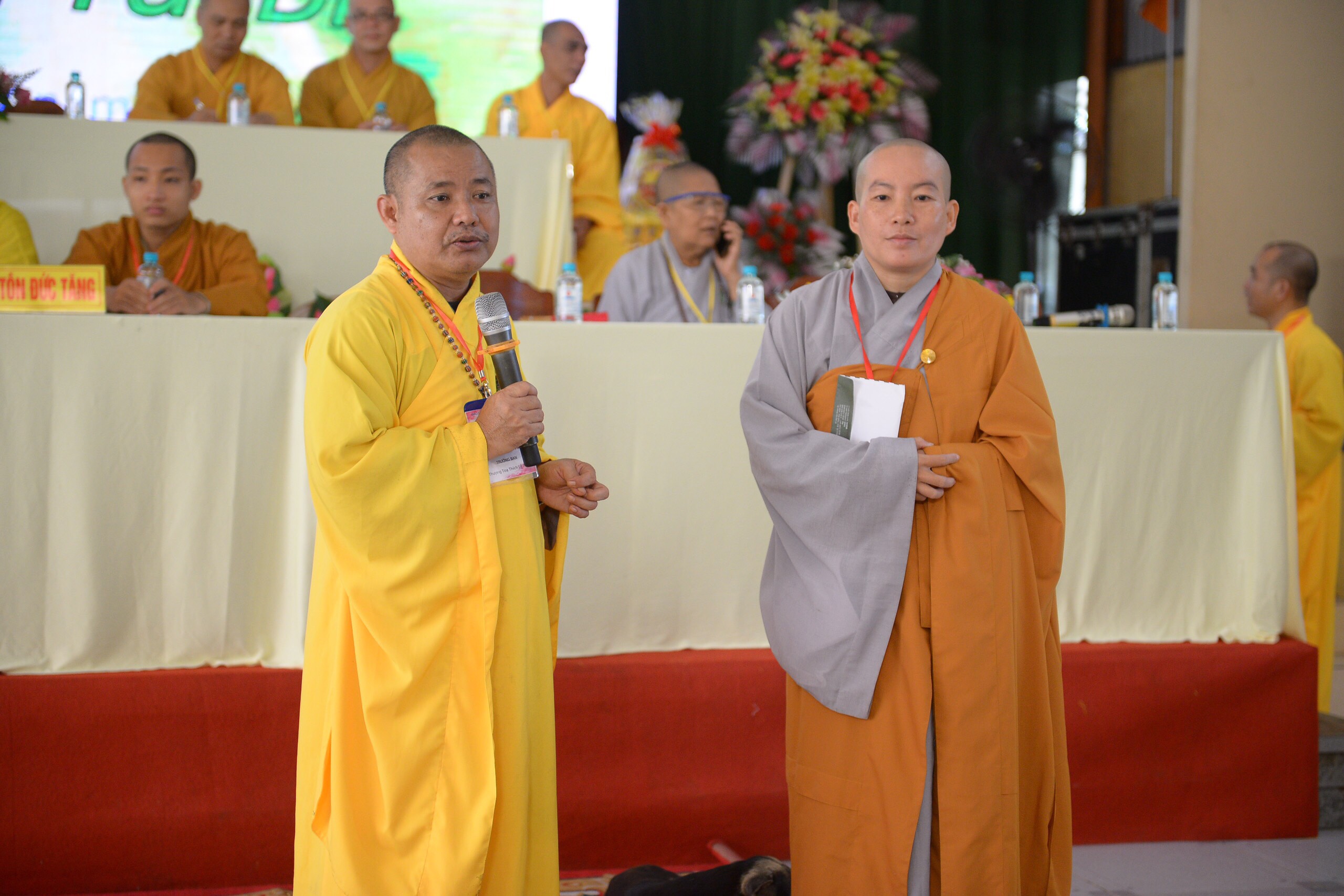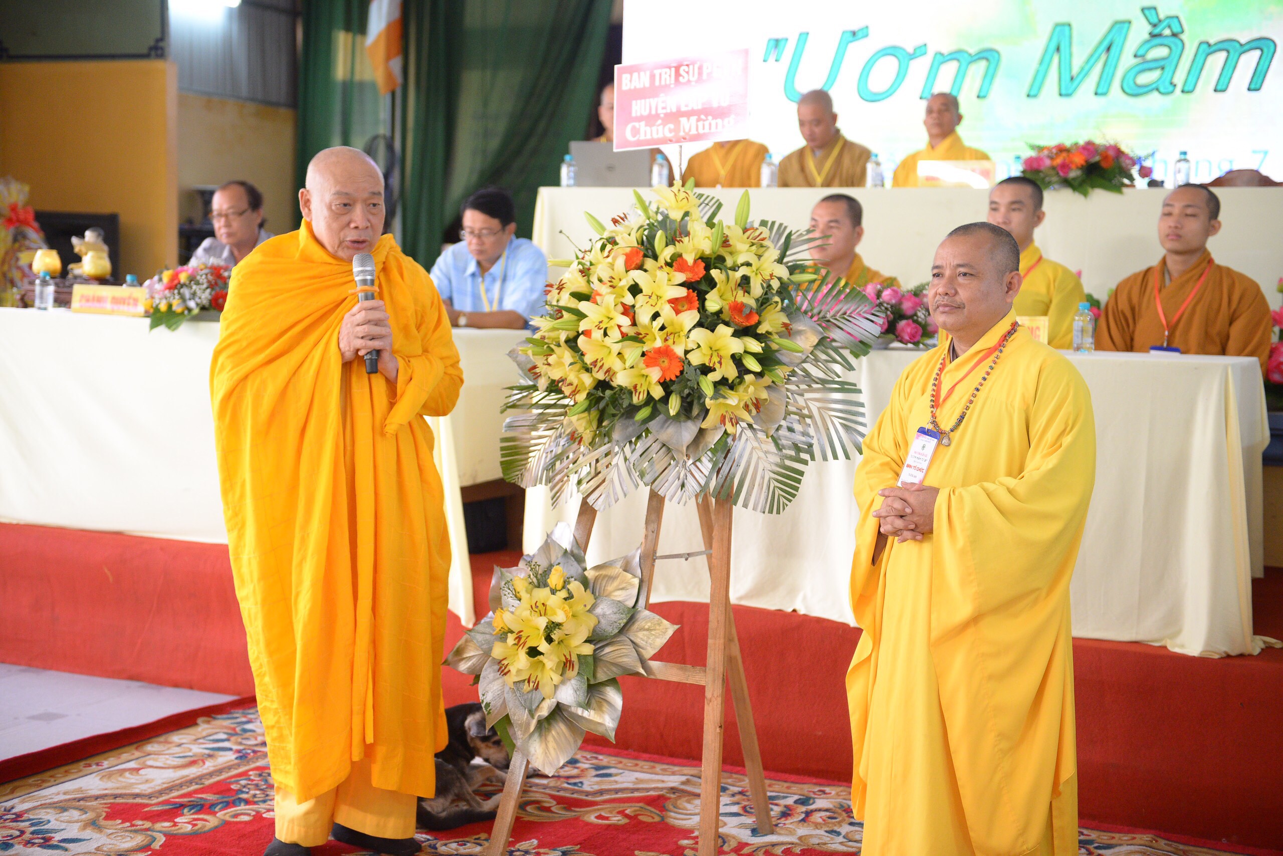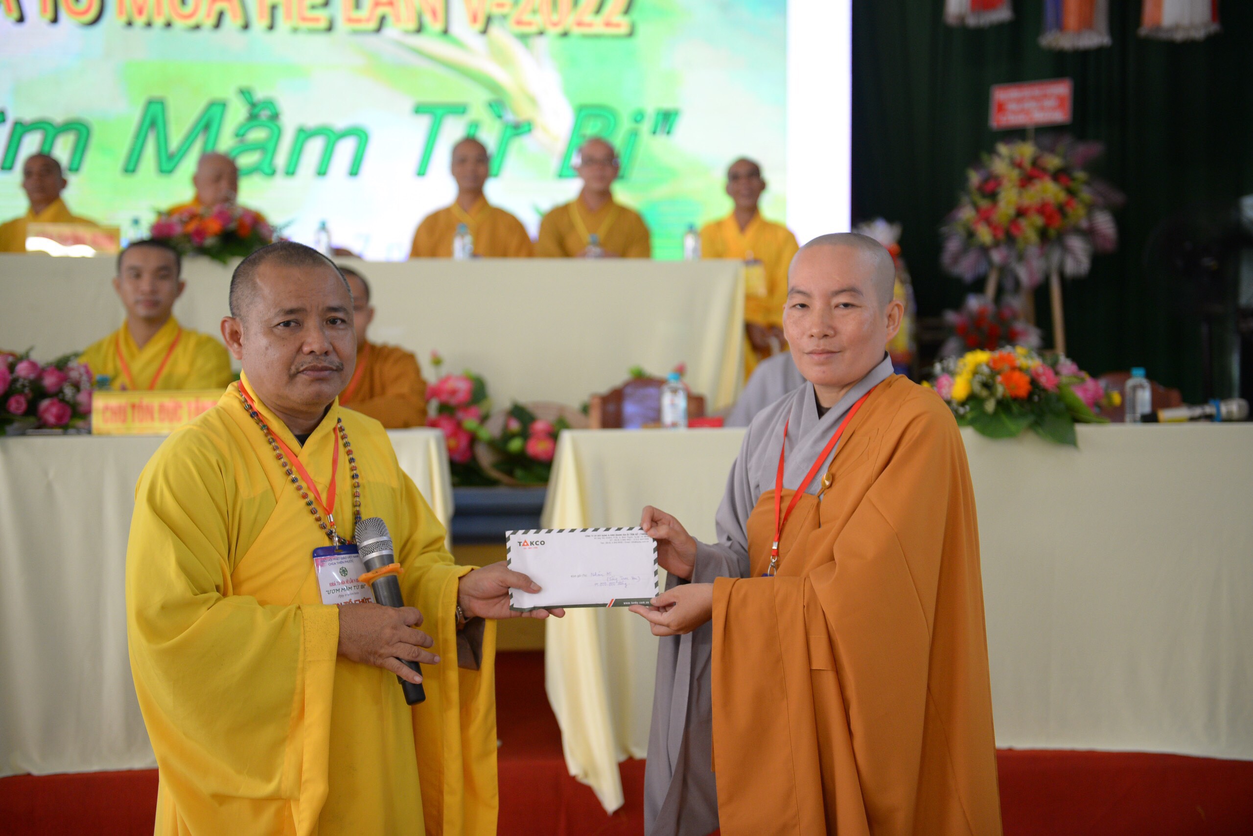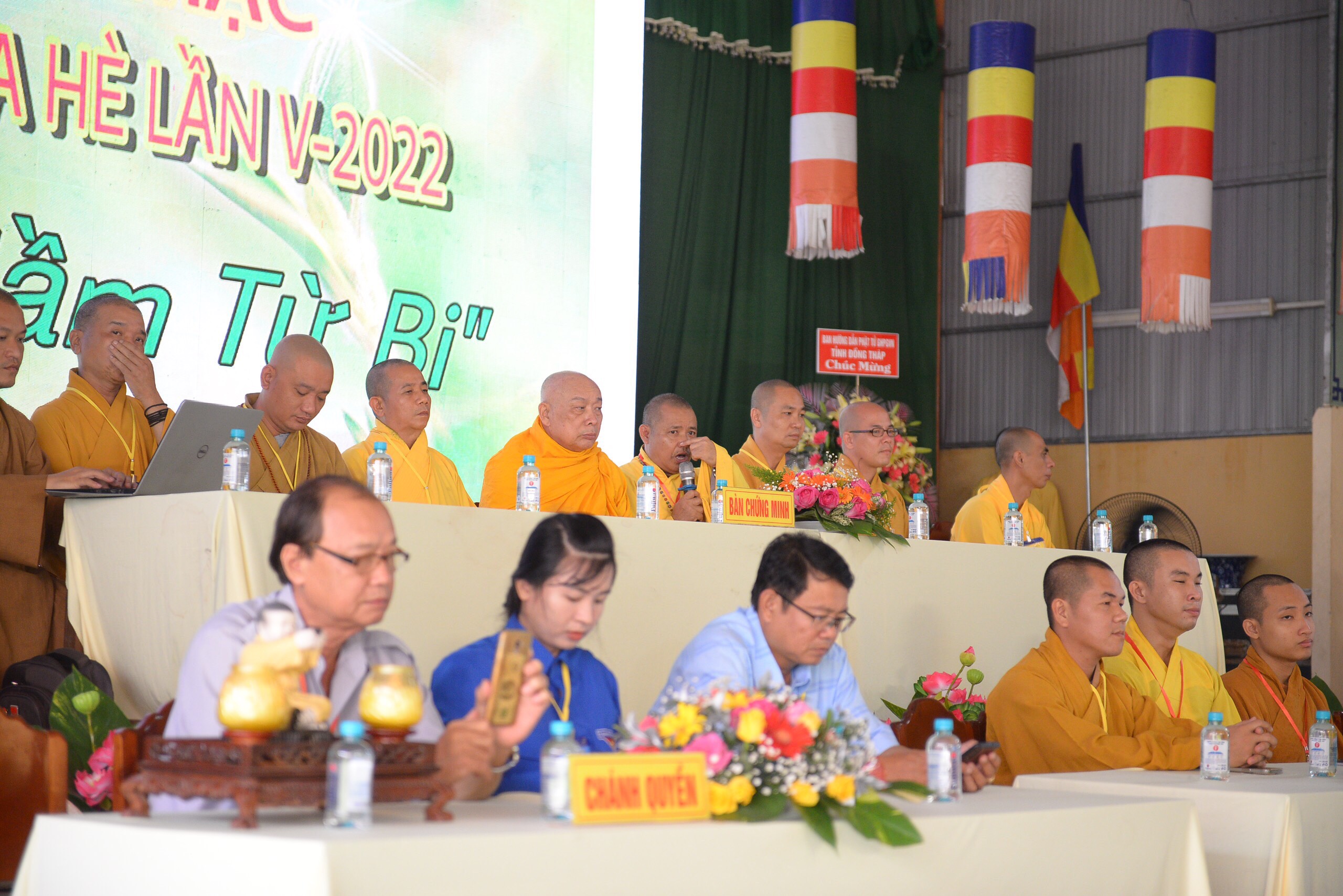 TT. Thích Huệ Thủ, Uỷ viên Thường trực BTS GHPGVN tỉnh, Trưởng ban Trị sự GHPGVN huyện Lấp Vò tặng hoa và phát biểu chúc mừng đến chùa Thiên PhướcSư cô Thích nữ Liên Hiền, Phó ban Tổ chức báo cáo và chương trình khoá tu mùa hè chủ đề “Ươm mầm Từ Bi” được sinh hoạt 04 ngày từ 21 đến 24/7/2022. Đại đức Thích An Nhứt, điều phối khoá tu thông qua nội quy khoá tu mùa hè năm 2022.