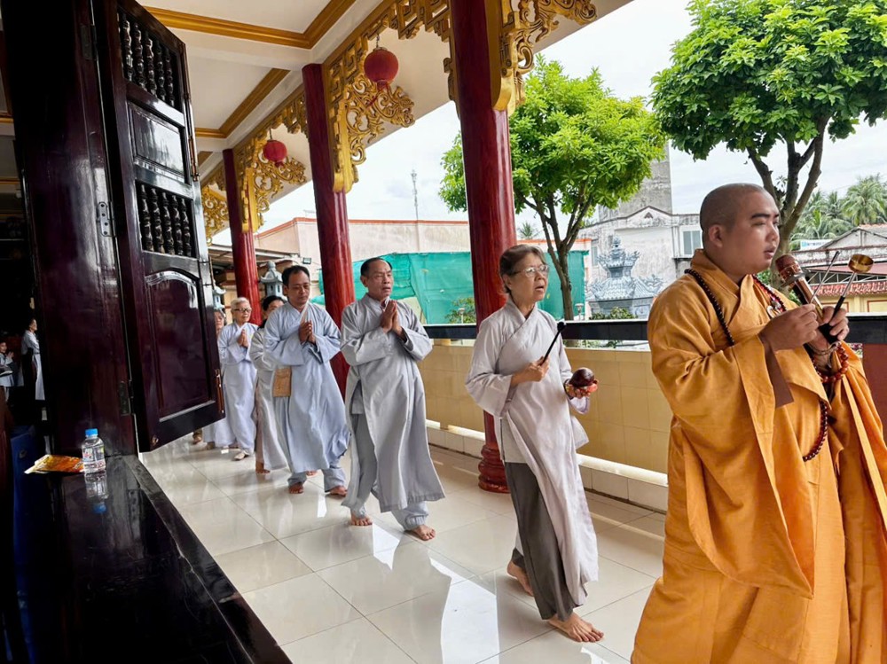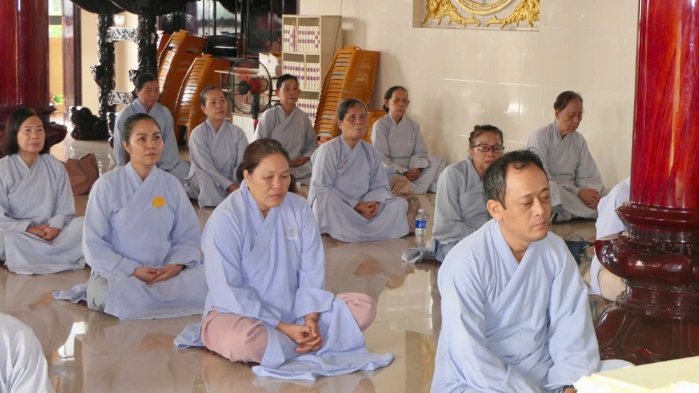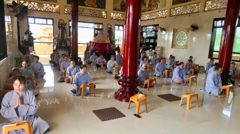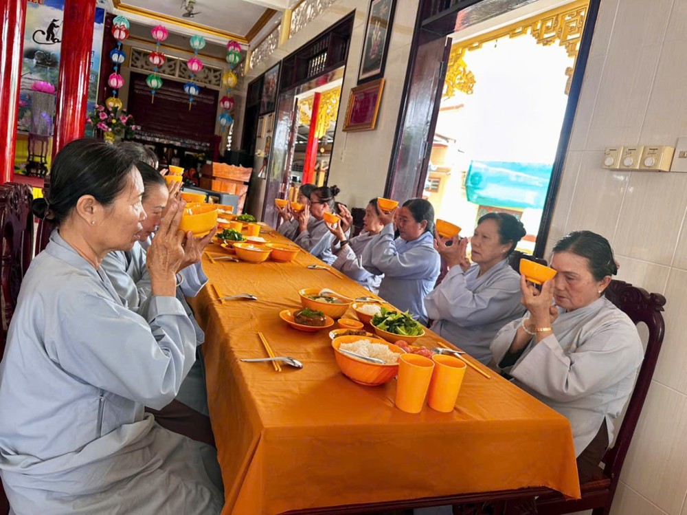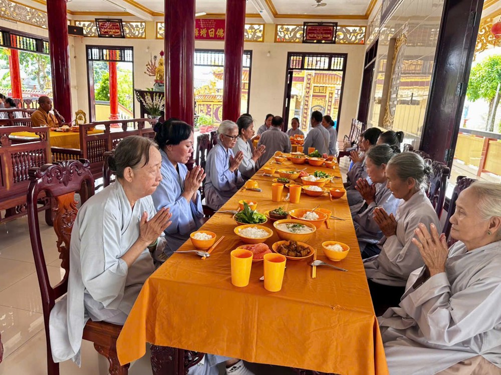 Tiếp nối chương trình, 9 giờ 30, đại chúng tụng kinh Sám Hối Sáu Căn, sau đó cúng ngọ trong không khí trang nghiêm. Đến 11 giờ, Phật tử thọ trai và đi kinh hành niệm Phật.