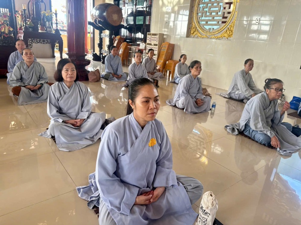 Buổi chiều, lúc 13 giờ 30, đại chúng cùng thực tập ngồi thiền an trú chánh niệm; 14 giờ tụng các bộ Kinh Tám Điều – Kinh Từ Tâm – Kinh Châu Báu – Kinh Lòng Từ – Kinh Điềm Lành, rồi tiếp tục niệm Phật cho đến 16 giờ, khép lại một ngày tu tập đầy pháp hỷ.