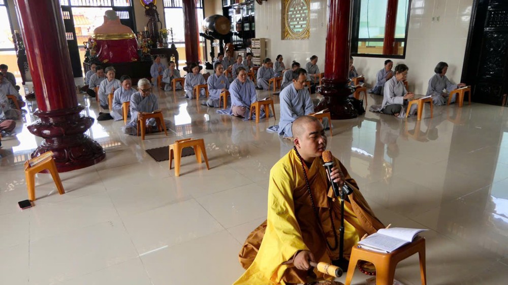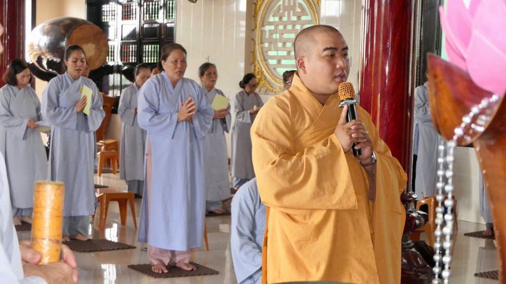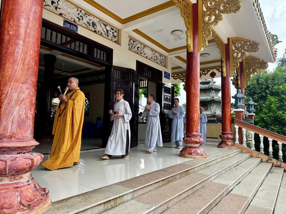 Đúng 7 giờ 30, đại diện đạo tràng tác bạch cần cầu Đại đức Thích Thiên Bình – Tăng chúng chùa Linh Sơn, truyền trao giới pháp Bát Quan trai. Trong lời sách tấn, Đại đức nhấn mạnh ý nghĩa giữ giới trong một ngày một đêm thanh tịnh giúp hành giả dừng lại các tập khí bất thiện, làm mới thân tâm và gieo trồng căn lành hướng đến an lạc.