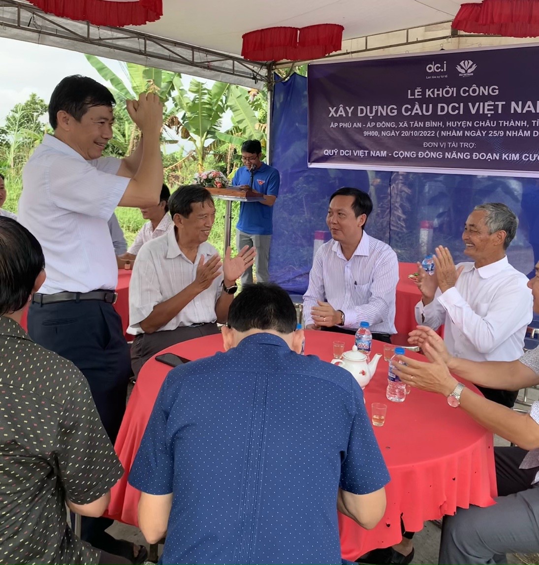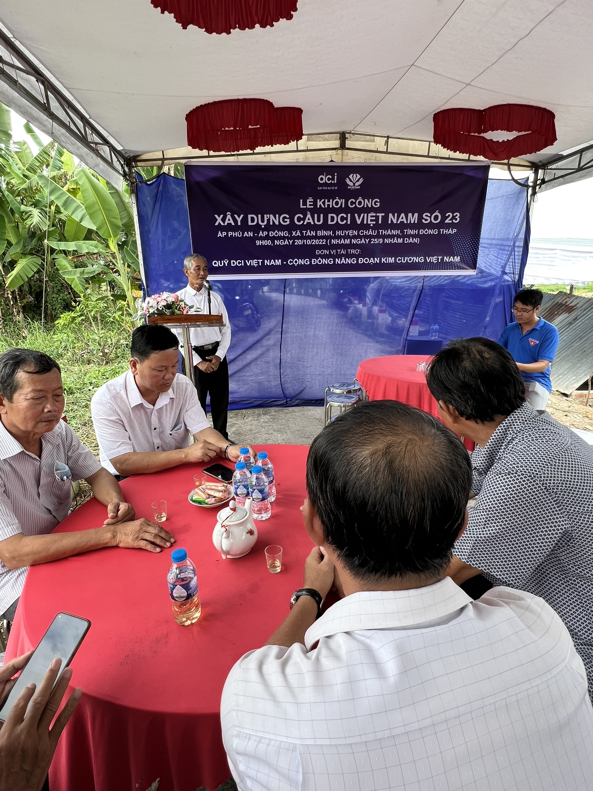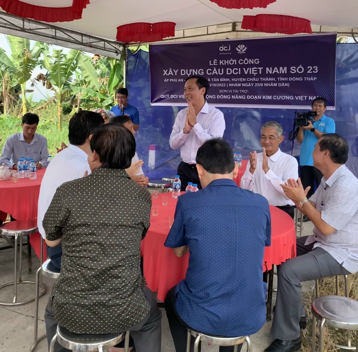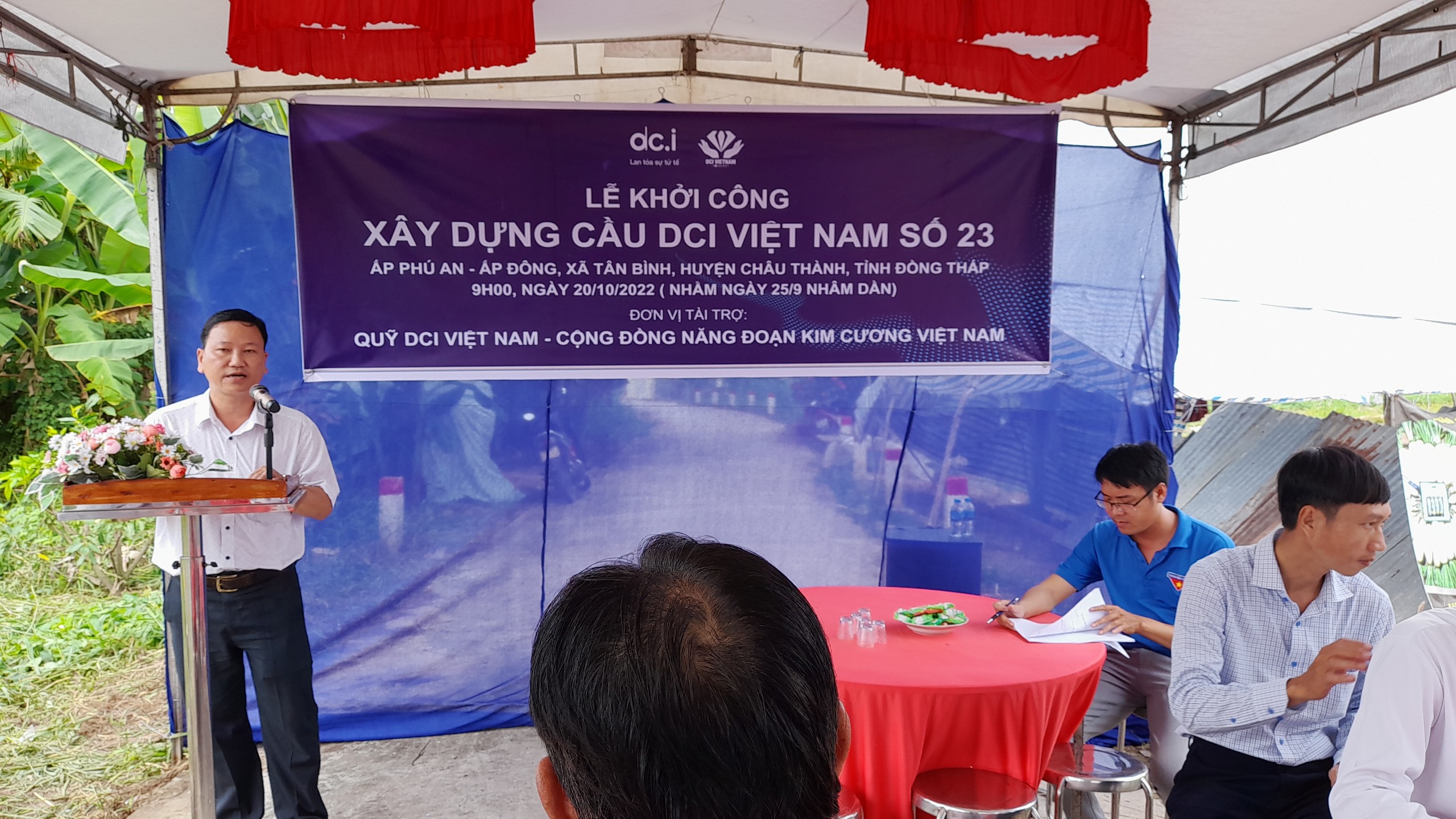 Có được kết quả tổ chức buổi lễ khởi công hôm nay là có sự quan tâm của các cấp, các ngành, đơn vị tài trợ quỹ DCI Việt Nam – Cộng đồng Năng đoạn Kim cương Việt Nam và bà con nhân dân trong và ngoài xã. Cuối lời, ông gửi lời cám ơn sự quan tâm của các cấp lãnh đạo, đơn vị tài trợ đã đóng góp phần lớn kinh phí để xây dựng cầu, đồng thời cảm ơn chú Hai Lúa và các anh trong đội thi công cầu đã hướng dẫn kỹ thuật xây dựng cầu và hứa sẽ sớm hoàn thành việc xây cầu theo kế hoạch.