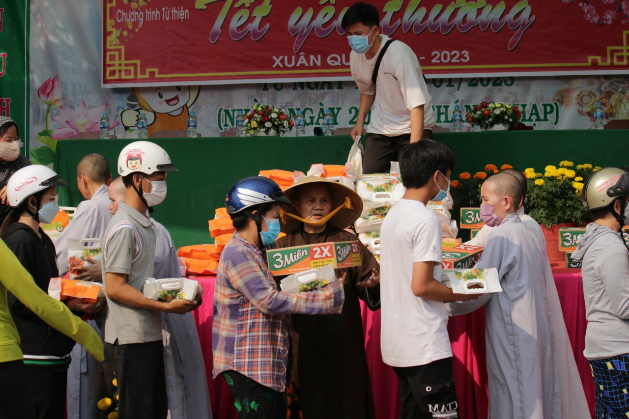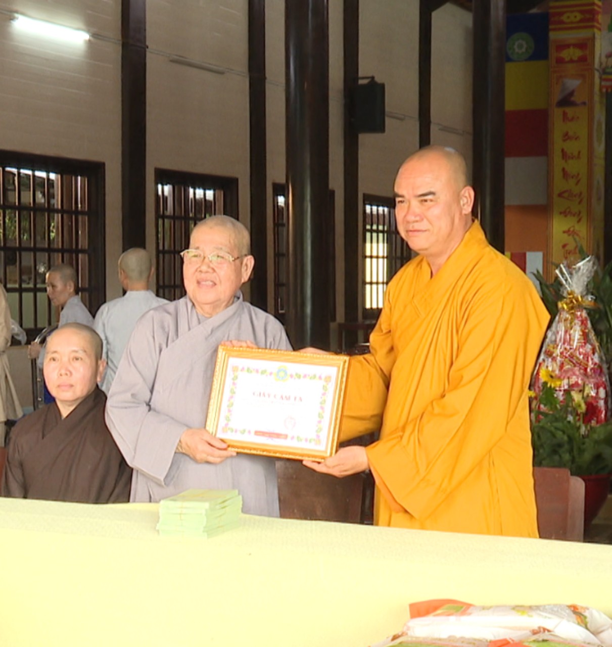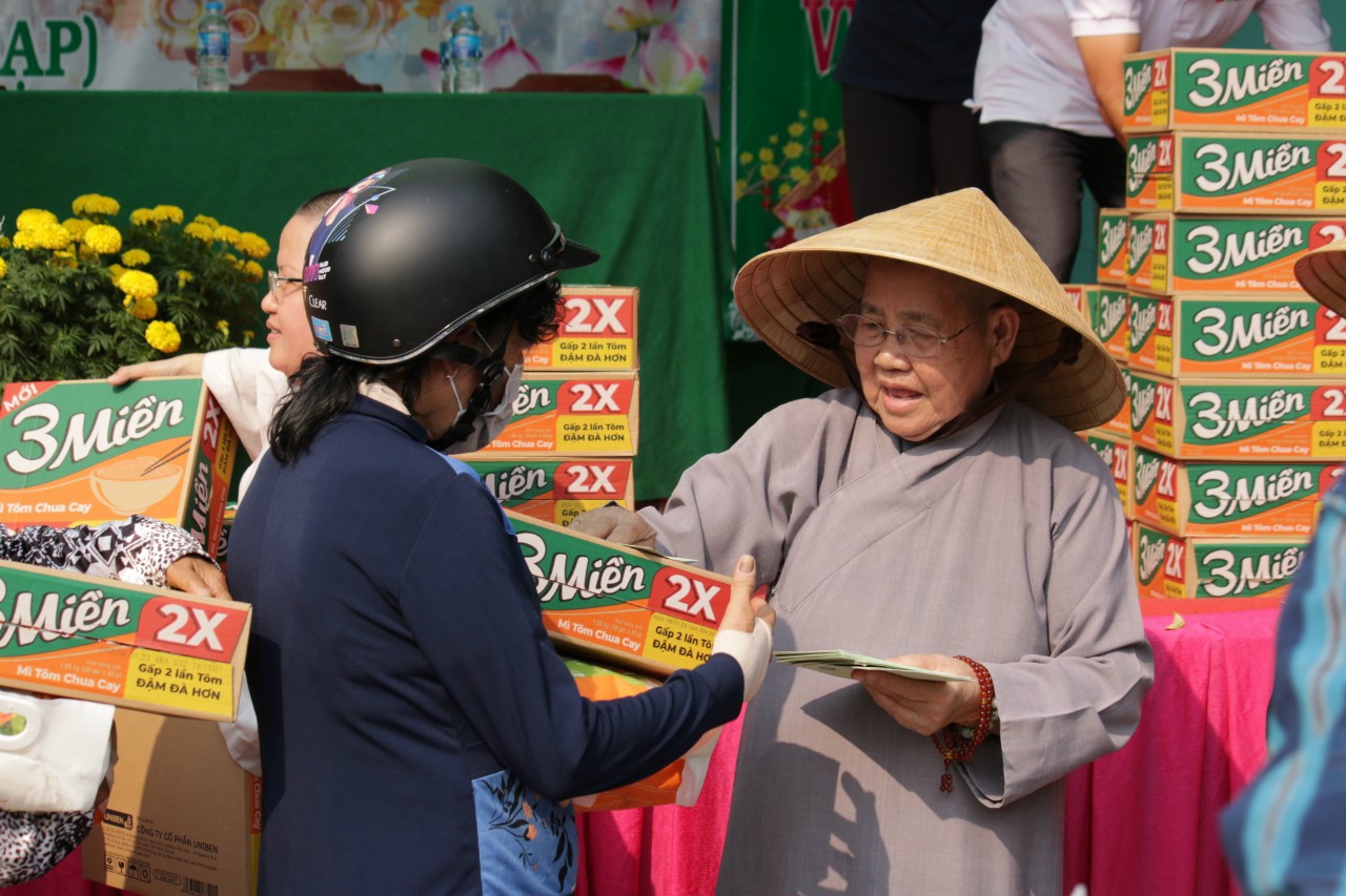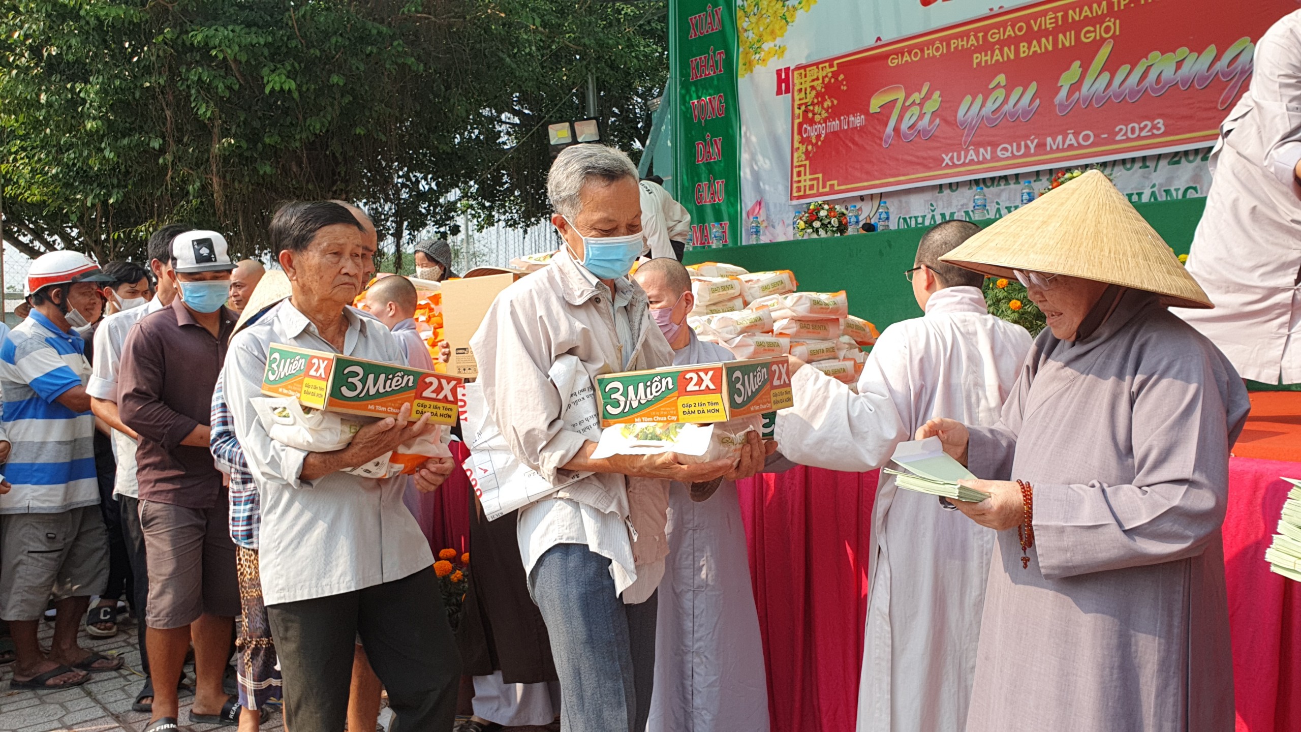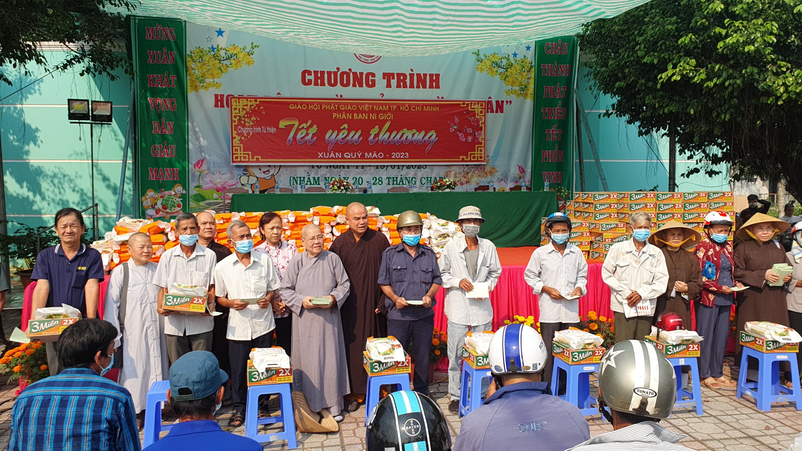 Phát biểu tại buổi lễ, NT. Thích Nữ Từ Nhẫn chia sẻ, một mùa xuân mới đã về, nhà nhà nô nức chuẩn bị đón chào mùa Tết đoàn viên, ấm áp bên gia đình. Đây là khoảng thời gian mà chư Ni trong Ban Ni Giới Tp Hồ Chí Minh vận động chư Tôn đức Ni trụ trì các cơ sở Tự viện tại TP Hồ Chí Minh cũng như quý Phật tử, mạnh Thường quân triển khai chương trình từ thiện “Quà Tết yêu thương” hỗ trợ bà con ở 4 tỉnh miền Tây: Kiên Giang, An Giang, Cần Thơ và Đồng Tháp với mục đích hướng tới những hoàn cảnh khó khăn, nhằm giúp tất cả mọi người có được một năm mới hạnh phúc, viên mãn.