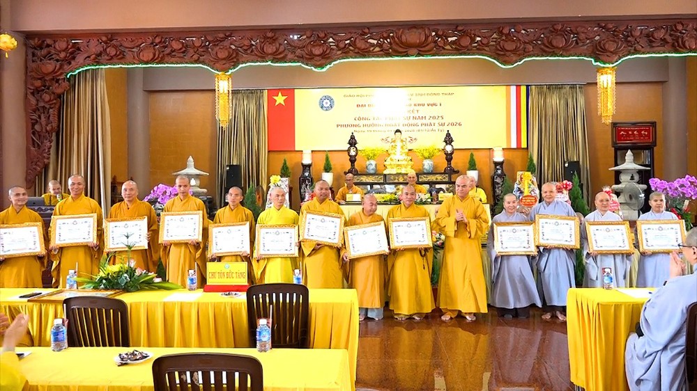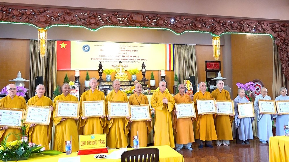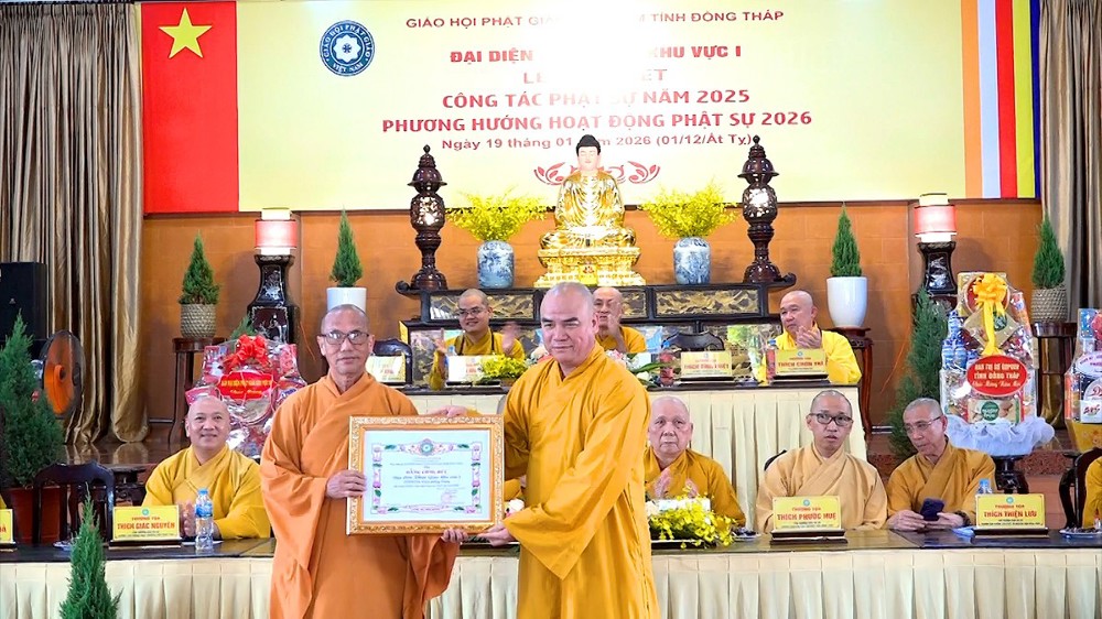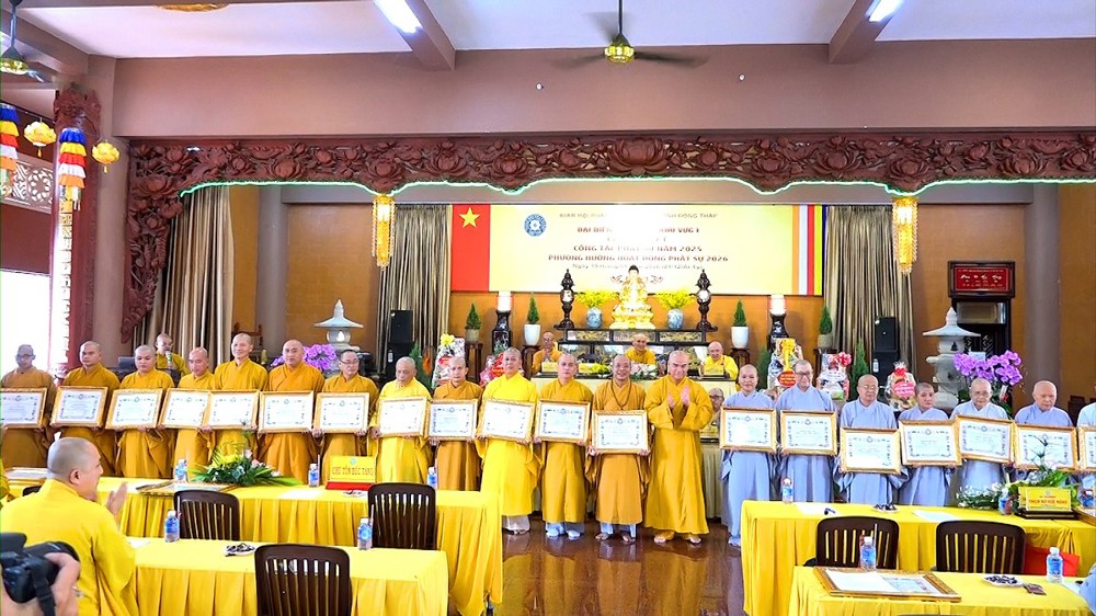 Để ghi nhận những đóng góp to lớn đó, Ban Trị sự GHPGVN tỉnh Đồng Tháp đã trao tặng Bằng Công đức cho chư Tôn đức Trưởng, Phó khu vực I cùng chư Tôn đức trụ trì các tự viện đã có thành tích xuất sắc trong công tác Phật sự năm qua.