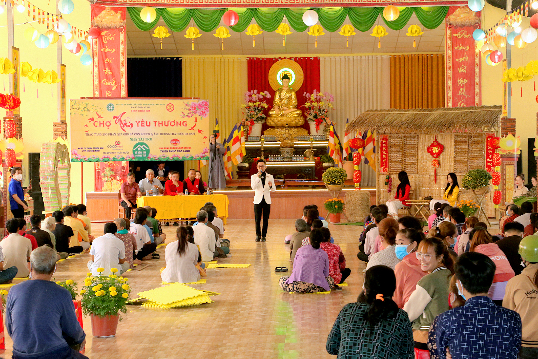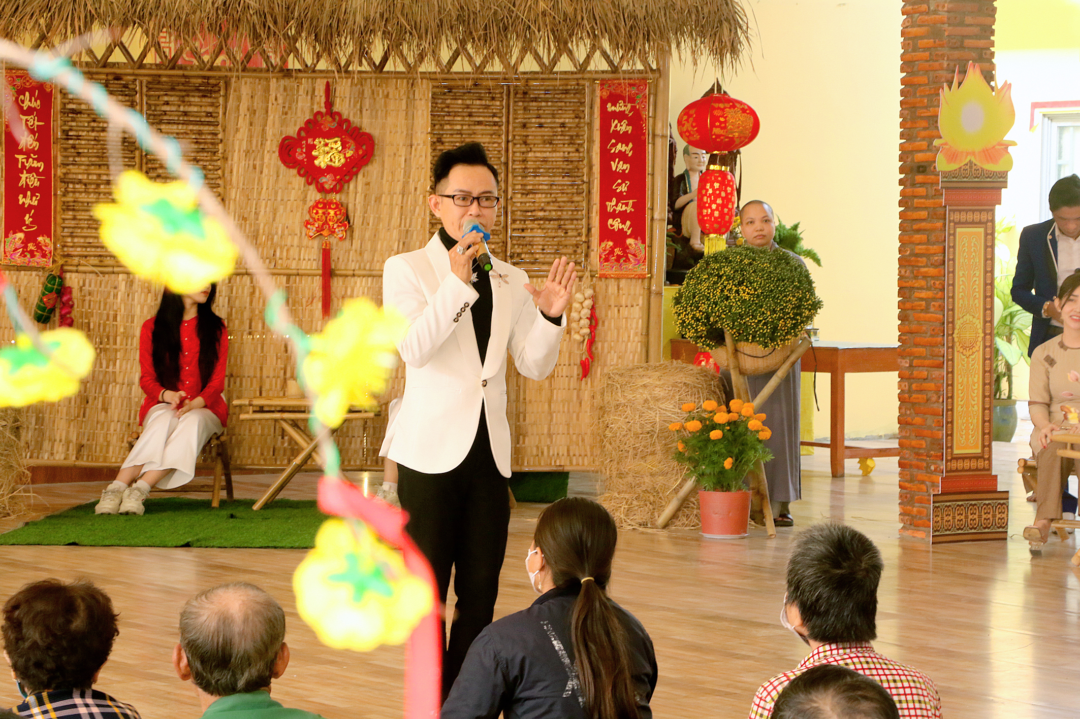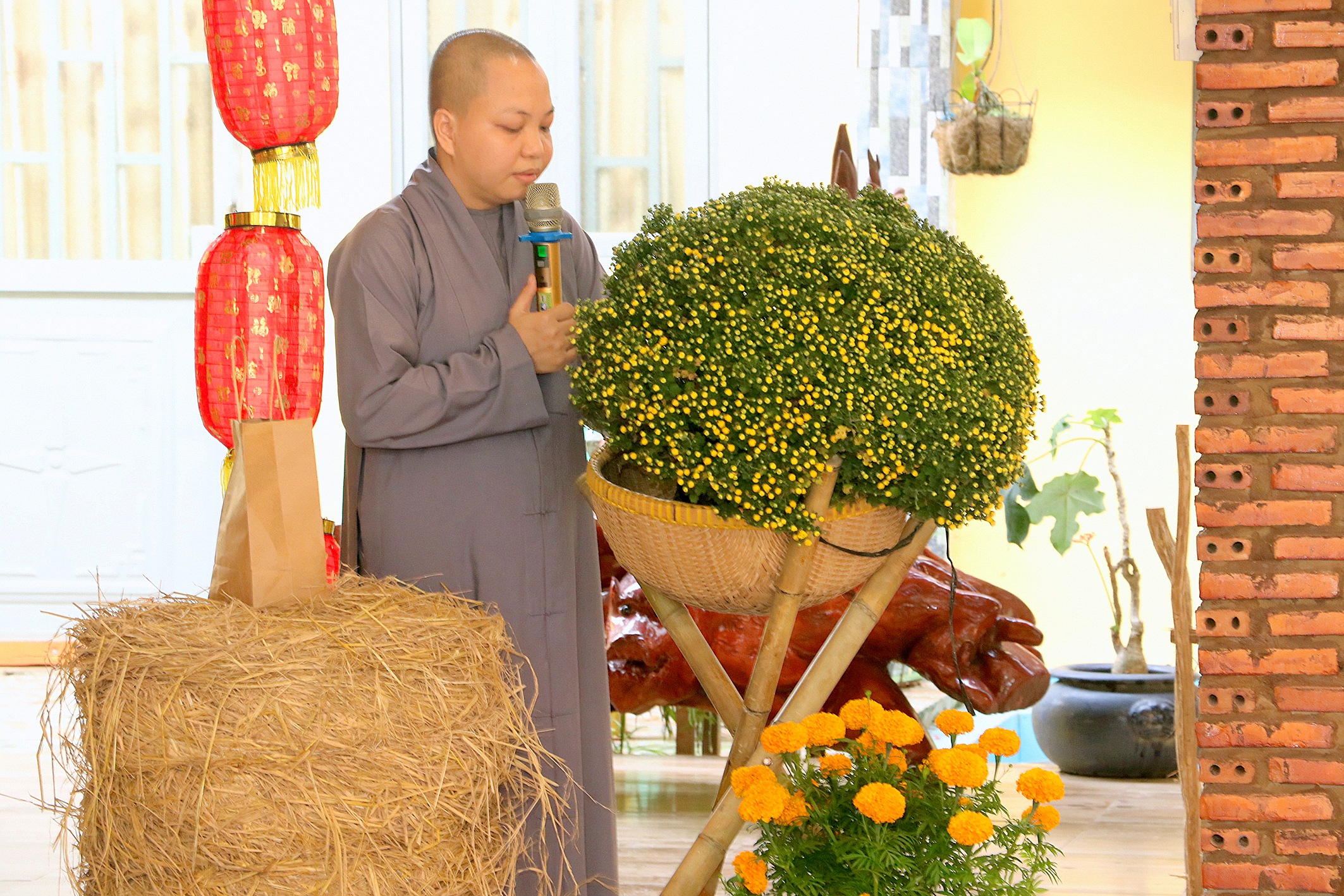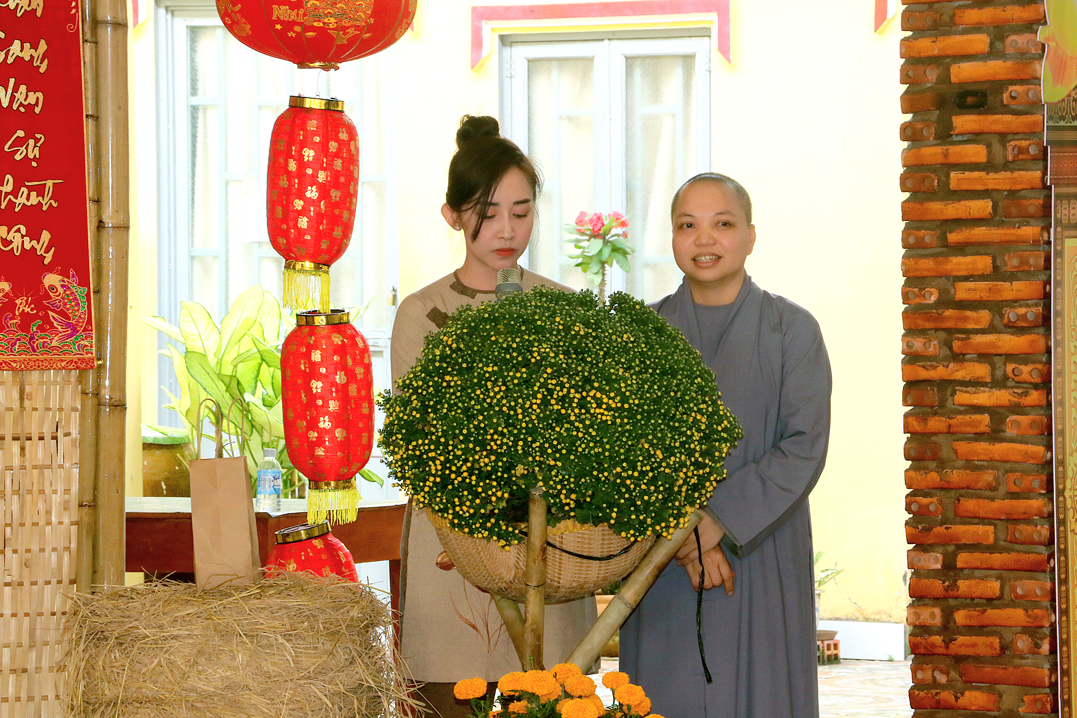 Thay mặt Ban Tổ chức, Sư cô TN. Như Ánh dẫn chương trình văn nghệ đón Xuân, và hướng dẫn tình nguyện viên phát quà theo hình thức phiên chợ “Xuân Yêu Thương”, để mang niềm vui khi đón nhận những món quà đầy nghĩa tình nhân dịp Xuân Quý Mão đang gần kề.