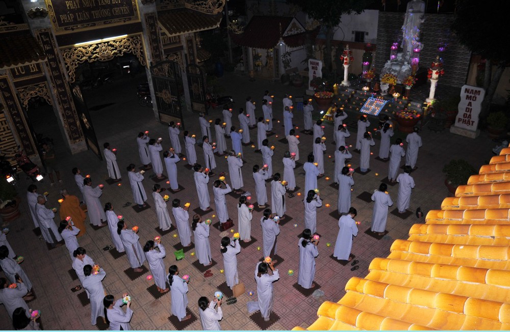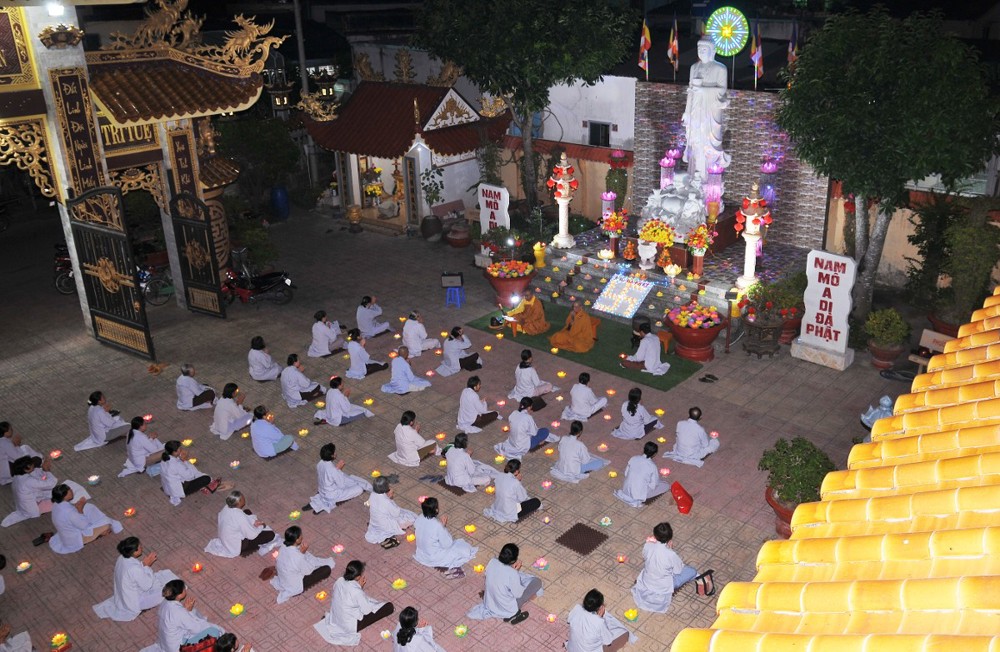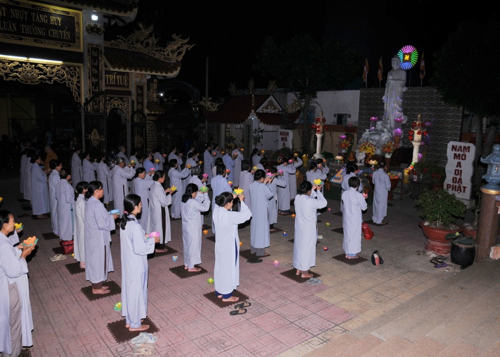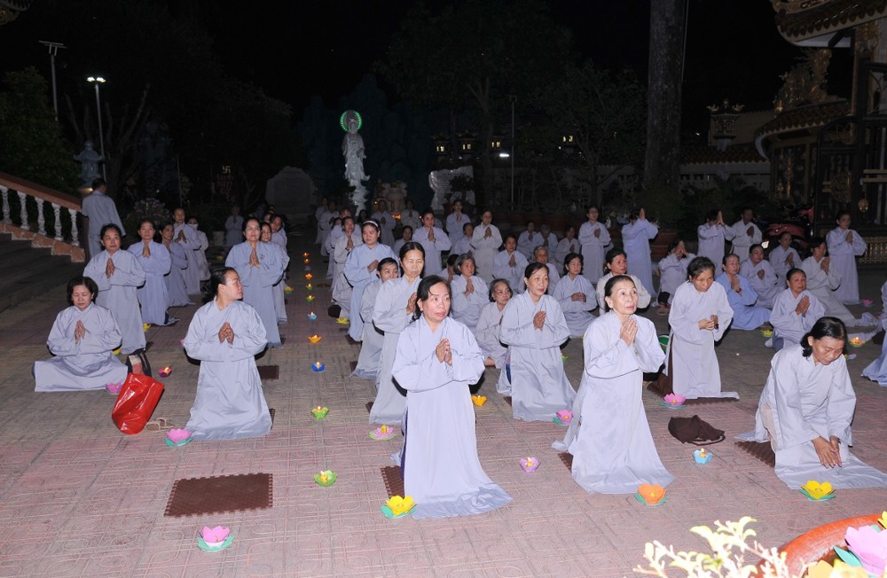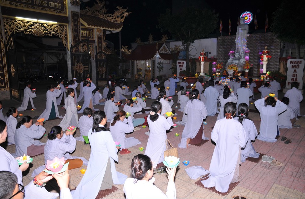 Dưới bầu trời đêm tĩnh lặng, trong không gian cổ kính của già lam, hàng trăm ngọn hoa đăng được thắp sáng lung linh, tượng trưng cho ánh sáng trí tuệ và lòng từ bi vô lượng của Đức Phật A Di Đà. Mỗi ngọn đèn là một tâm niệm thanh tịnh, một lời cầu nguyện chí thành dâng lên Đức Đạo sư tiếp dẫn chúng sanh về cõi an lạc.