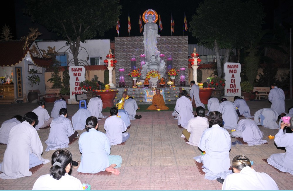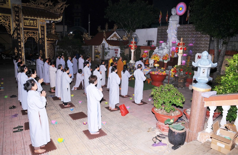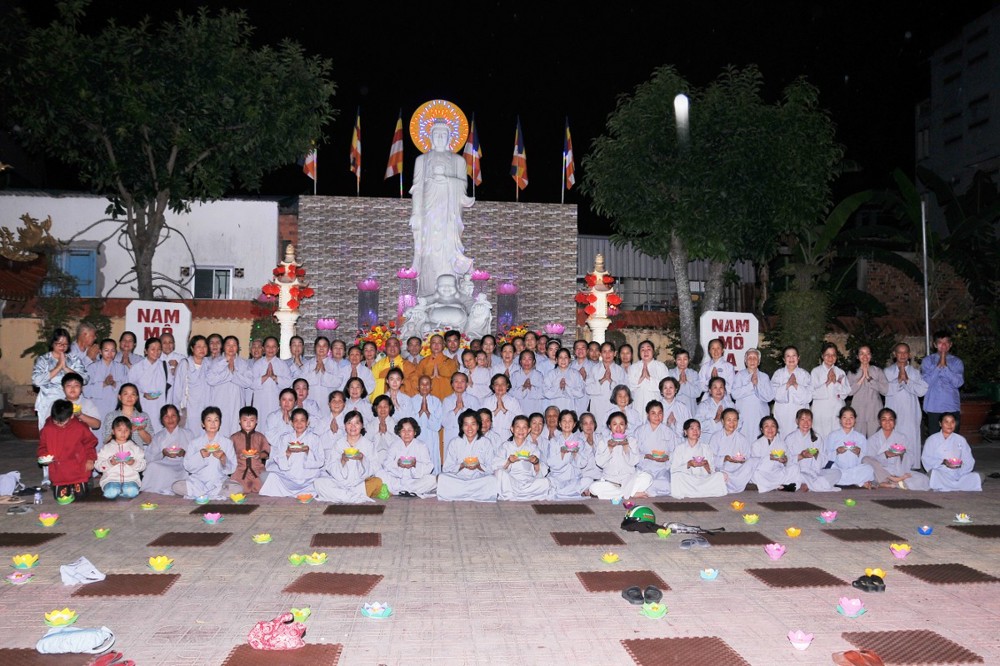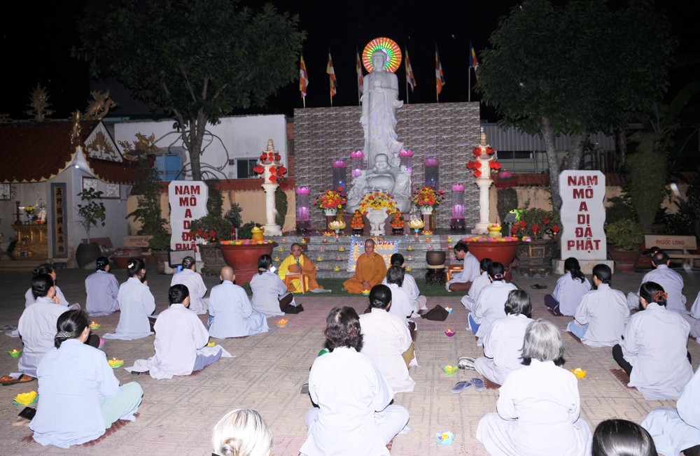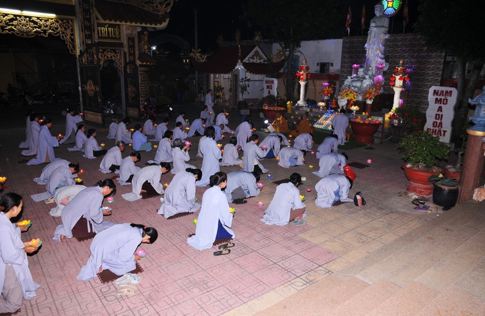 Dưới bầu trời đêm tĩnh lặng, trong không gian cổ kính của già lam, hàng trăm ngọn hoa đăng được thắp sáng lung linh, tượng trưng cho ánh sáng trí tuệ và lòng từ bi vô lượng của Đức Phật A Di Đà. Mỗi ngọn đèn là một tâm niệm thanh tịnh, một lời cầu nguyện chí thành dâng lên Đức Đạo sư tiếp dẫn chúng sanh về cõi an lạc.
