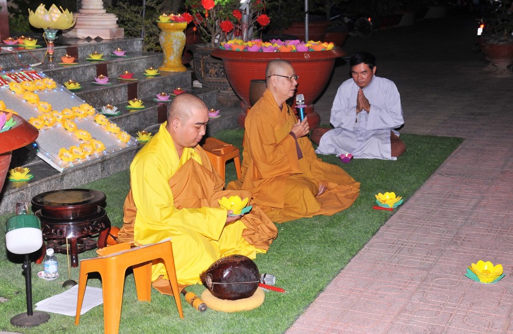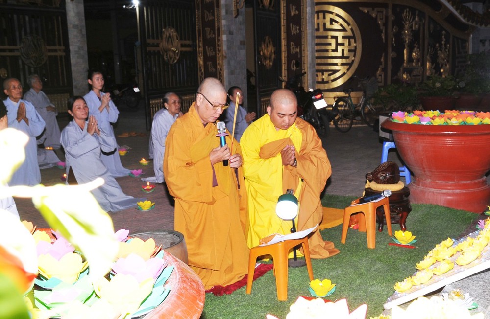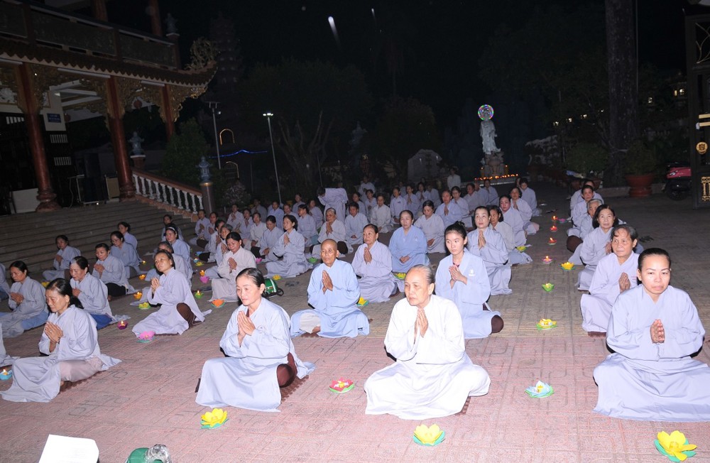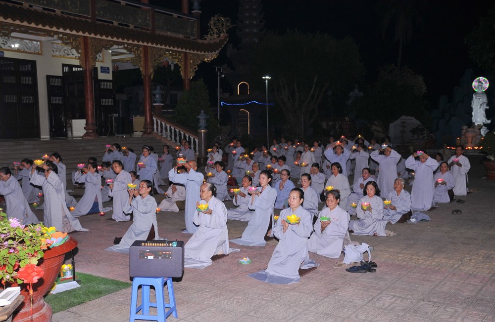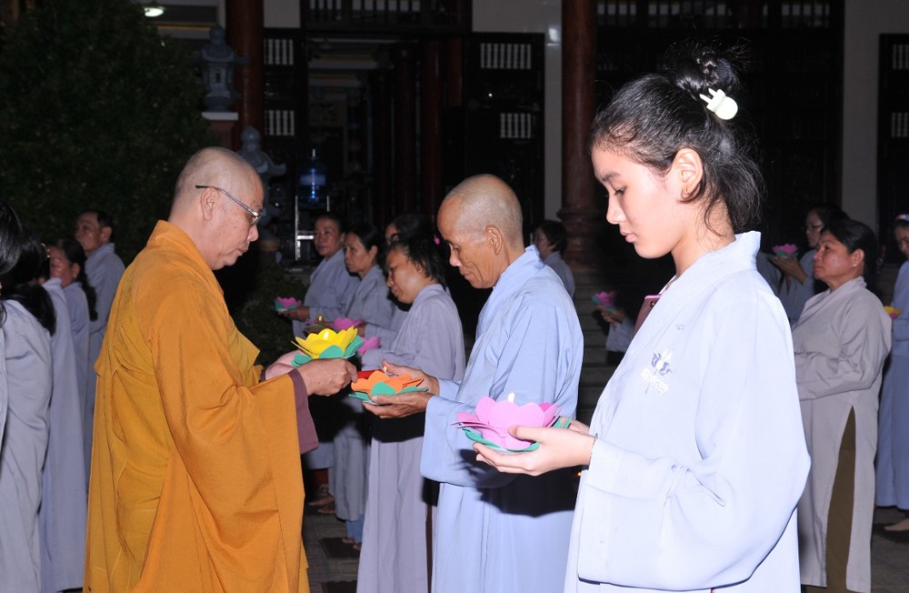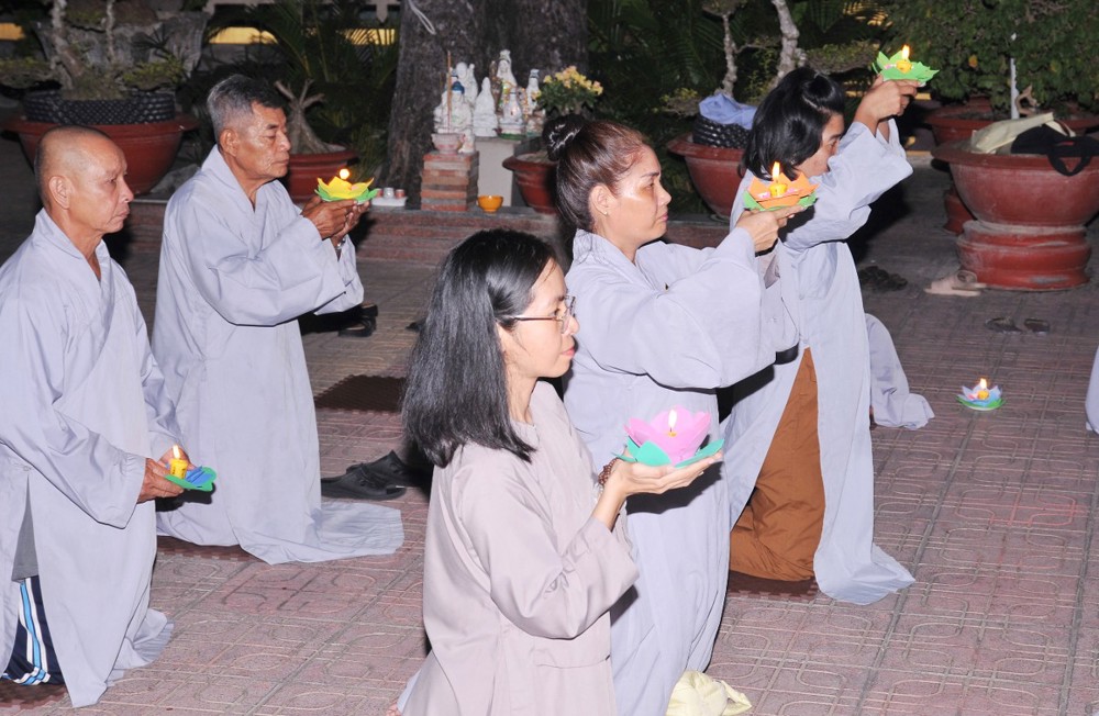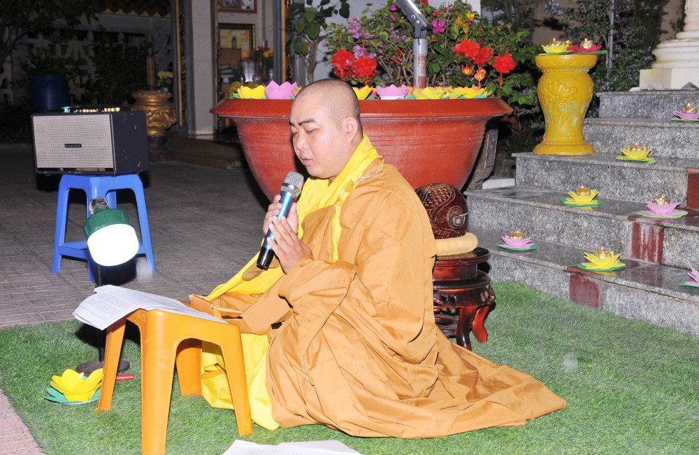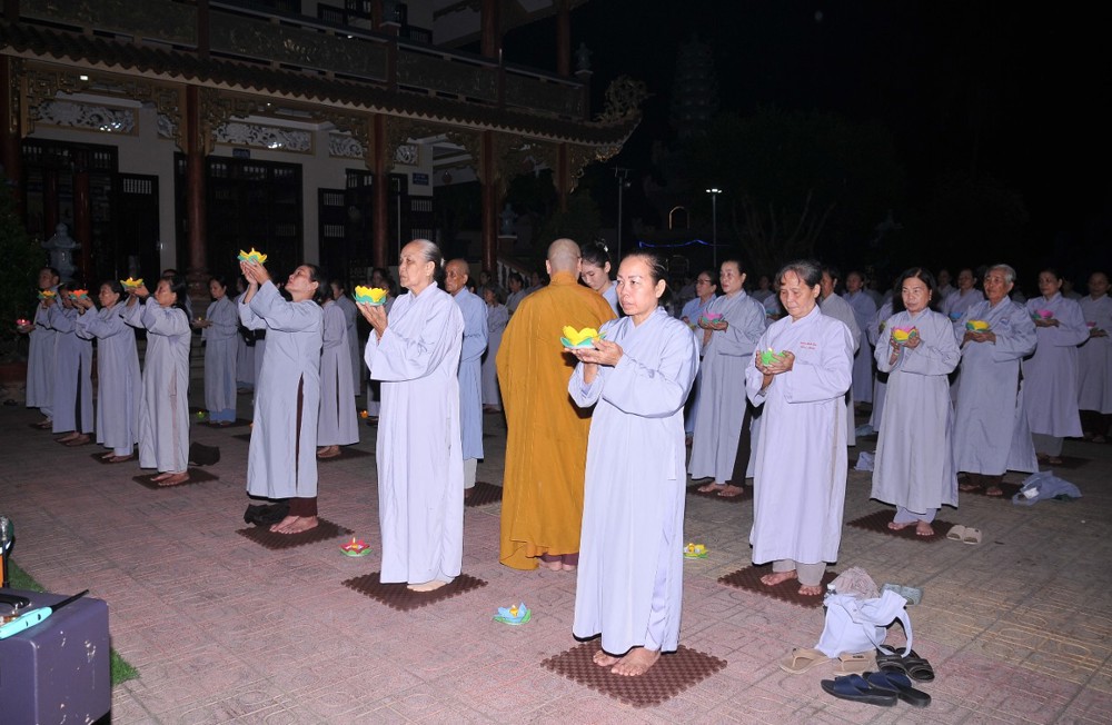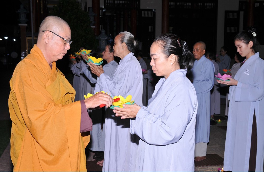 Thượng tọa nhấn mạnh: Trong bất kỳ việc gì của đời sống, con người đều cần có định hướng rõ ràng cho con đường mình đi và tương lai phía trước. Khi đã thấy rõ mục tiêu, xác định được kết quả, thì đời sống ấy sẽ có ý nghĩa, có thành tựu và viên mãn. Người học Phật, nếu xác lập được hạnh nguyện tu tập, thì con đường chứng đắc Bồ-đề quả là điều tất yếu. Quả vị Phật chính là quả vị giác ngộ. Mỗi chúng ta, không phân biệt xuất gia hay tại gia, đều sẵn đủ Bồ-đề tâm, đều có hạt giống giác ngộ nơi tự tâm mình. Ta và chư Phật vốn đồng một bản thể giác ngộ, cùng mang tự tính hoa sen thanh tịnh. Hoa sen nơi chư Phật đã rực rỡ nở bừng, còn nơi chúng ta, hoa sen ấy đang chờ được tưới tẩm bằng niềm tin, hạnh nguyện và sự hành trì miên mật (Tín – Nguyện – Hạnh). “Nguyện cho ánh sáng hoa đăng đêm nay không chỉ lung linh nơi pháp hội, mà còn được thắp sáng mãi trong tâm mỗi người con Phật, để trên từng bước đi của đời sống, chúng ta luôn nhớ về lý tưởng giác ngộ, về hạnh nguyện vãng sinh, và về con đường an lạc mà chư Phật, chư Tổ đã mở ra cho tất cả chúng sinh”.