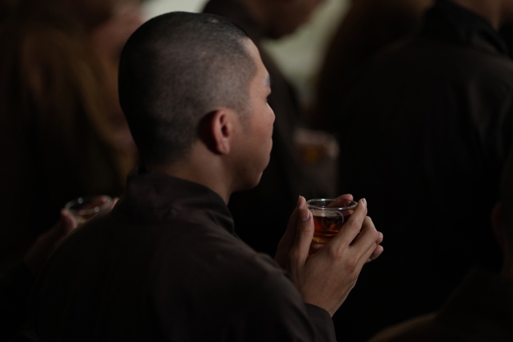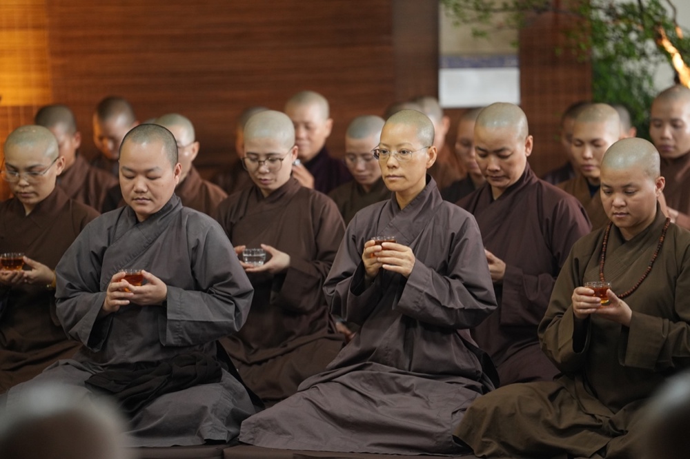 Trong suốt 5 ngày 4 đêm của khóa tu xuất sĩ, chư Tăng Ni giảng sinh đã vân tập về chùa Vạn Phúc, cùng nhau tham dự nhiều chương trình tu học và sinh hoạt ý nghĩa. Giữa dòng chảy liên tục của các thời khóa, mỗi người đều tìm thấy cho mình một “khoảng lặng” quý báu, đủ để nuôi dưỡng năng lượng và tiếp tục vững bước trên hành trình tu tập và phụng sự. Trong đó, thiền trà được xem là một pháp môn đặc biệt. Khởi nguồn từ nếp sống uống trà của Tổ tiên, thiền trà được nâng tầm thành một phương thức tu tập sâu sắc. Chén trà giờ đây không chỉ là phương tiện giao tiếp, mà trở thành chiếc “thuyền chở pháp”, đưa những lo toan, xao động trở về với thực tại nhiệm mầu.