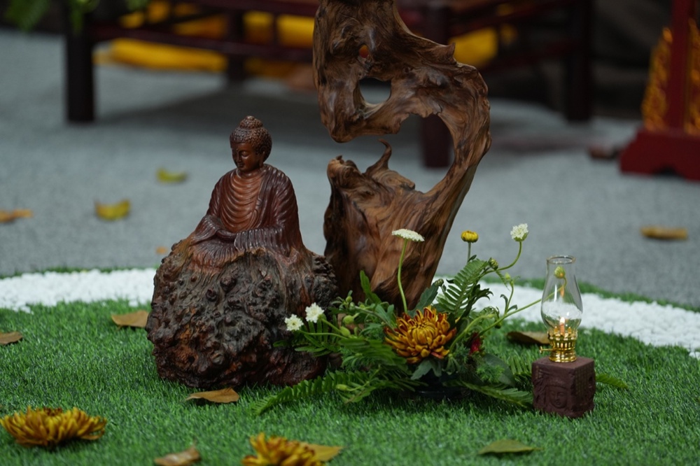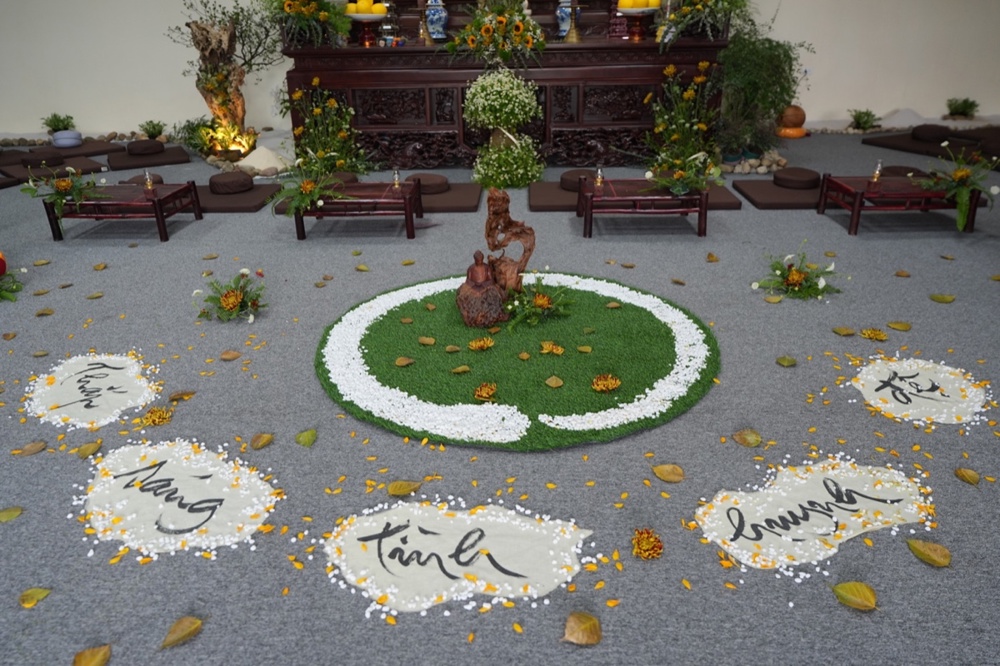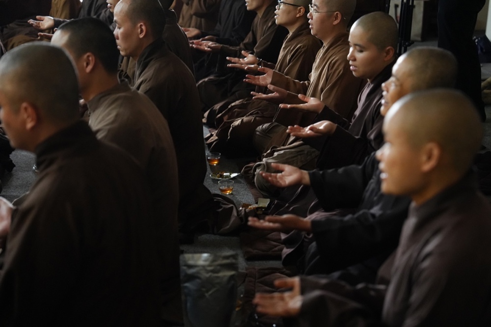 Trước khi bước vào thiền trà, đại chúng cùng ngồi yên trong tư thế kiết già, lắng nghe ba tiếng chuông ngân vang. Âm thanh ấy không chỉ đánh thức sự chú tâm, mà còn như lời nhắc nhẹ nhàng: hãy trở về với giây phút hiện tại – nơi sự sống đang nhiệm mầu hiển lộ. Trong khoảnh khắc ấy, mỗi người ý thức sâu sắc hơn về hơi thở, về sự có mặt của mình, và khởi sinh tâm niệm tri ân đối với Tam bảo, đối với cuộc đời.