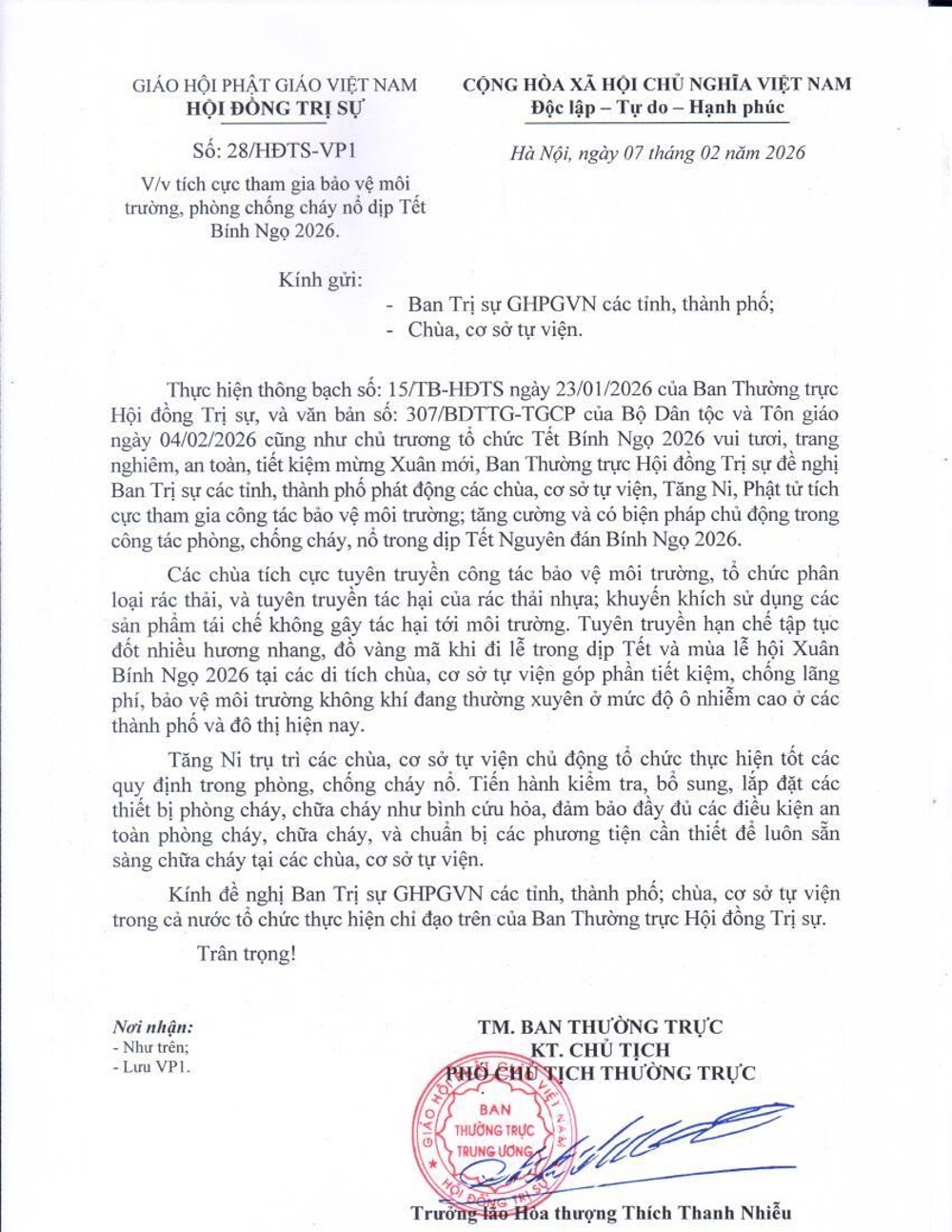 PSO - Hướng đến một mùa Xuân Bính Ngọ 2026 vui tươi, trang nghiêm, an toàn và tiết kiệm, Ban Thường trực Hội đồng Trị sự GHPGVN đã ban hành Công văn số 28/HĐTS-VP1, kêu gọi Ban Trị sự GHPGVN các tỉnh, thành phố cùng toàn thể chư Tăng Ni, Phật tử tích cực tham gia công tác bảo vệ môi trường và chủ động phòng, chống cháy nổ trong dịp Tết Nguyên đán.