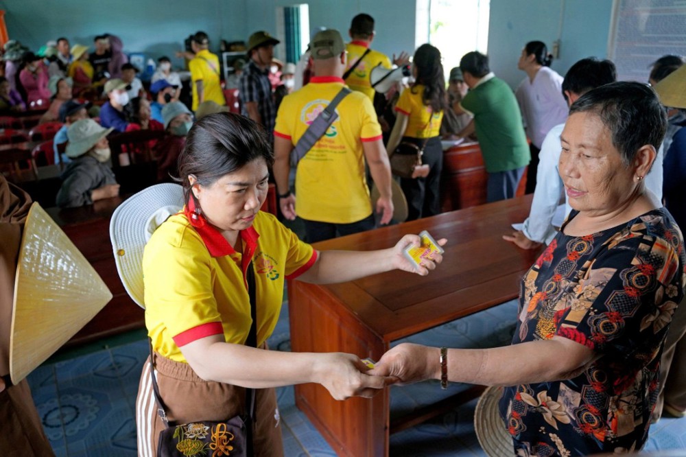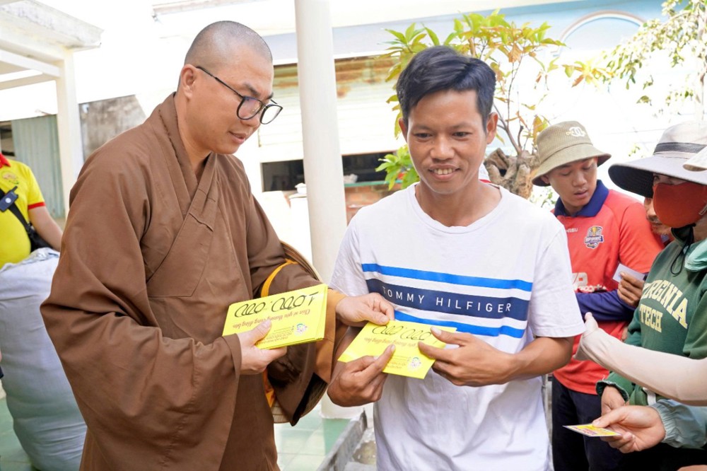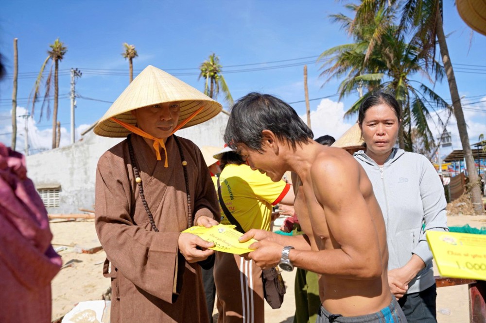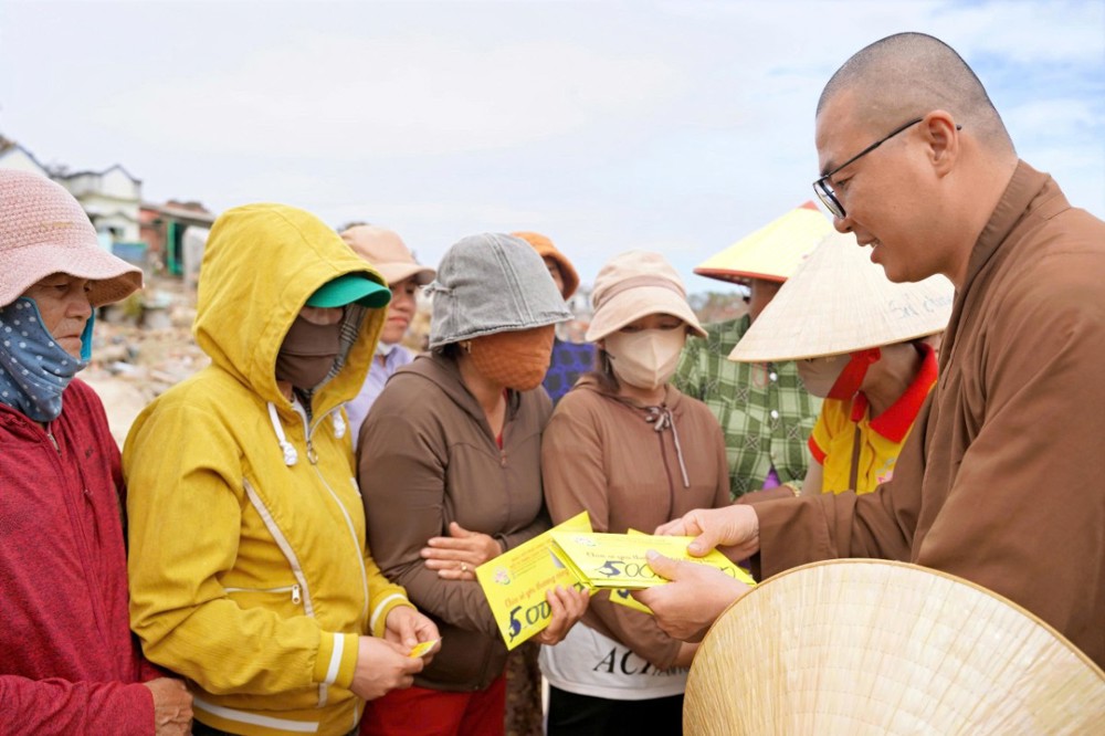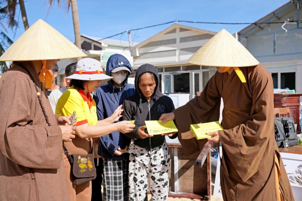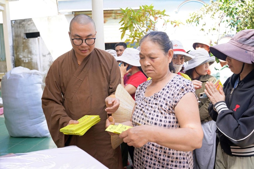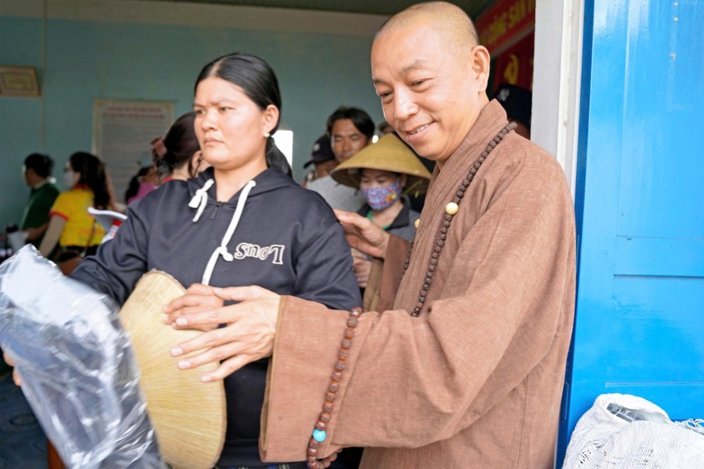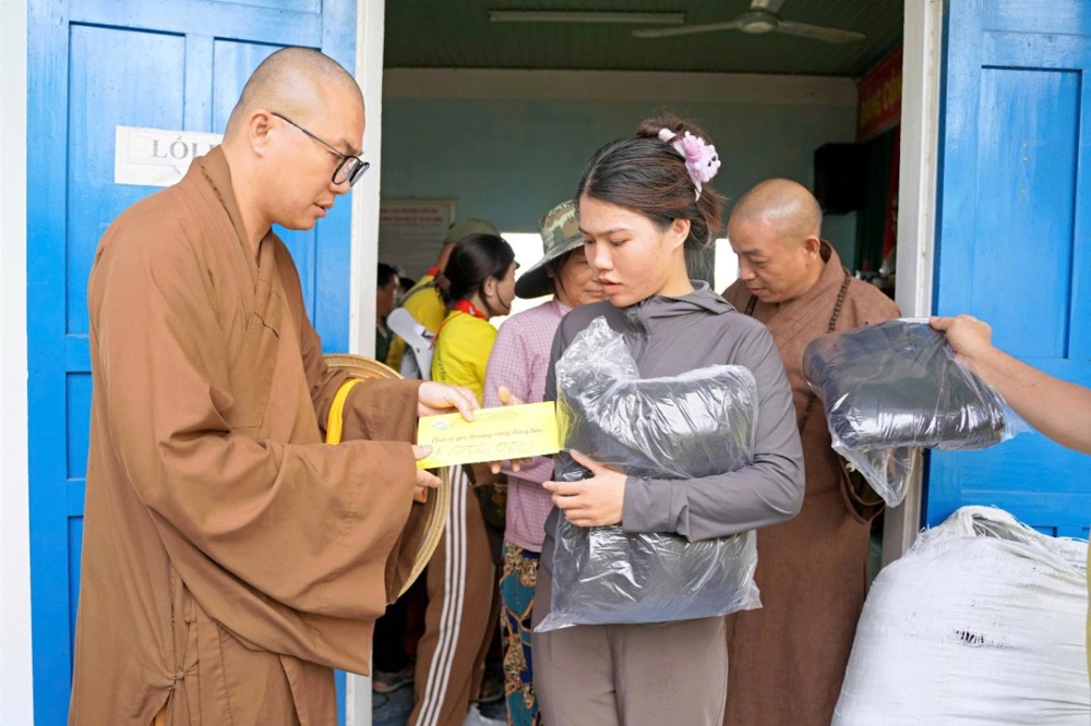 Tại buổi trao quà, Thượng tọa Thích Minh Phú đã ân cần thăm hỏi, động viên bà con sớm vượt qua khó khăn, ổn định cuộc sống. Đoàn đã trao tịnh tài hỗ trợ cho 10 hộ bị sập nhà hoàn toàn (mỗi hộ 5 triệu đồng), 30 hộ hư hỏng nặng (mỗi hộ 2 triệu đồng) và 124 hộ bị thiệt hại kinh tế (mỗi hộ 1 triệu đồng) cùng chăn đắp, với tổng kinh phí 250 triệu đồng.