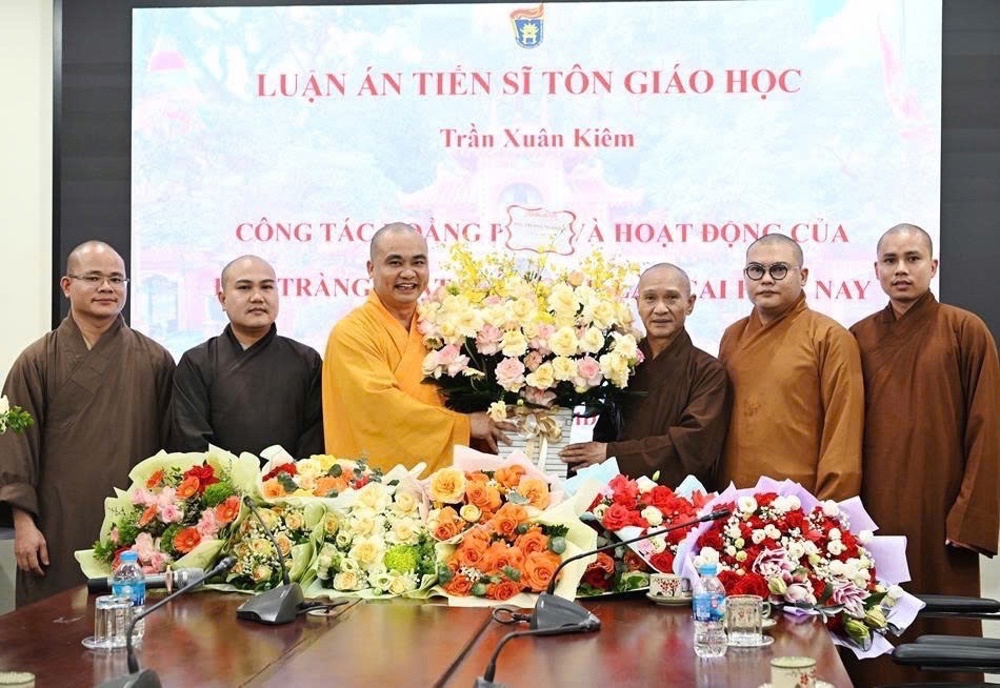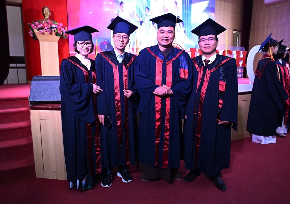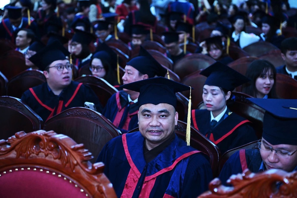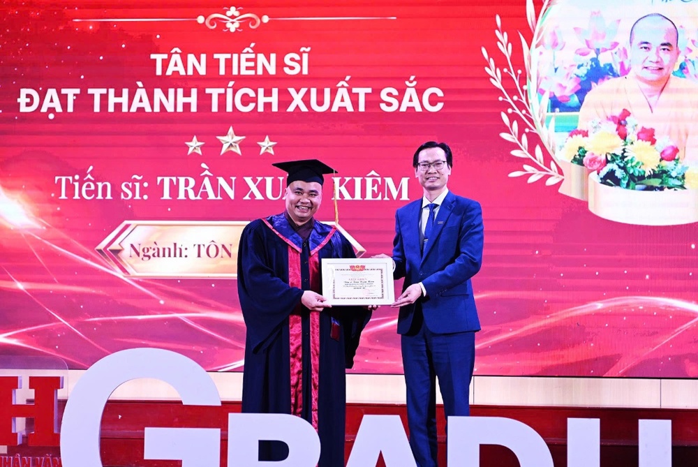 Điểm nhấn đặc biệt của buổi lễ là phần vinh danh 05 tân Tiến sĩ có thành tích học tập và nghiên cứu xuất sắc nhất. Trong số đó, Đại đức Thích Chân Định (Thế danh Trần Xuân Kiêm), Ủy viên Thường trực Ban Hướng dẫn Phật tử T.Ư, Phó Thường trực Phân ban Phật tử Dân tộc đặc trách phía Bắc, Trưởng ban Hướng dẫn Phật tử tỉnh Lào Cai đã bảo vệ thành công luận án Tiến sĩ chuyên ngành Tôn giáo học, nay vinh dự đón nhận bằng Tiến sĩ cùng Giấy khen của Hiệu trưởng Nhà trường. Thành quả này không chỉ là kết quả sau nhiều năm miệt mài nghiên cứu của cá nhân Đại đức, mà còn là niềm tự hào, nguồn khích lệ lớn lao đối với Ban Trị sự GHPGVN tỉnh Lào Cai trên phương diện nâng cao trình độ tri thức của tăng đoàn.