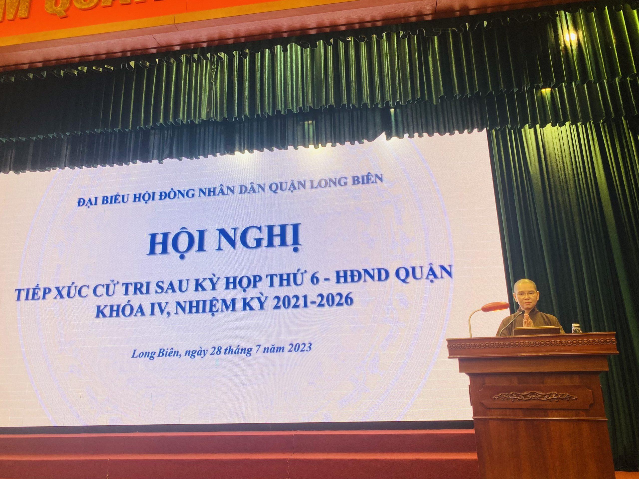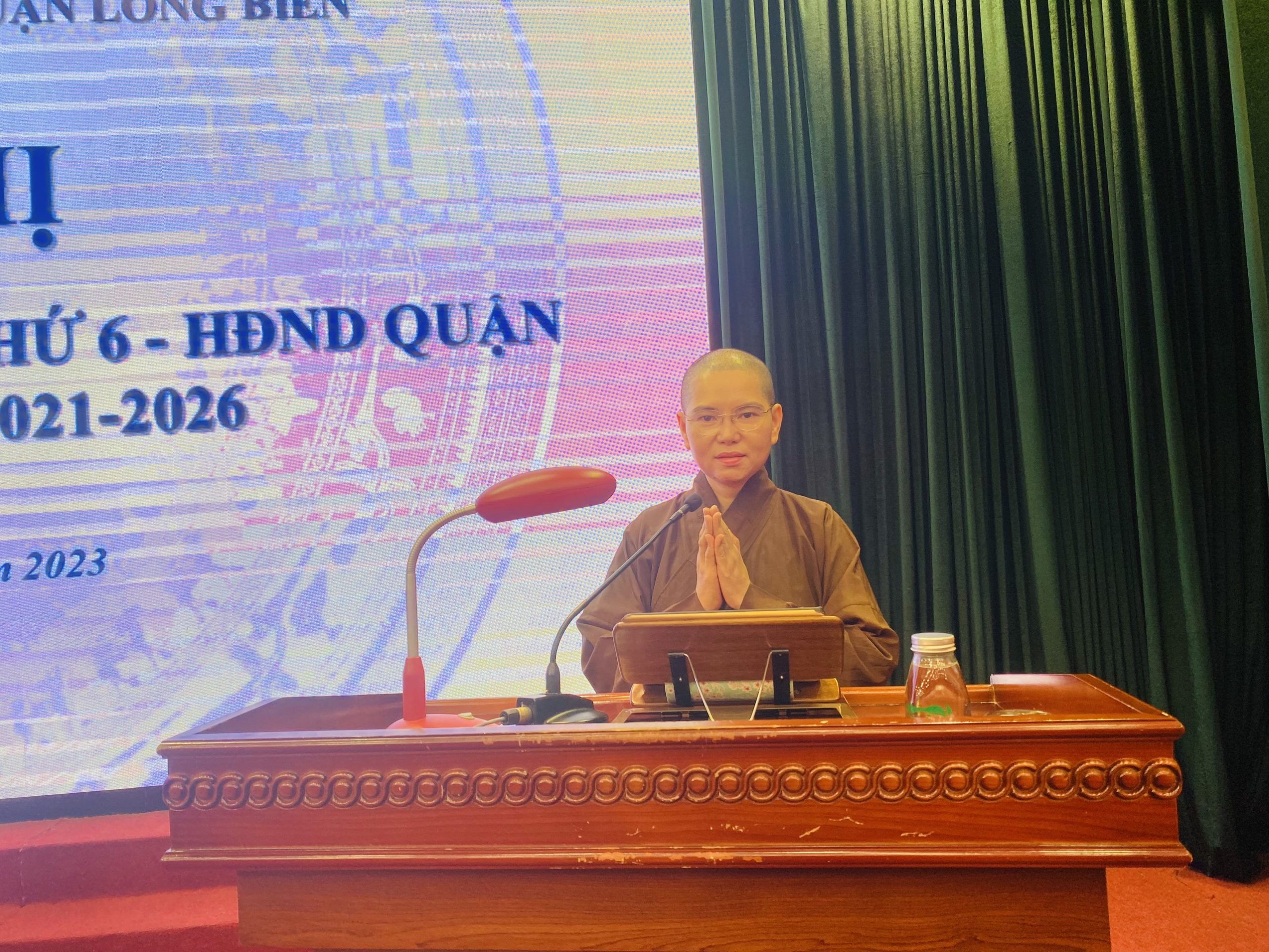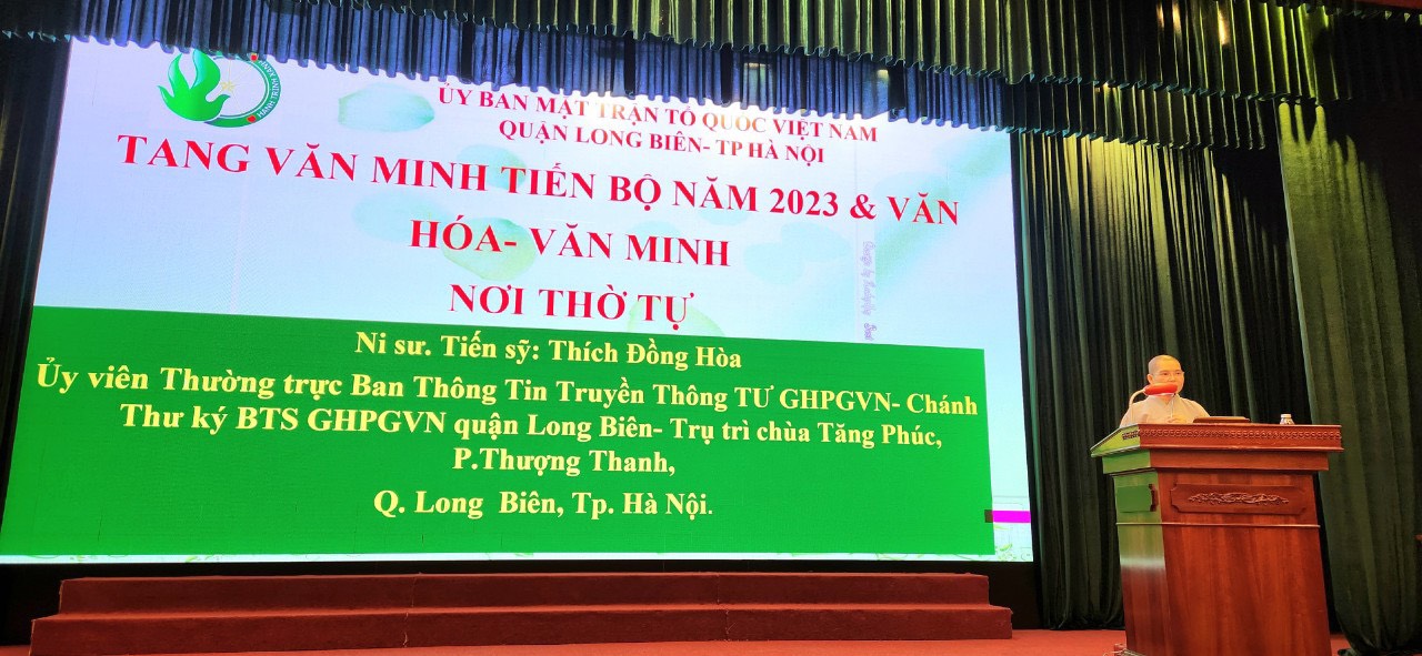 PSO - Chiều ngày 28/7/2023 nhận lời mời của Lãnh đạo quận Long Biên, TP. Hà Nội. Ni sư Thích Đồng Hòa - Ủy viên Thường trực Ban Thông tin truyền thông TƯ GHPGVN, Ủy viên Ban Hoằng pháp TƯ GHPGVN, Chánh Thư ký BTS GHPGVN quận Long Biên, Uỷ viên Thường trực UBMTTQ Việt Nam quận Long Biên đã đến chia sẻ chủ đề “Tang văn minh tiến bộ và Văn hóa văn minh nơi thờ tự năm 2023” tại Hội trường liên cơ quan quận Long Biên, số 03 Sư Vạn Hạnh, khu đô thị Việt Hưng, phường Việt Hưng, quận Long Biên, TP. Hà Nội.