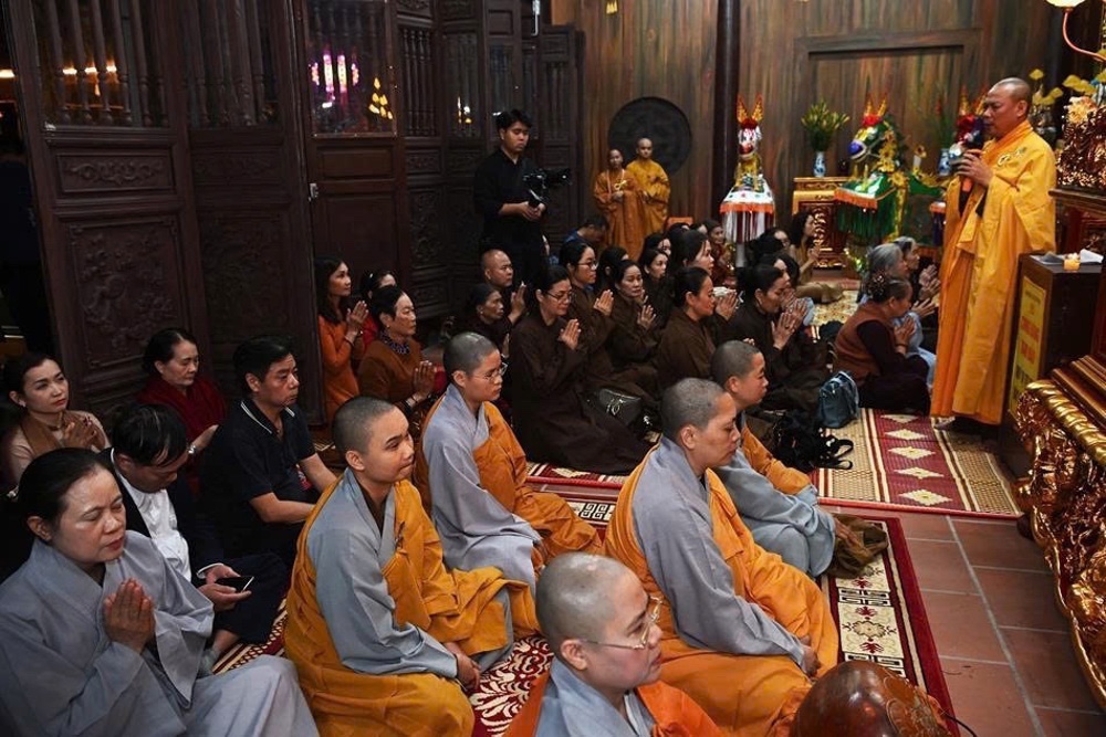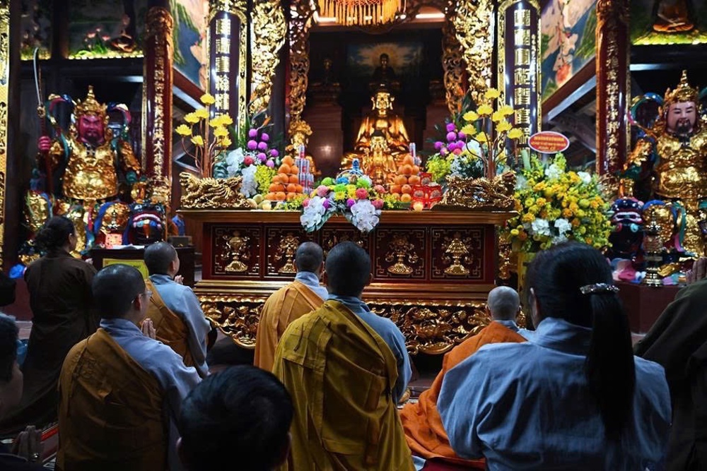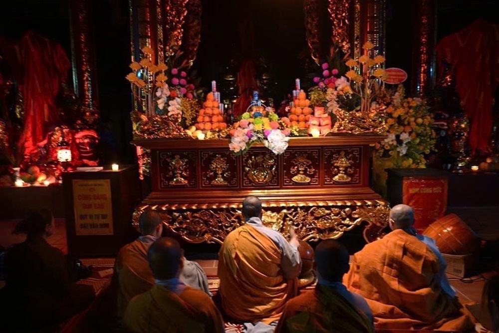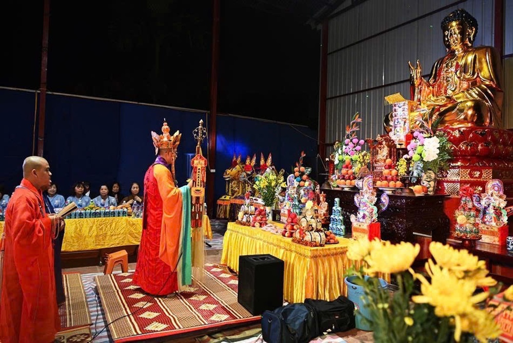 Sau nghi lễ trì chú, sái tịnh, chư tôn đức Tăng Ni và các vị đại biểu niêm hương lễ Phật tại chính Điện và dự lễ đàn mông sơn thí thực trong không khí trang nghiêm thanh tịnh.