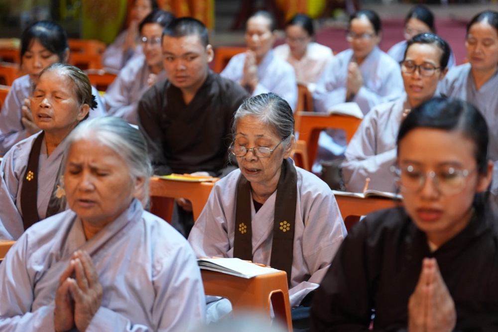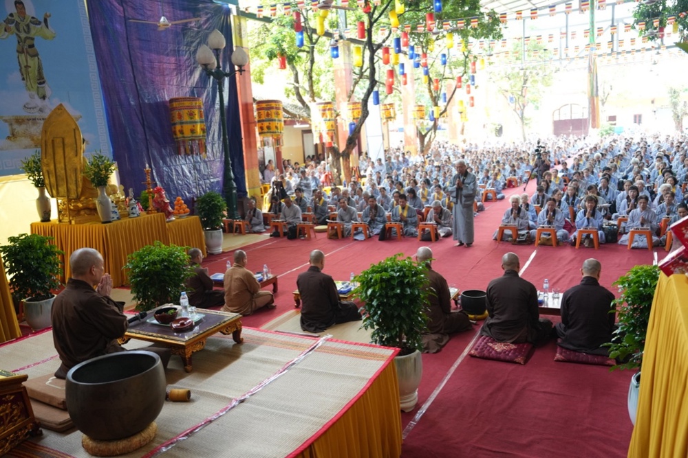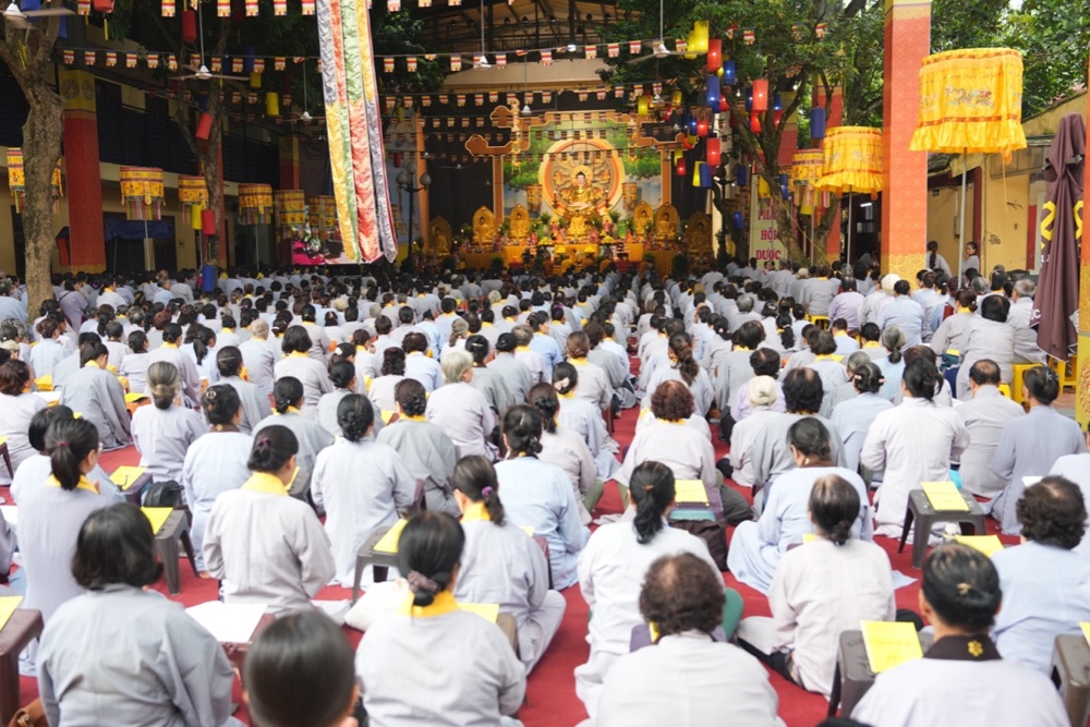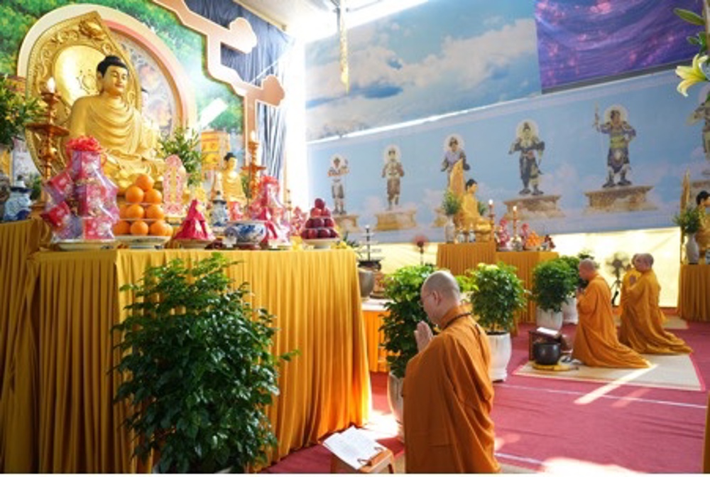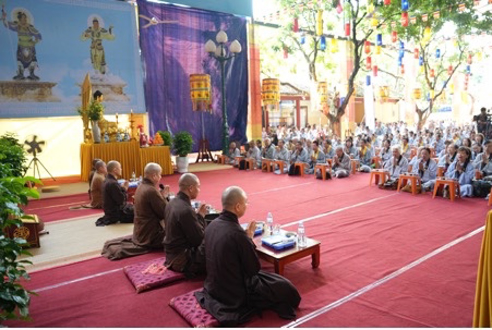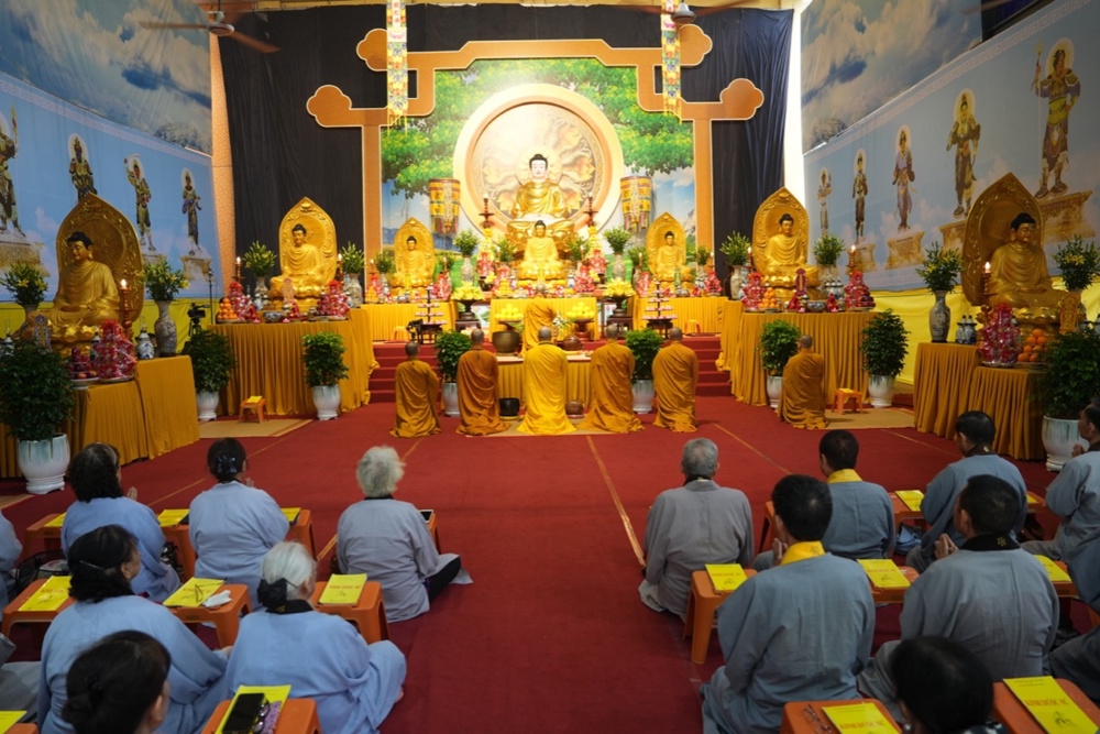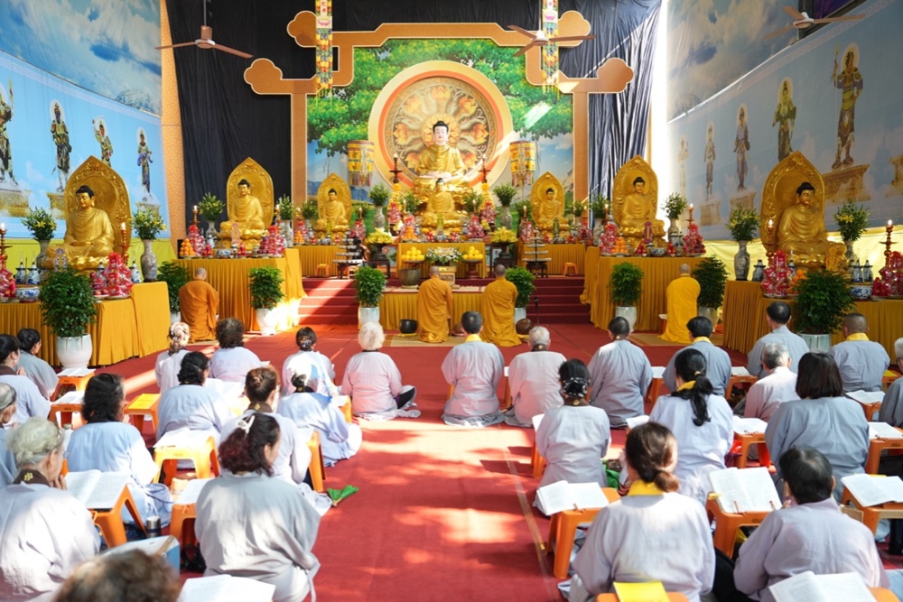 Buổi trưa, dưới sự hướng dẫn của Hòa thượng trụ trì cùng chư Tôn đức, đại chúng thực hiện nghi thức Cúng Ngọ, dùng cơm chay trong chính niệm và lòng biết ơn.