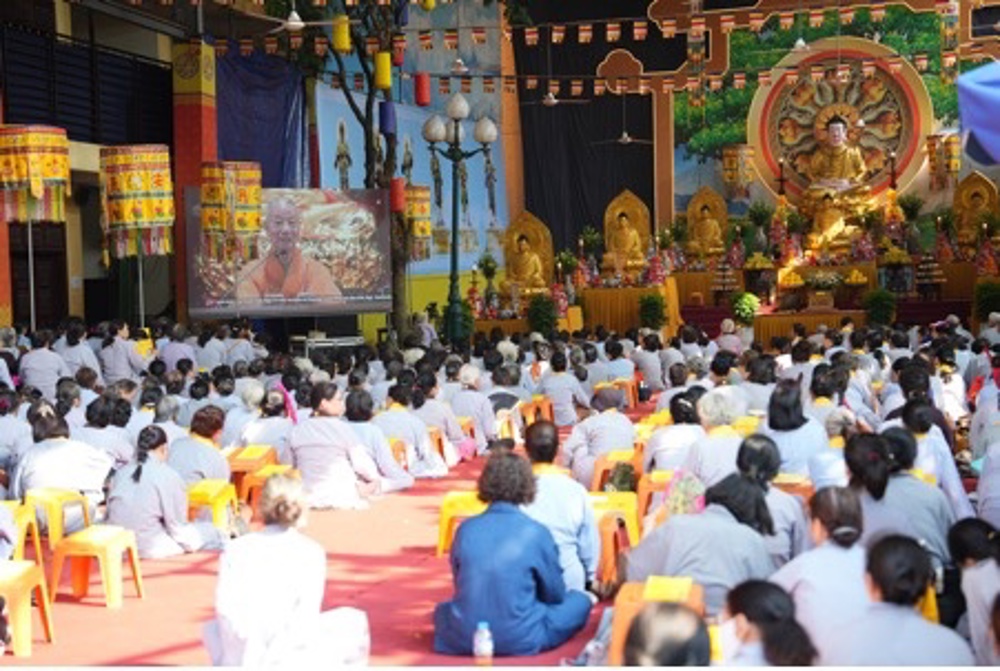 Chiều cùng ngày, toàn thể đại chúng trang nghiêm lắng nghe thời pháp trực tuyến do Hòa thượng Tôn sư thuyết giảng với chủ đề “ Cầu nguyện như thế nào để không rơi vào mê tín – Ý nghĩa Kinh Dược Sư.”