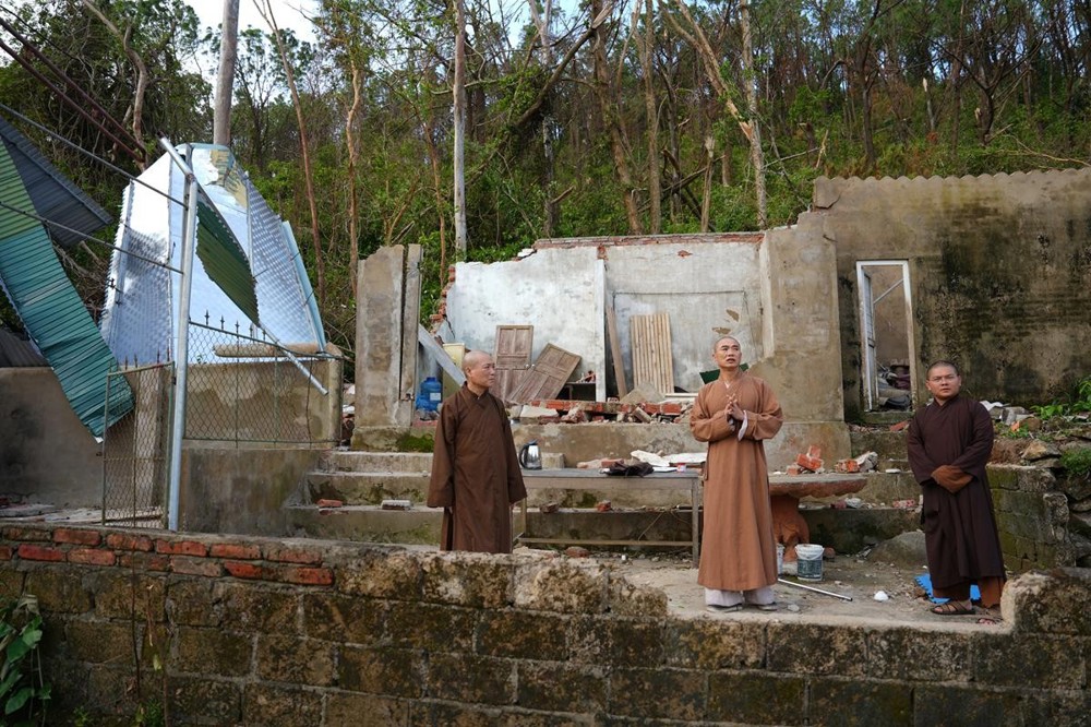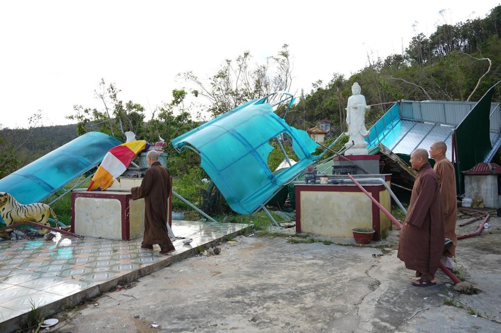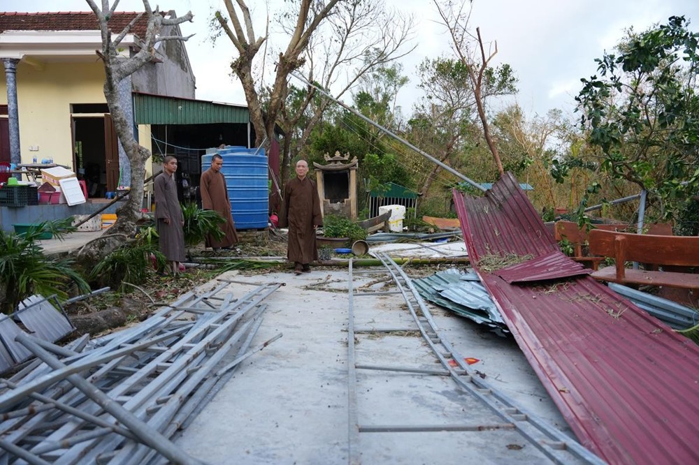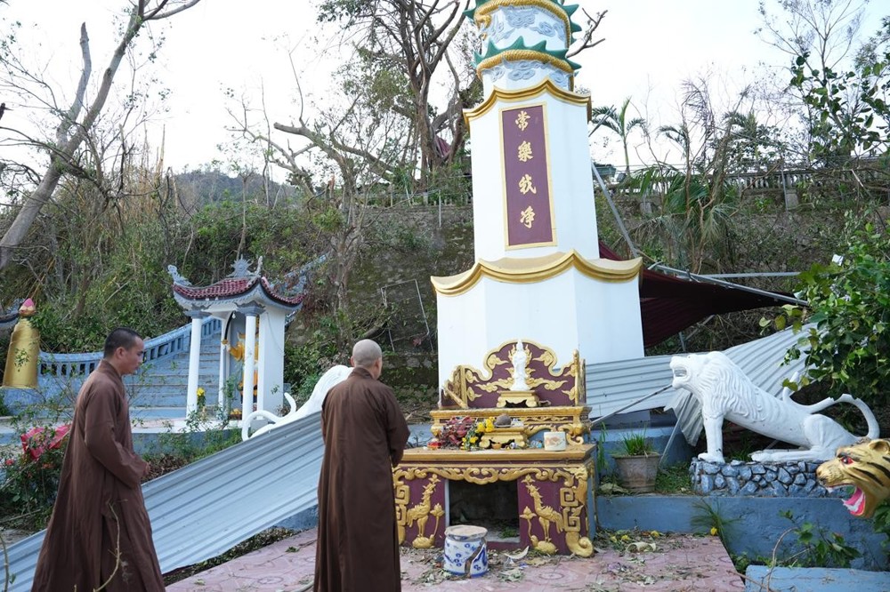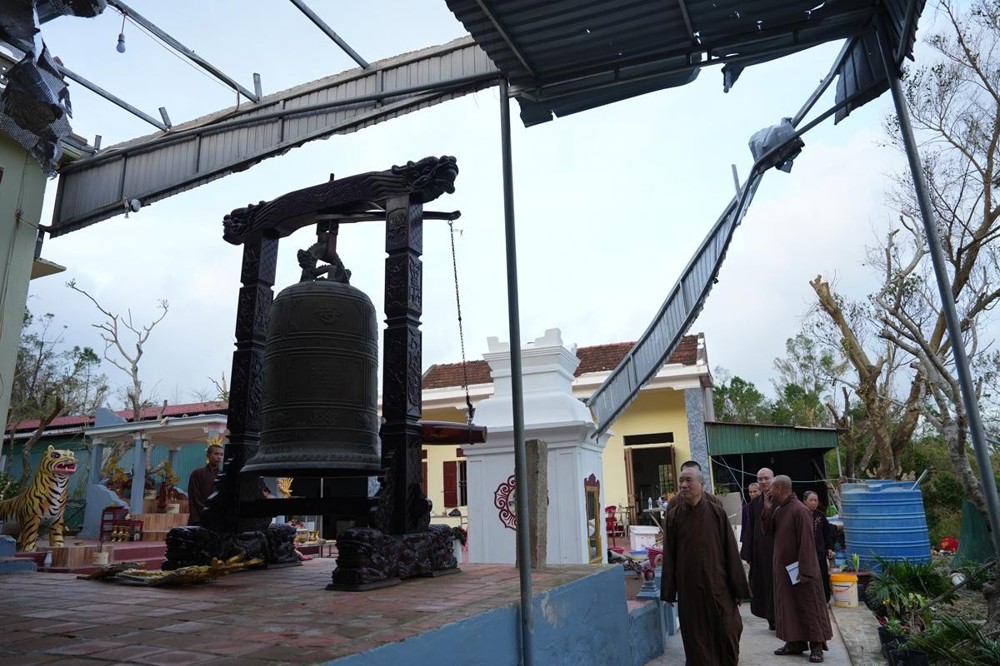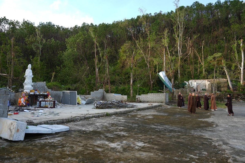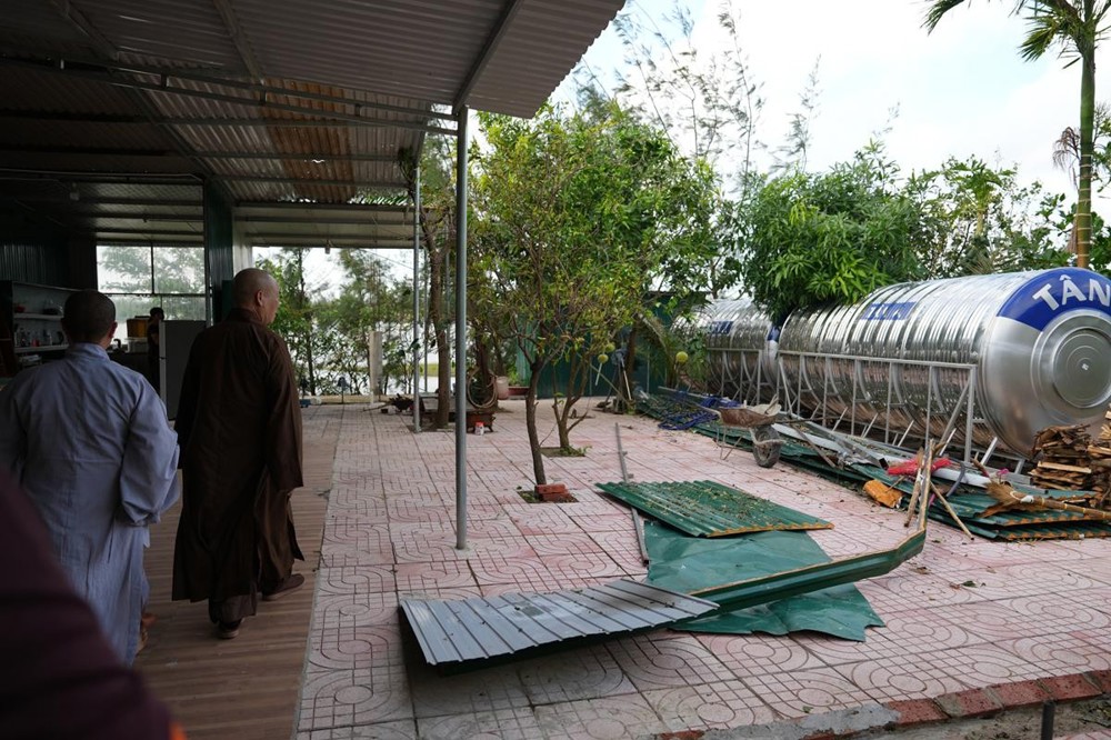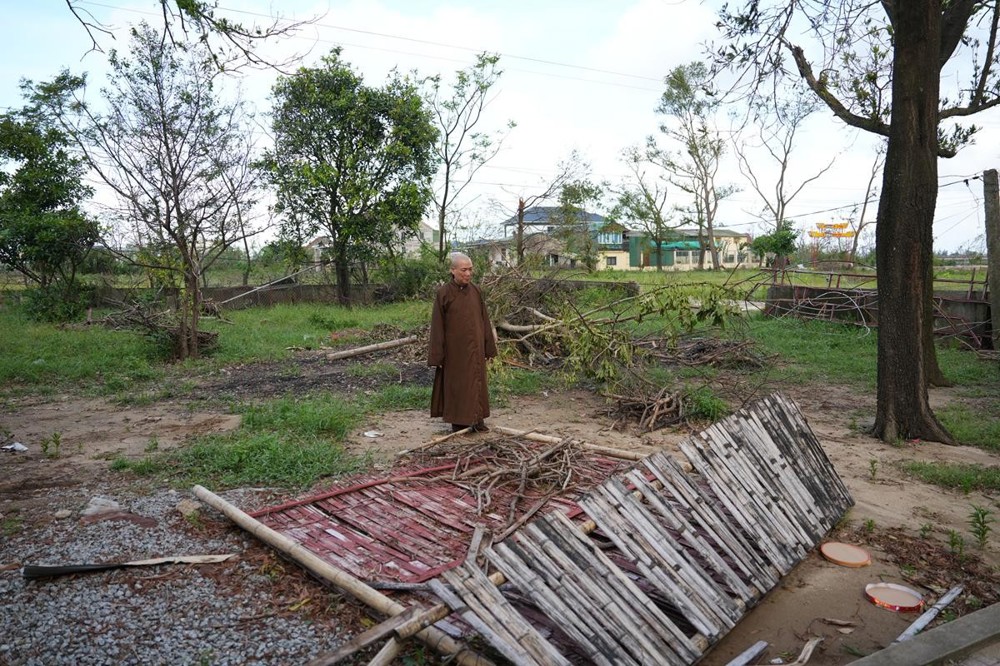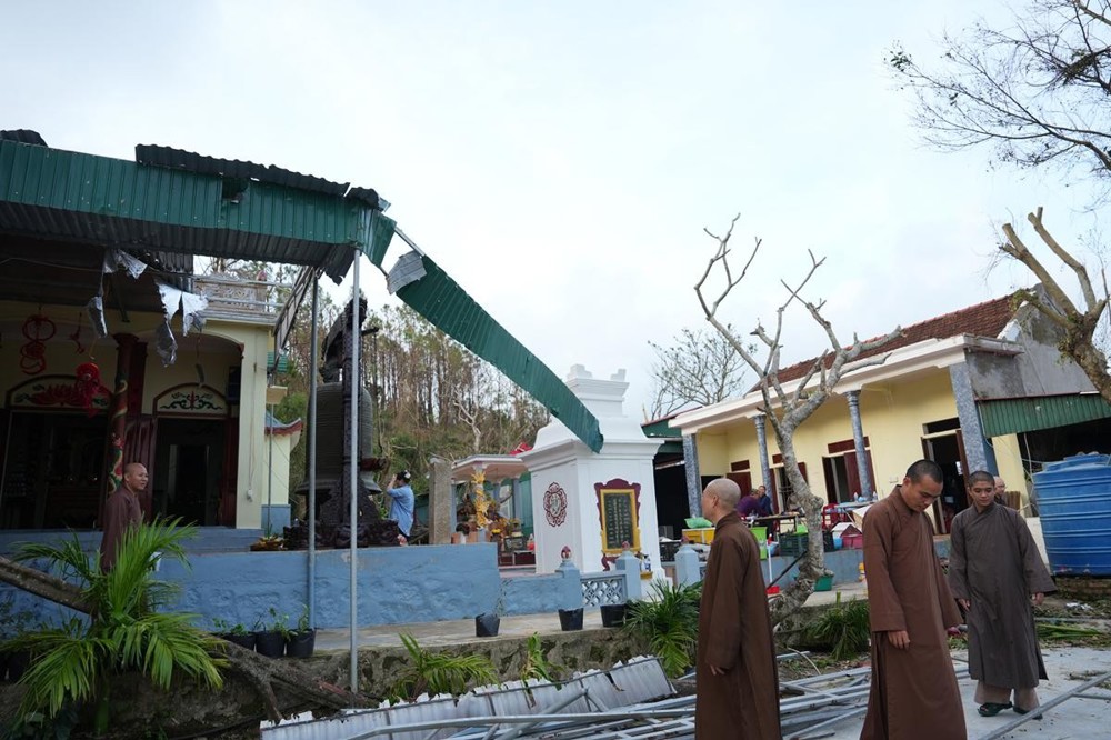 Cơn bão đi qua, để lại sau lưng nó là cảnh tượng tan hoang: mái chùa tốc ngói, gạch đá ngổn ngang; những pho tượng Phật nghiêng ngả, nứt vỡ; những quyển kinh, tập sách bị ướt sũng, phải phơi rải rác khắp sân; hoa viên vốn thanh tịnh nay chỉ còn lại bùn đất và cành cây gãy đổ. Đứng trước cảnh chùa tan hoang, ai cũng nghẹn ngào, xót xa. Chùa vốn là mái nhà tâm linh, là nơi nương tựa tinh thần cho bà con Phật tử, nay cũng chung cảnh ngộ “mái xiêu, vách nát” cùng dân lành.