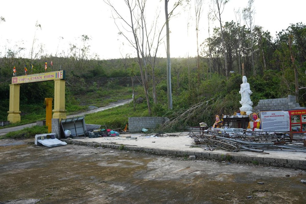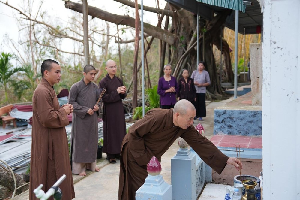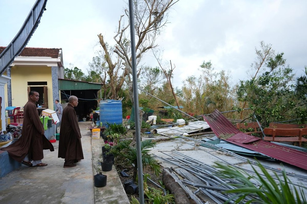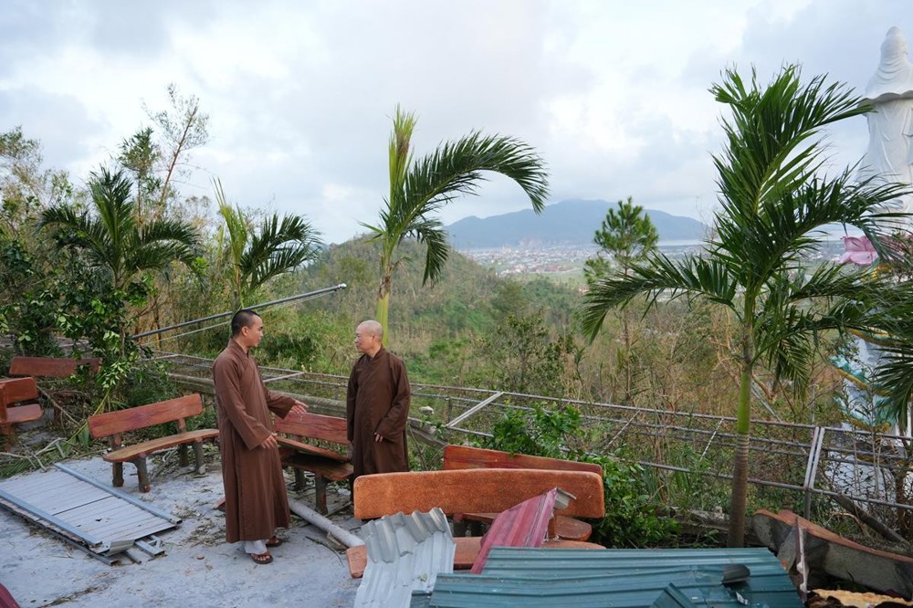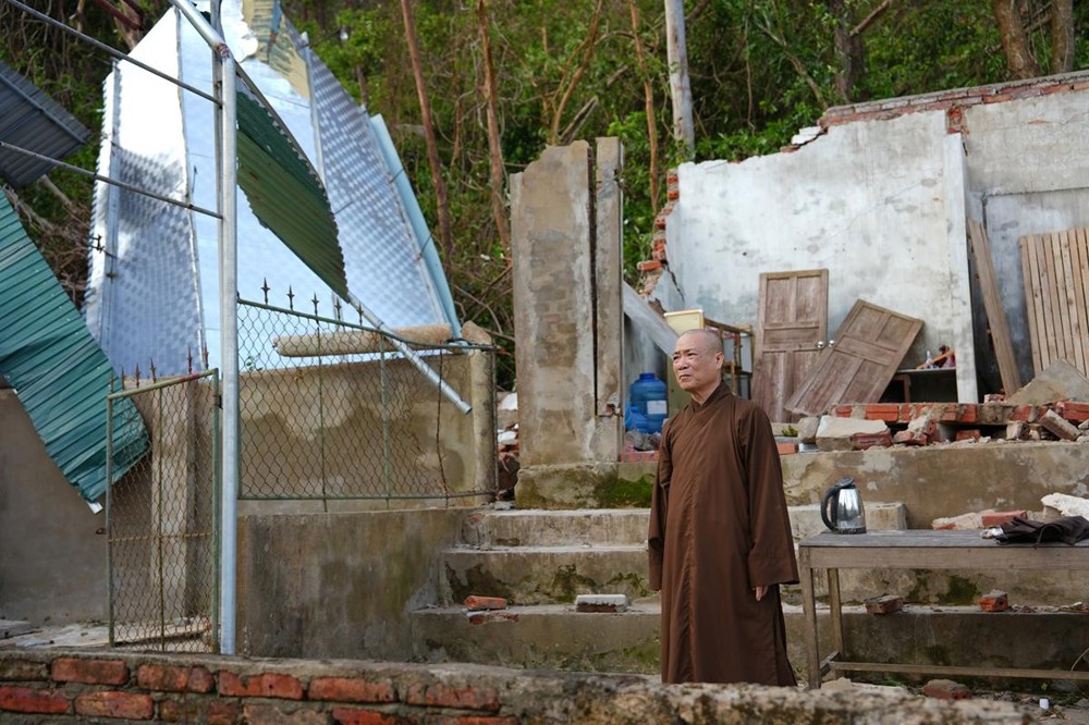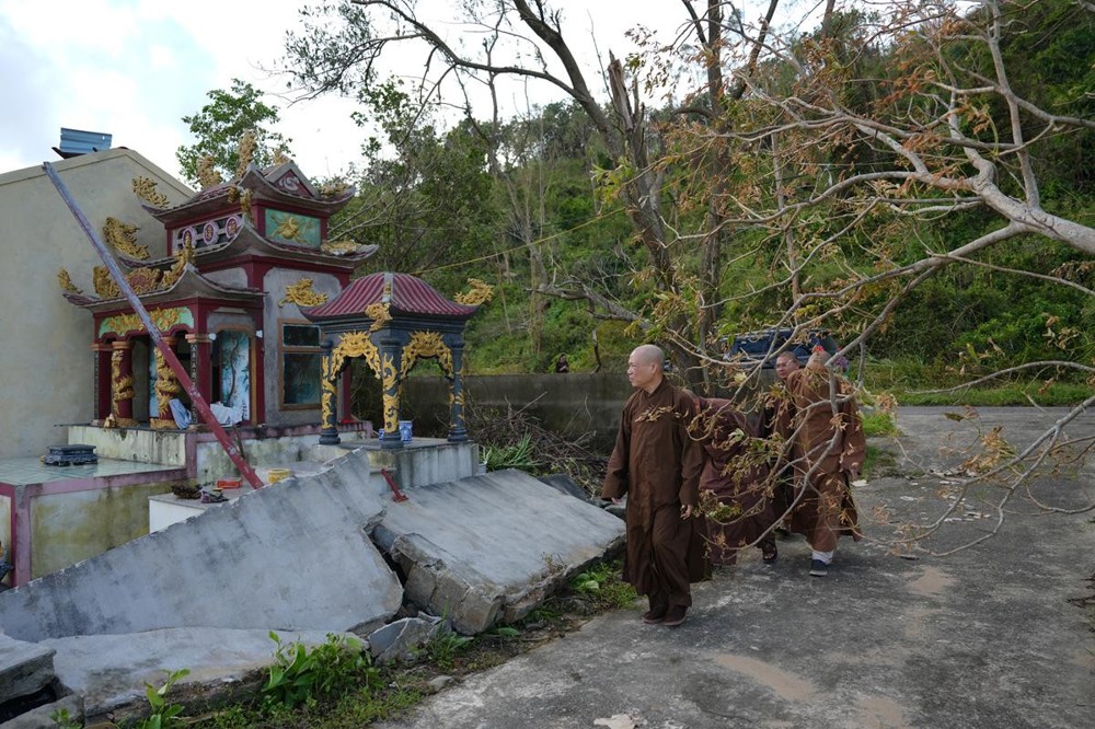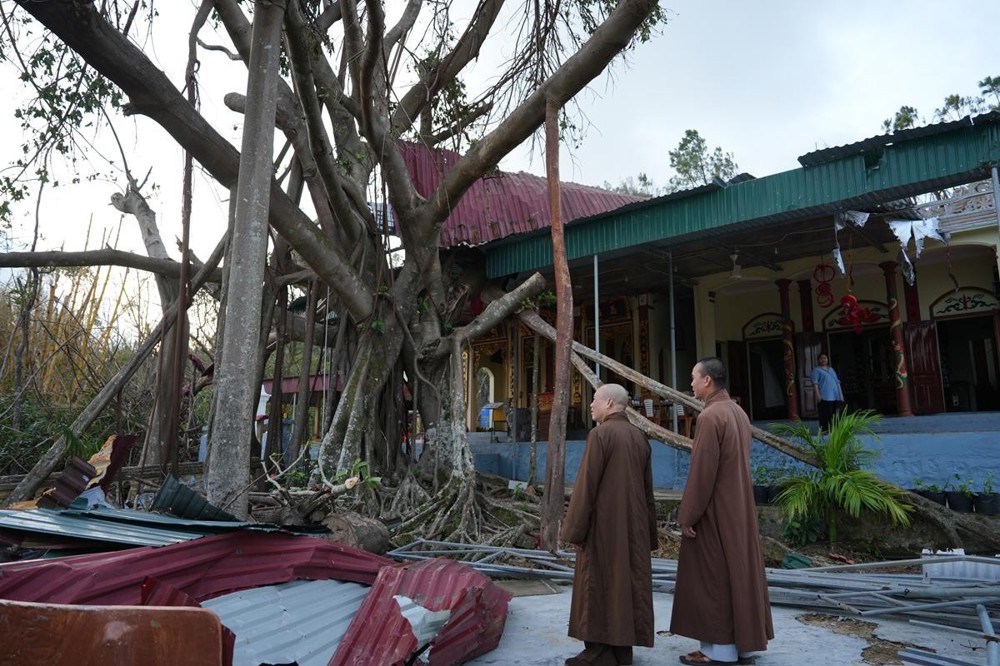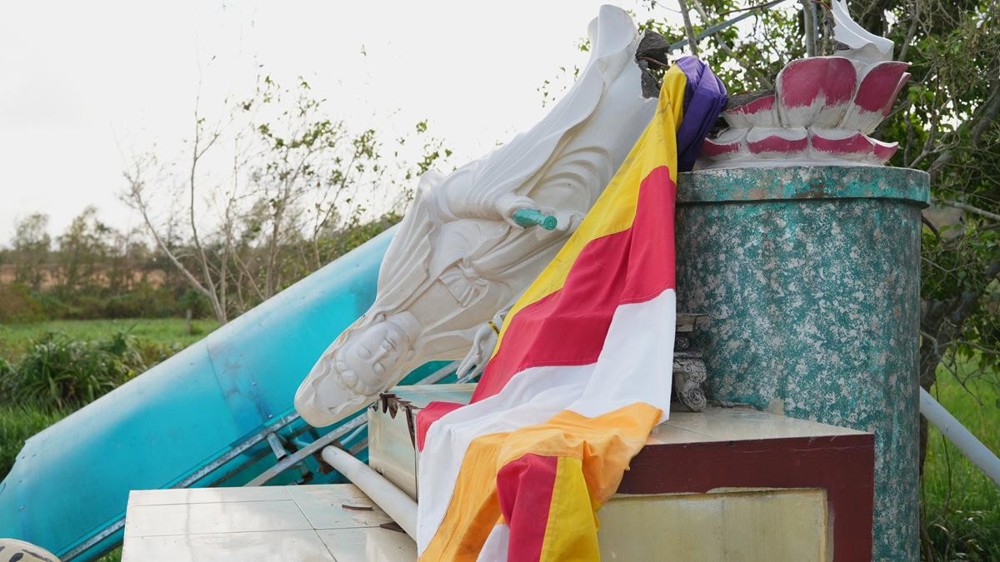 Cơn bão đi qua, để lại sau lưng nó là cảnh tượng tan hoang: mái chùa tốc ngói, gạch đá ngổn ngang; những pho tượng Phật nghiêng ngả, nứt vỡ; những quyển kinh, tập sách bị ướt sũng, phải phơi rải rác khắp sân; hoa viên vốn thanh tịnh nay chỉ còn lại bùn đất và cành cây gãy đổ. Đứng trước cảnh chùa tan hoang, ai cũng nghẹn ngào, xót xa. Chùa vốn là mái nhà tâm linh, là nơi nương tựa tinh thần cho bà con Phật tử, nay cũng chung cảnh ngộ “mái xiêu, vách nát” cùng dân lành.