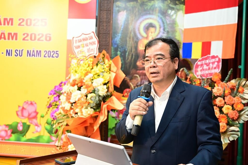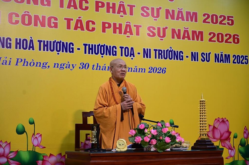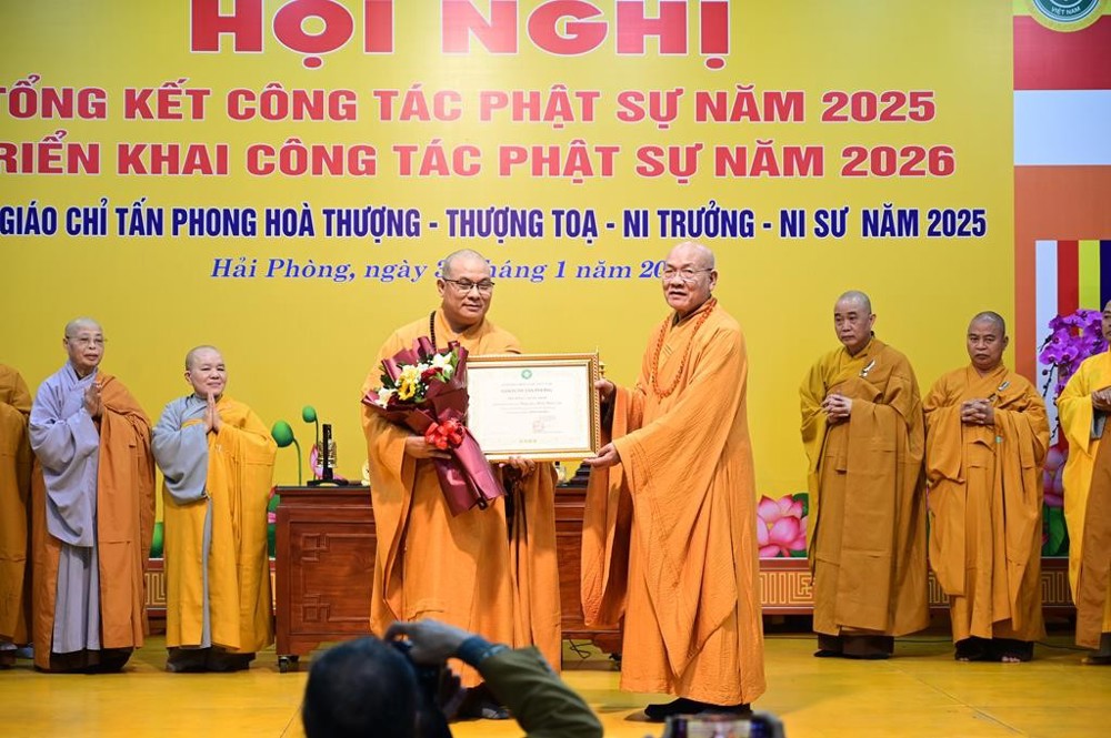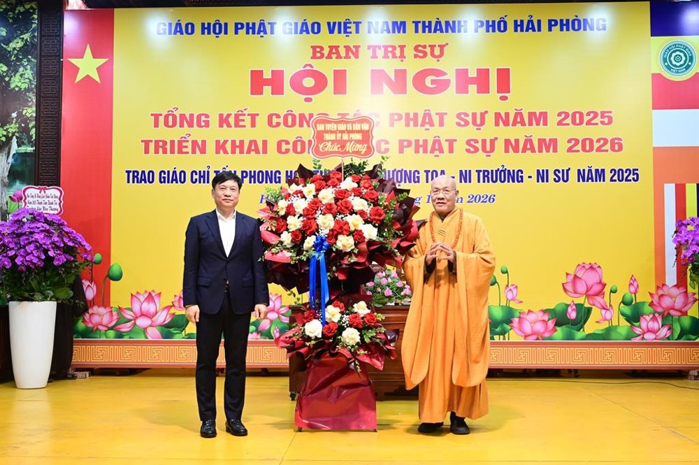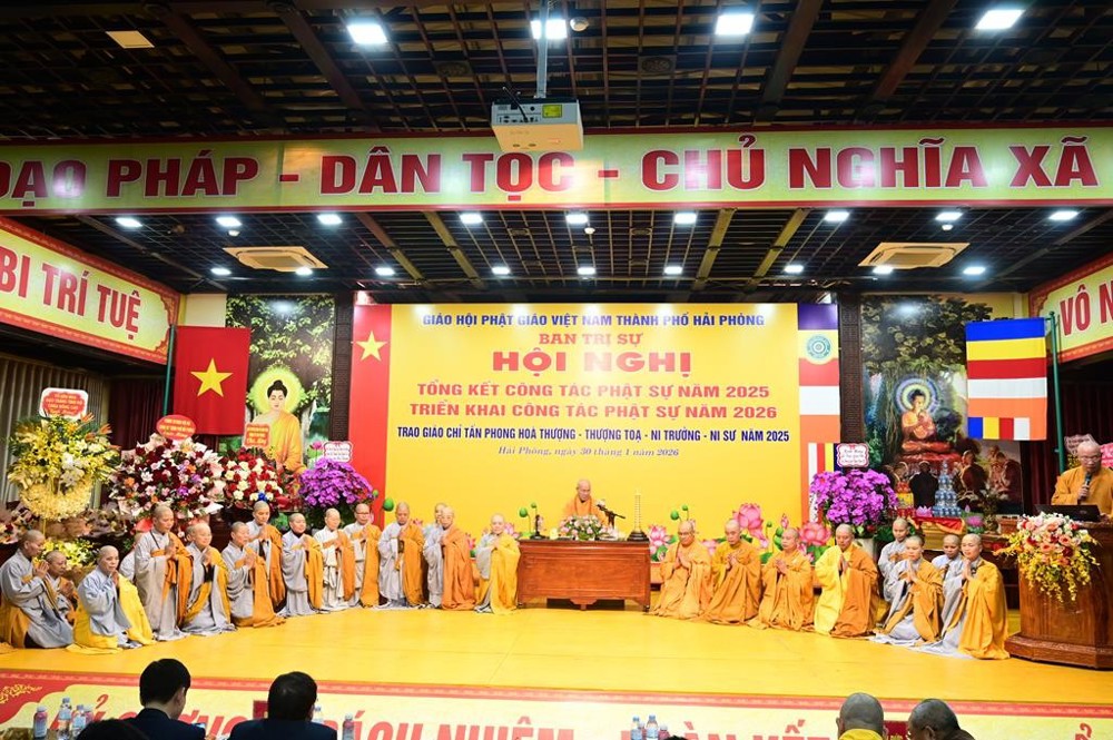 PSO - Chiều ngày 30/01/2026 (nhằm ngày 12 tháng Chạp năm Ất Tỵ), tại chùa Nam Hải (Trụ sở Ban Trị sự GHPGVN thành phố Hải Phòng), số 197 phố Hai Bà Trưng, phường Lê Chân, thành phố Hải Phòng, đã long trọng diễn ra Hội nghị tổng kết công tác Phật sự năm 2025, đề ra phương hướng hoạt động năm 2026 và trao giáo chỉ tấn phong hàng giáo phẩm Hòa thượng, Thượng tọa, Ni trưởng, Ni sư cho chư Tôn đức Tăng Ni trong thành phố.